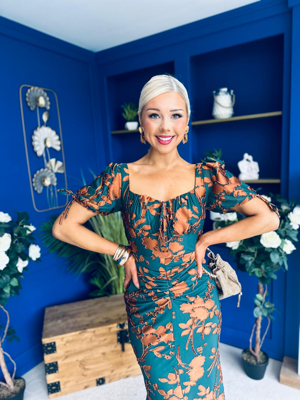 Dove Ruched Detail Midi Dress In Emerald Floral