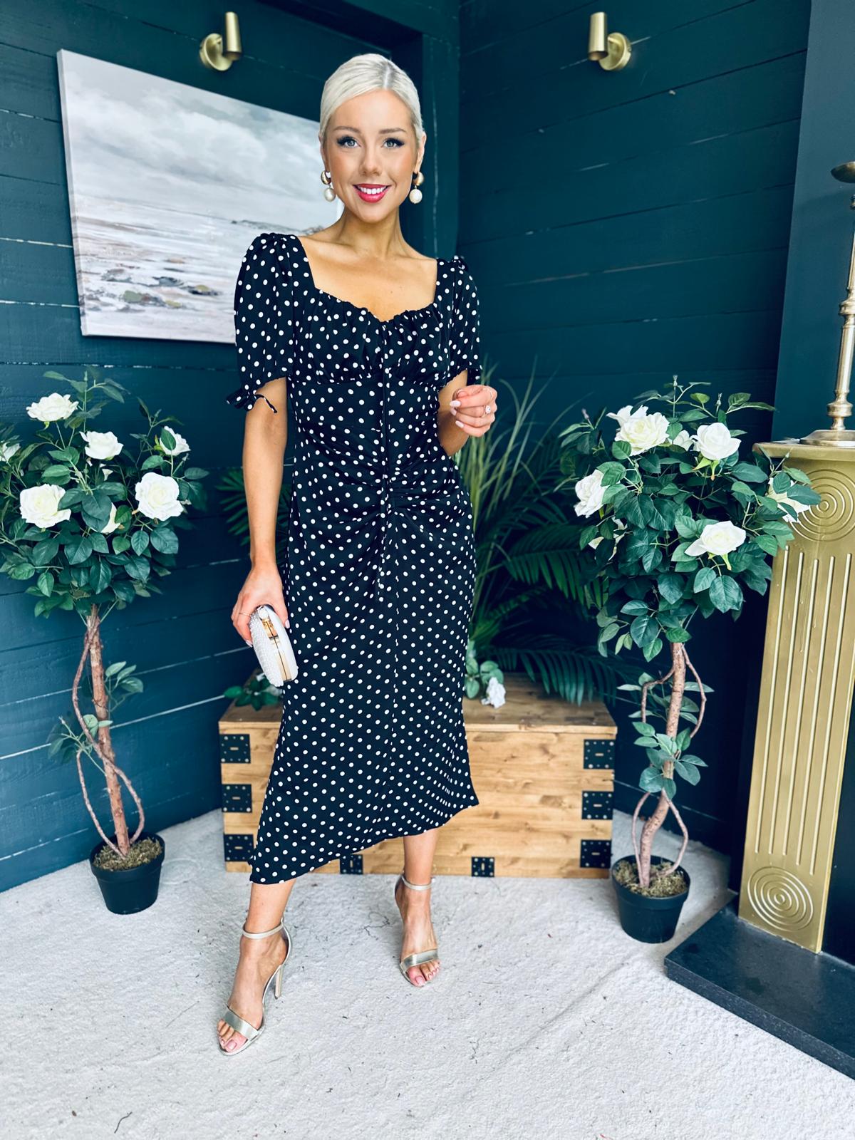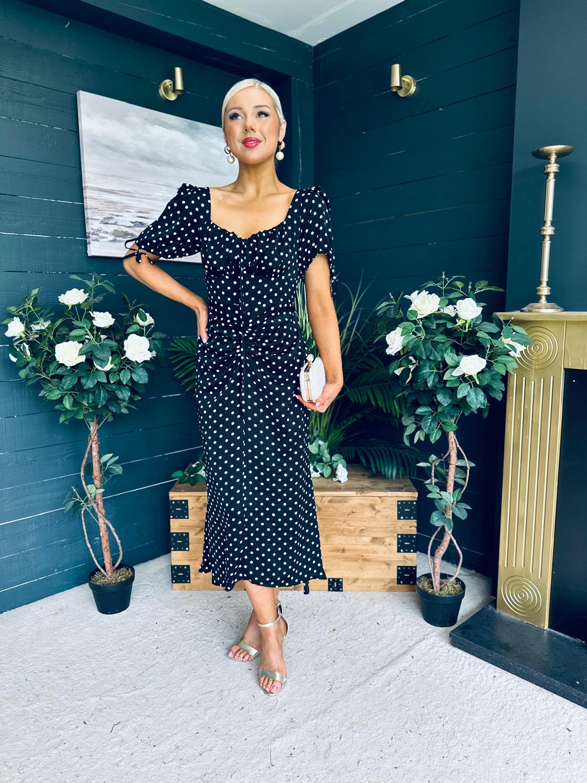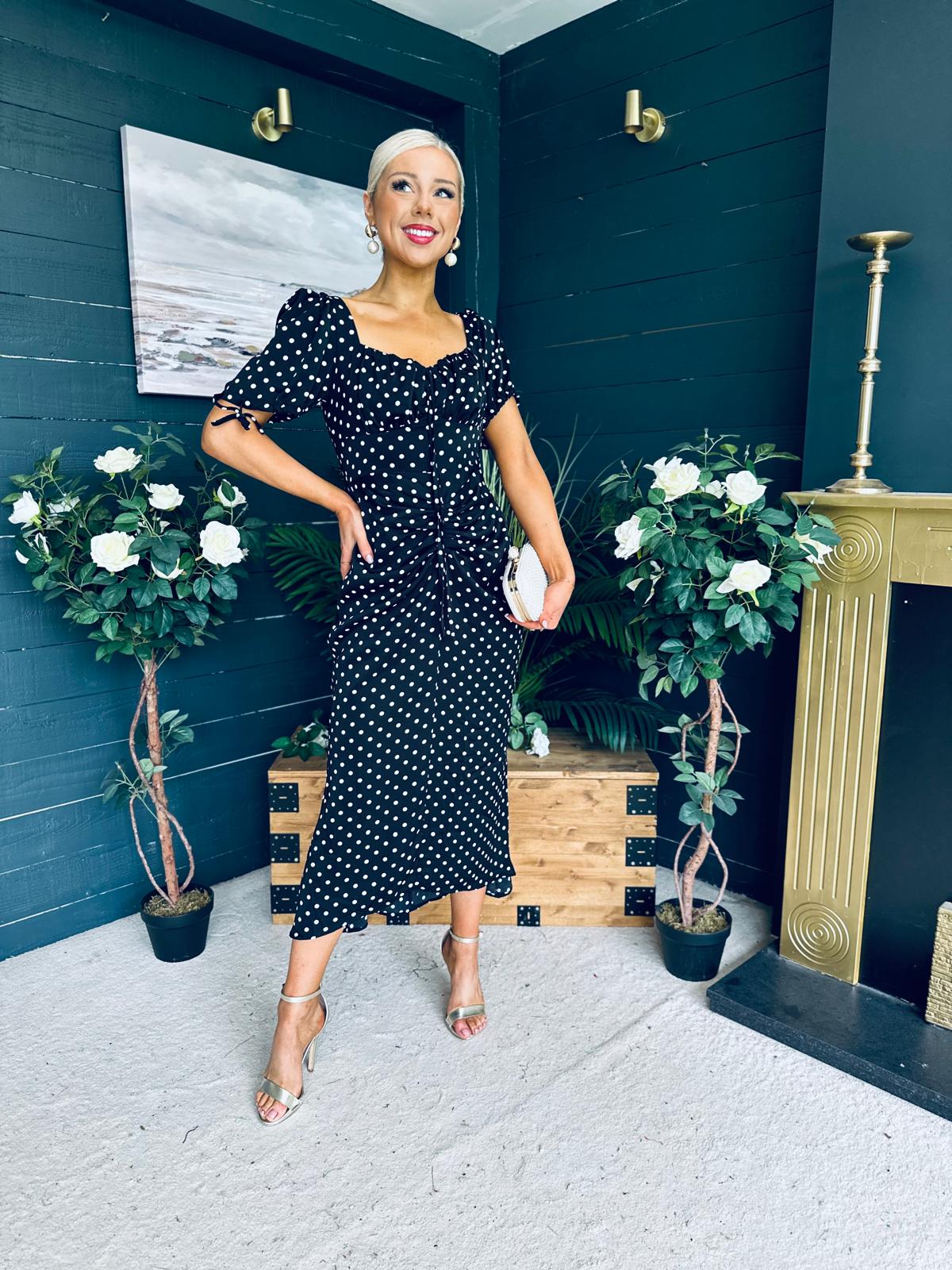 Dove Ruched Detail Midi Dress Polka Black