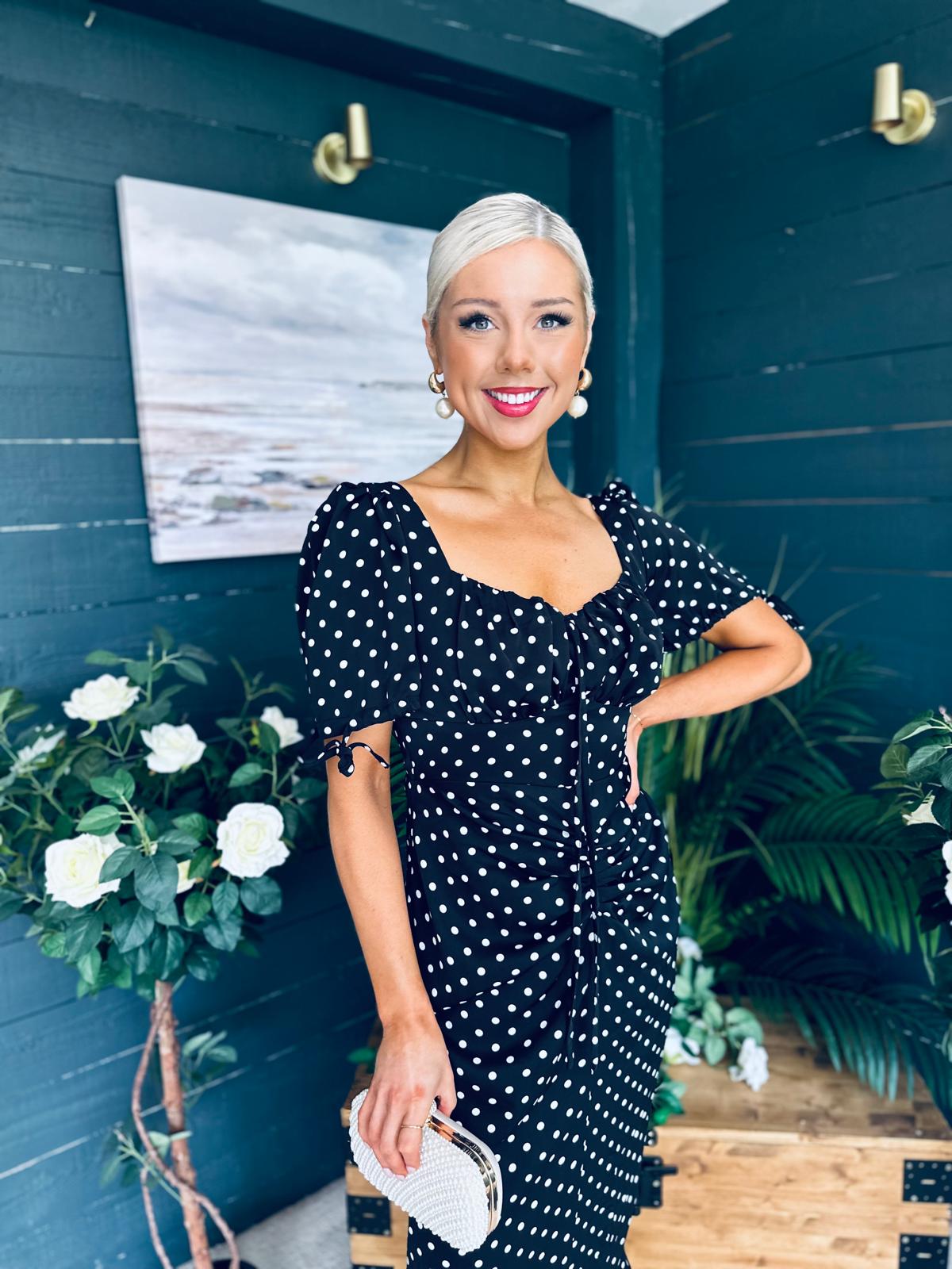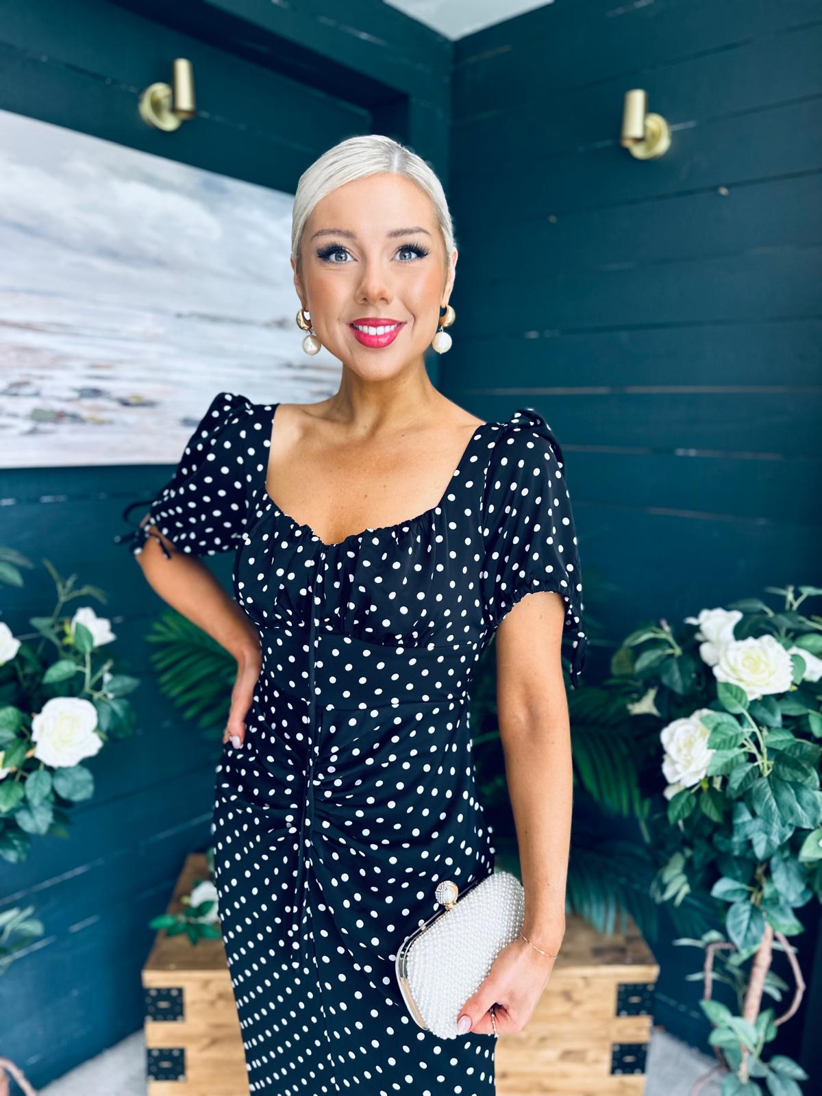 Introducing the Dove Ruched Detail Midi Dress, adorned with a classic spot print for a touch of elegance.