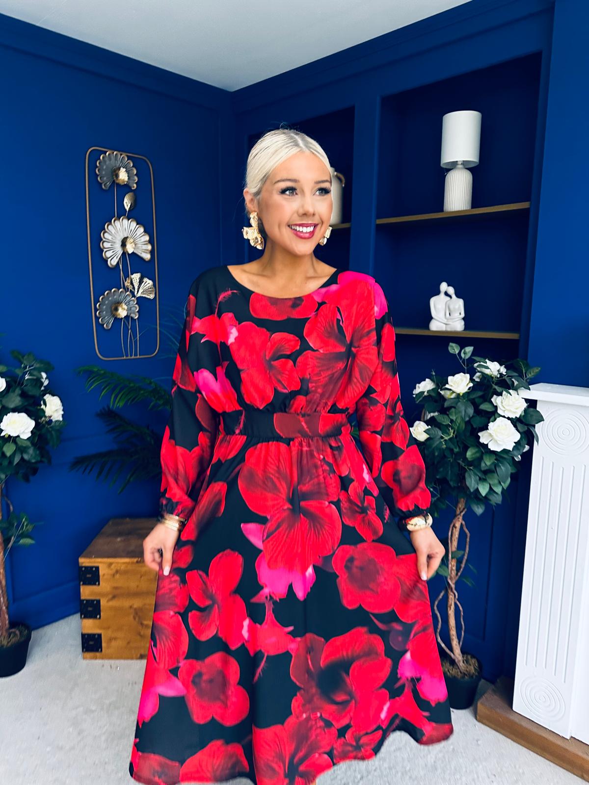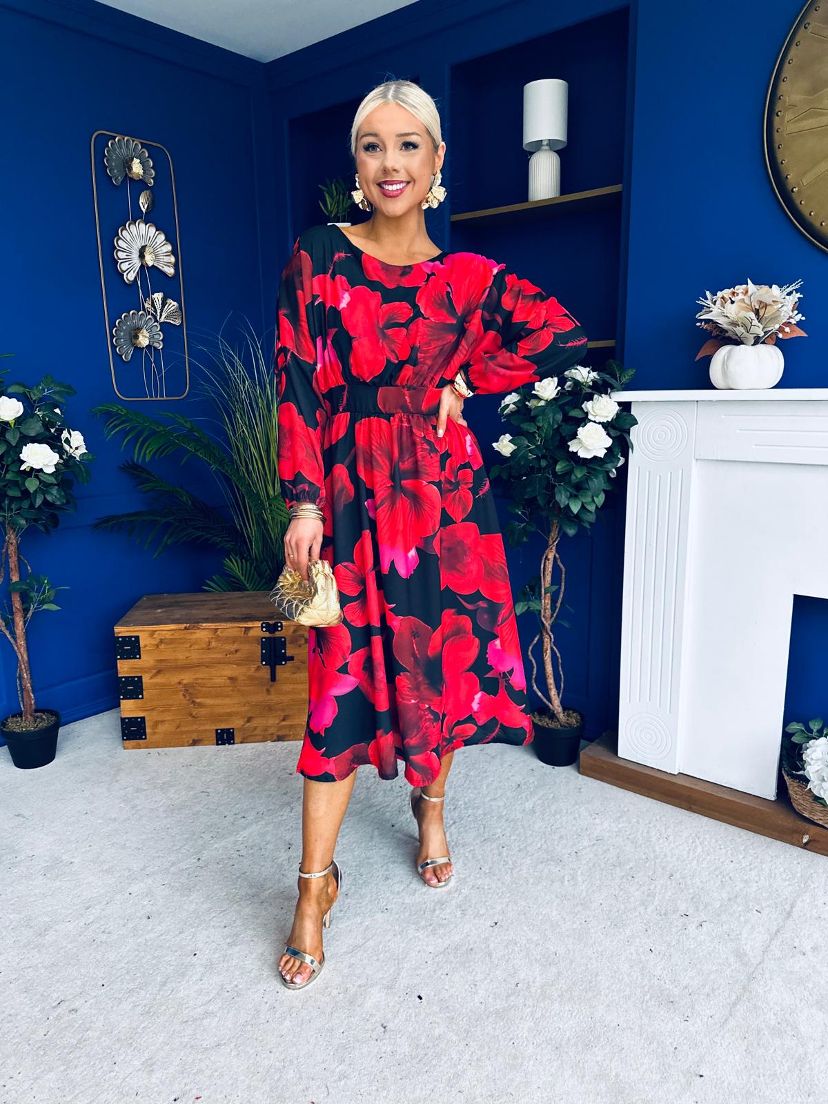 This dress comes in the most amazing print with beautiful sleeve, wide rounded neckline, banded midriff, elasticated waist to cinch and flowing skirt to flatter