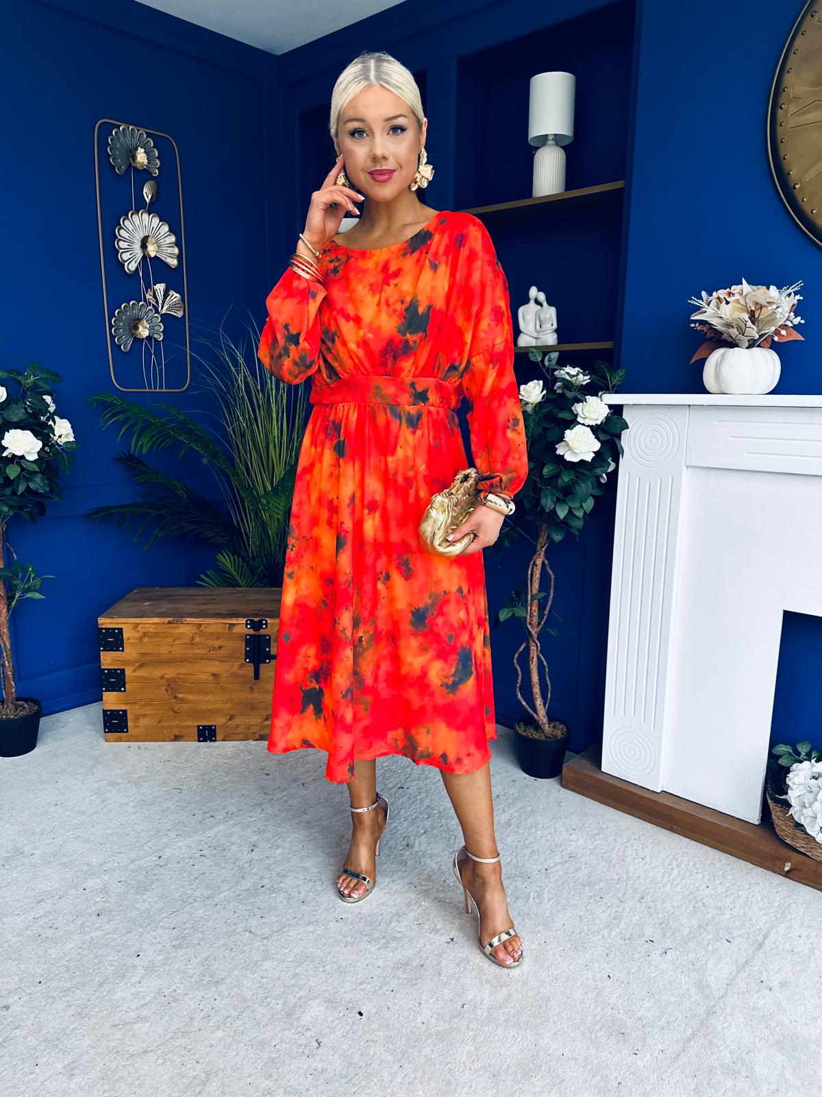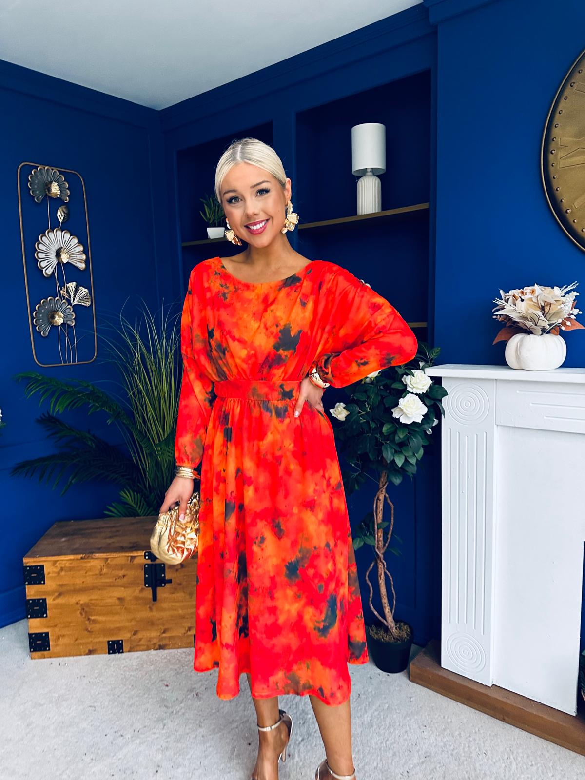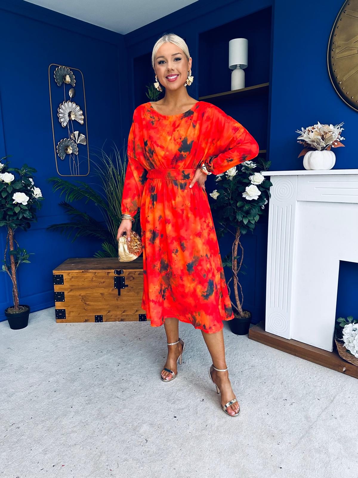 This dress comes in the most amazing print with beautiful sleeve, wide rounded neckline, banded midriff, elasticated waist to cinch and flowing skirt to flatter