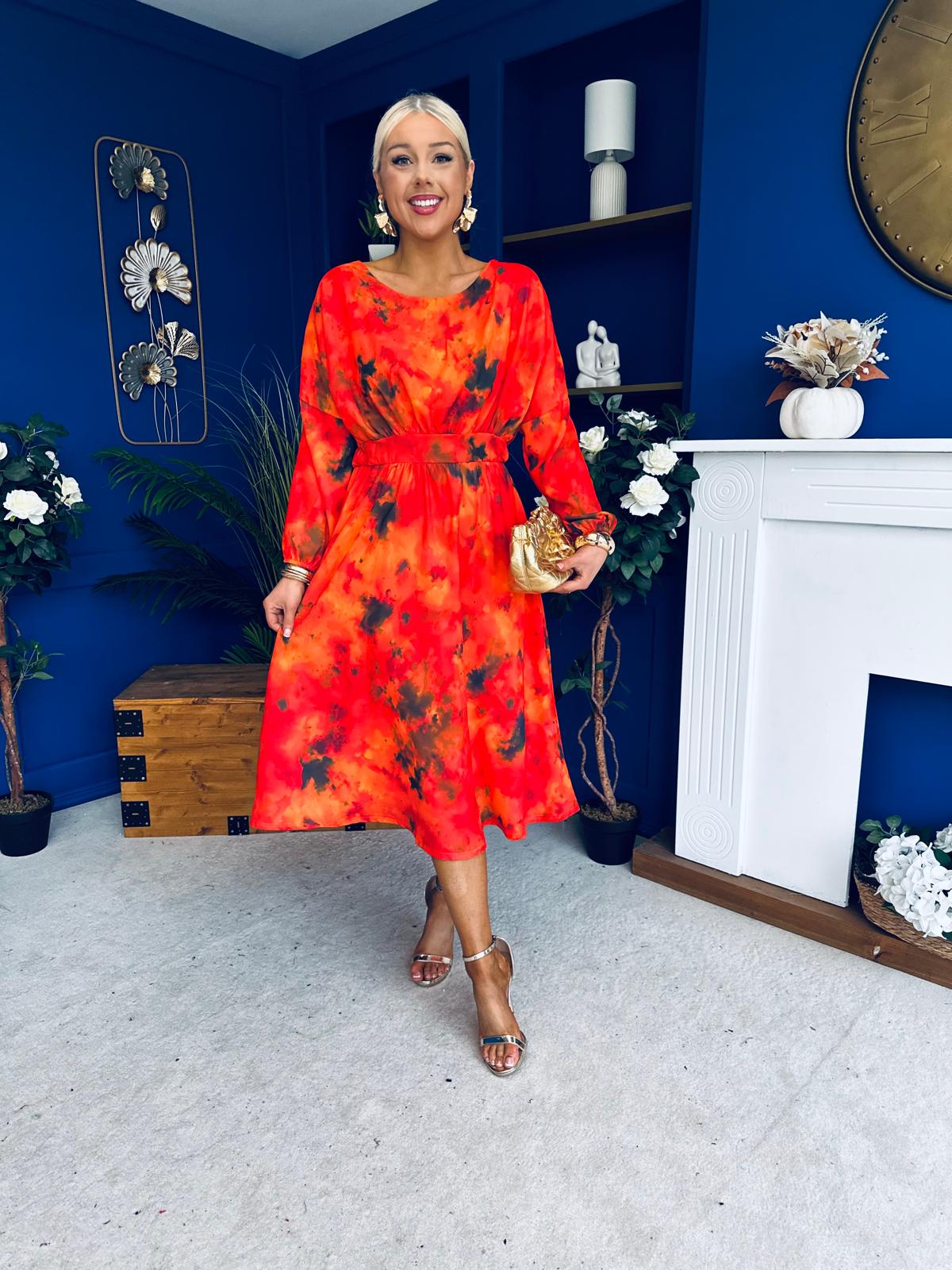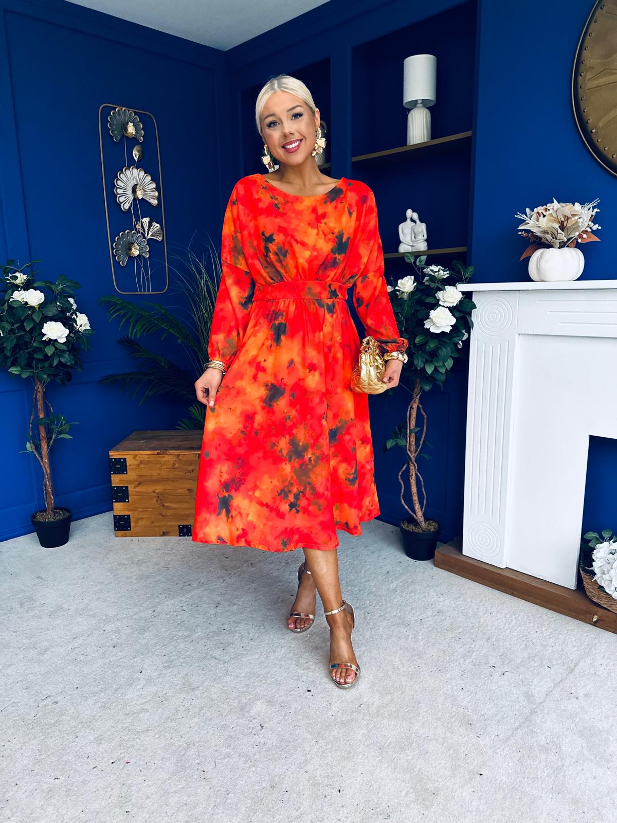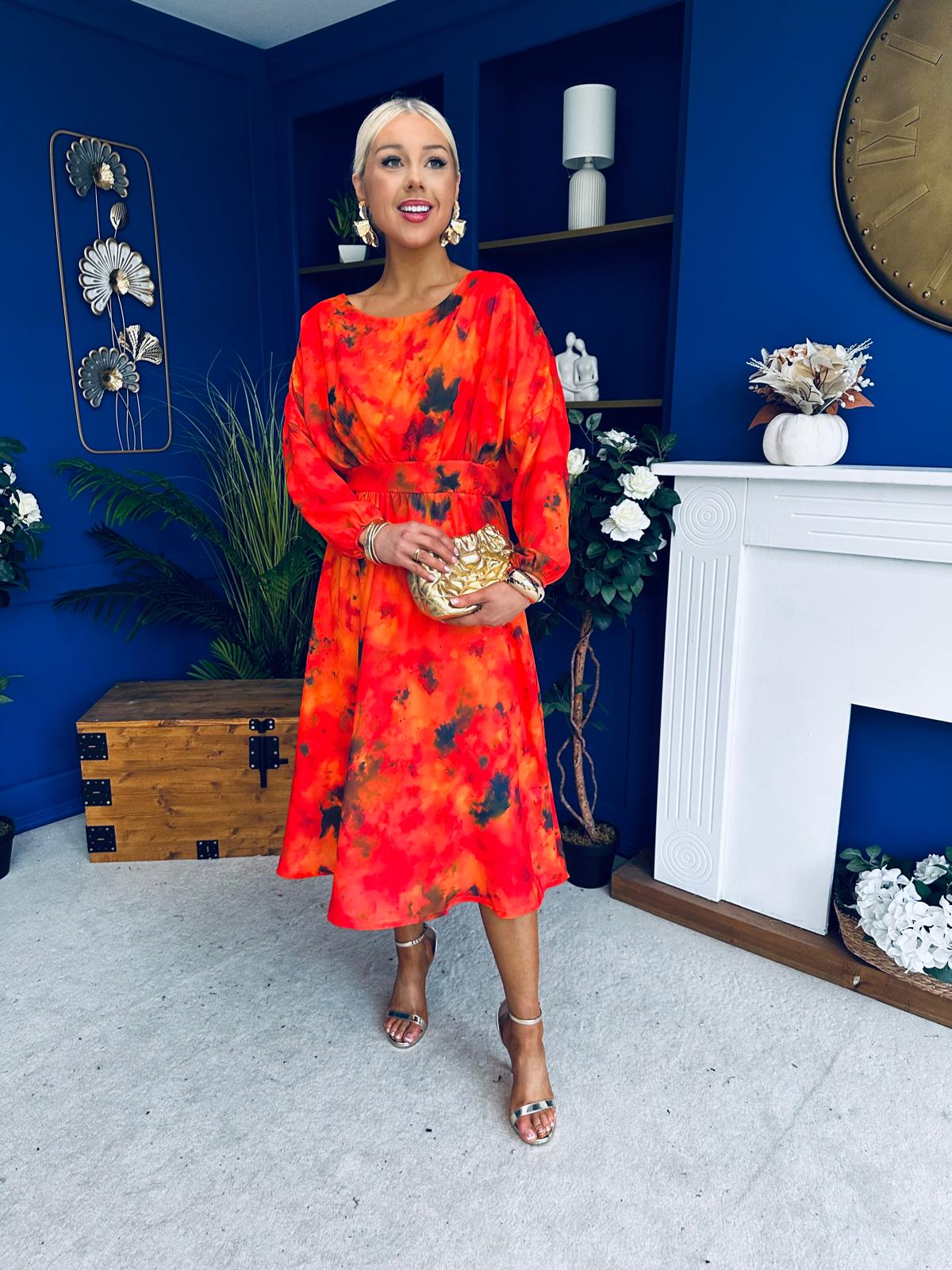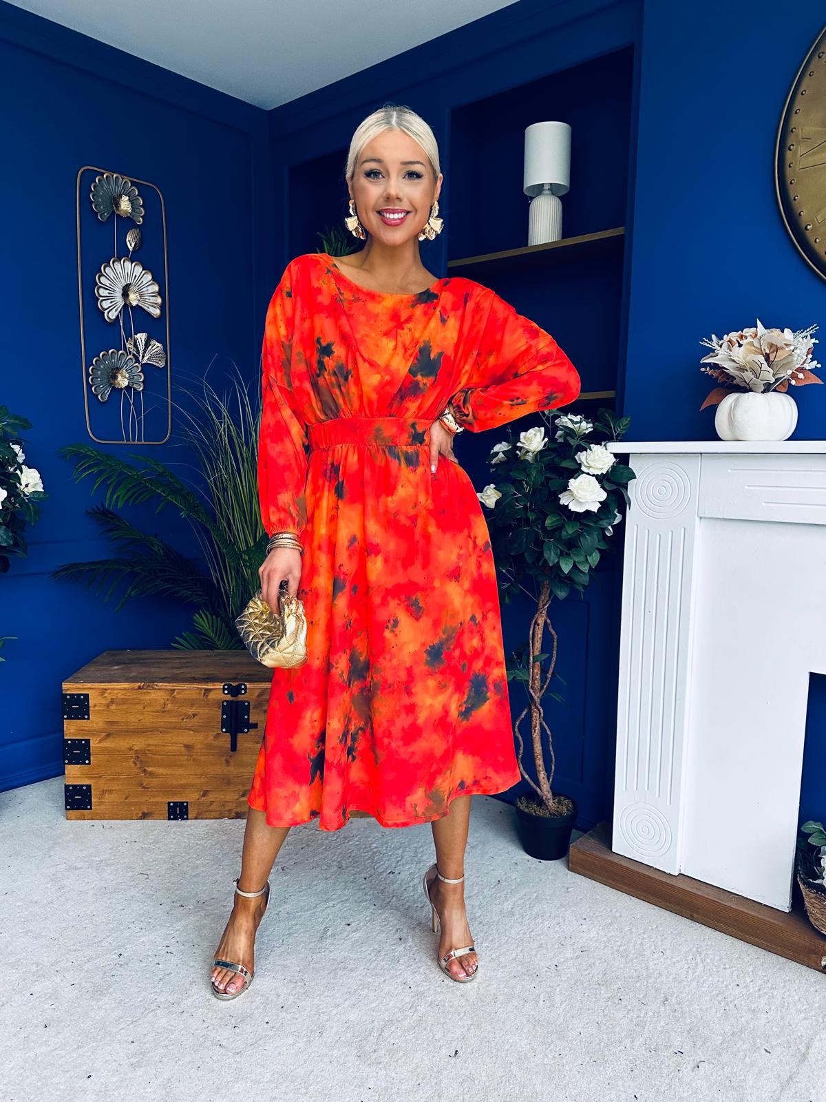 This dress comes in the most amazing print with beautiful sleeve, wide rounded neckline, banded midriff, elasticated waist to cinch and flowing skirt to flatter