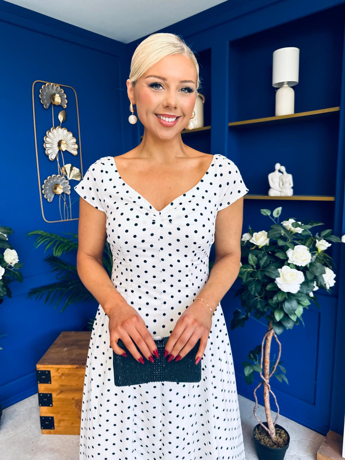 Ebby Pleated Bust Strappy Midi Dress Polka White