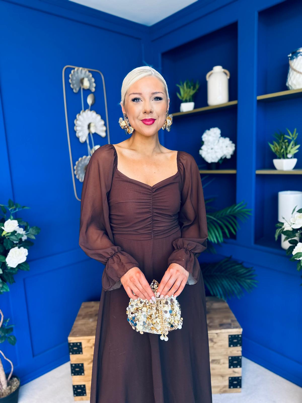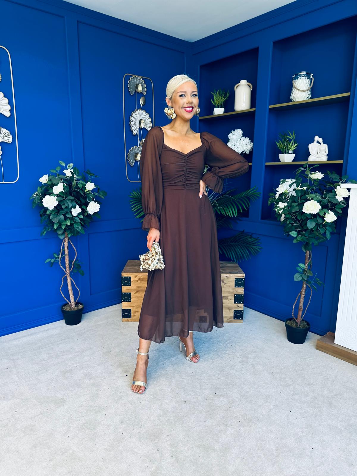 This dress comes in the most amazing lined chiffon, with beautiful sleeve detail, ruched bust, banded midriff, elasticated back to cinch and flowing skirt to flatter