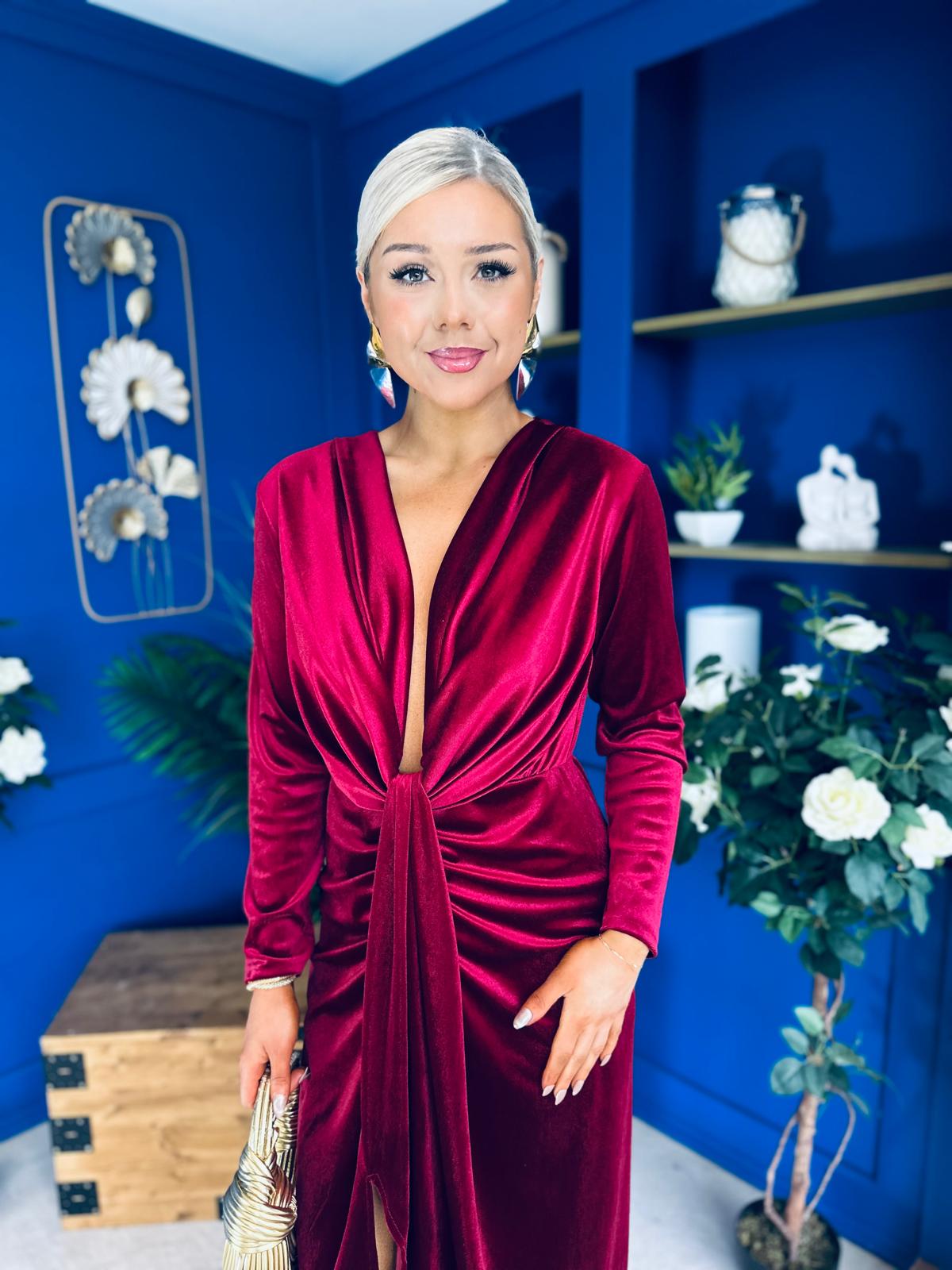 Our new Elaine Velvet Dress with full sleeve, plunge neckline, gathered waist & flowing skirt with high split is simply fabulous