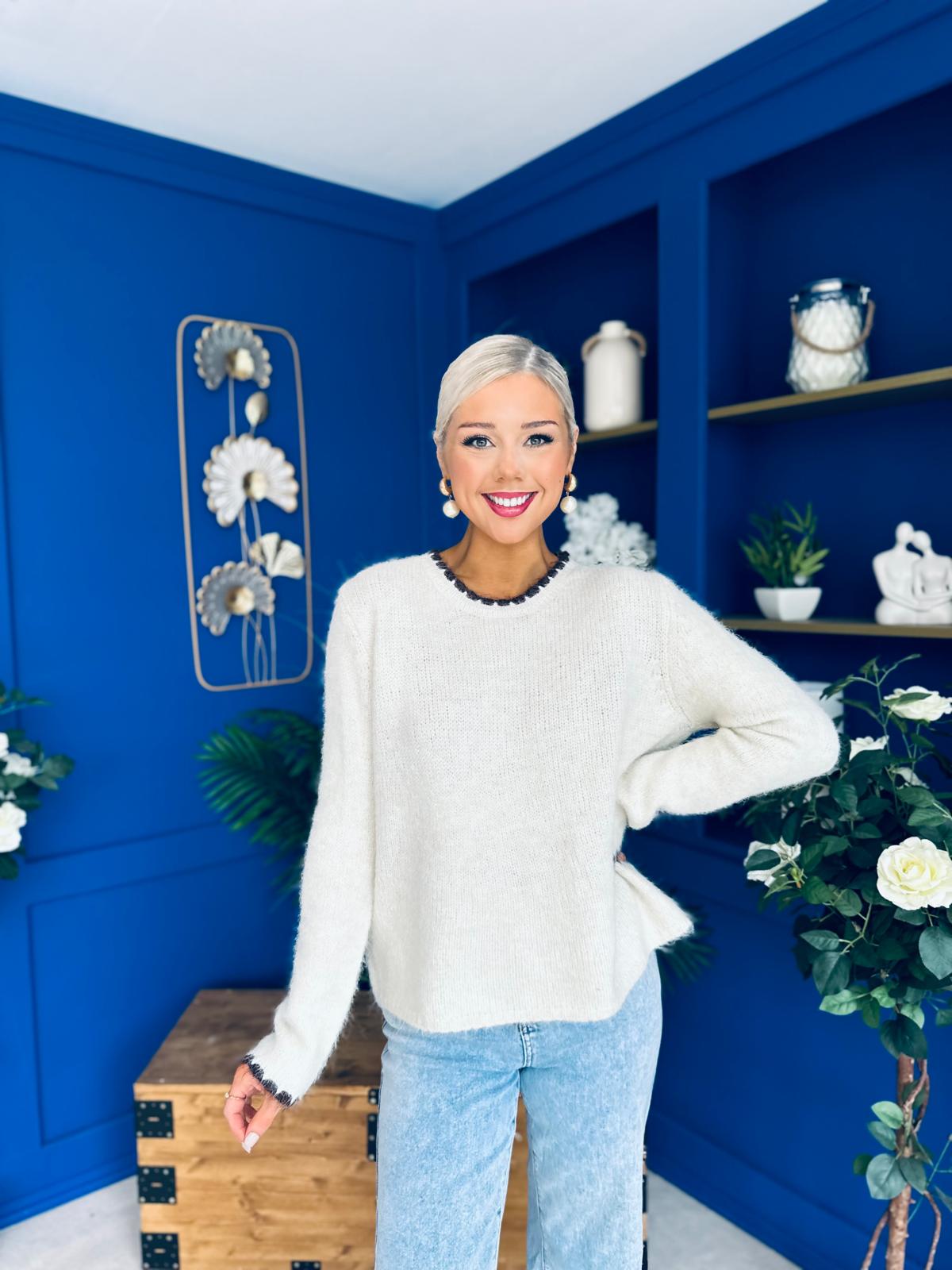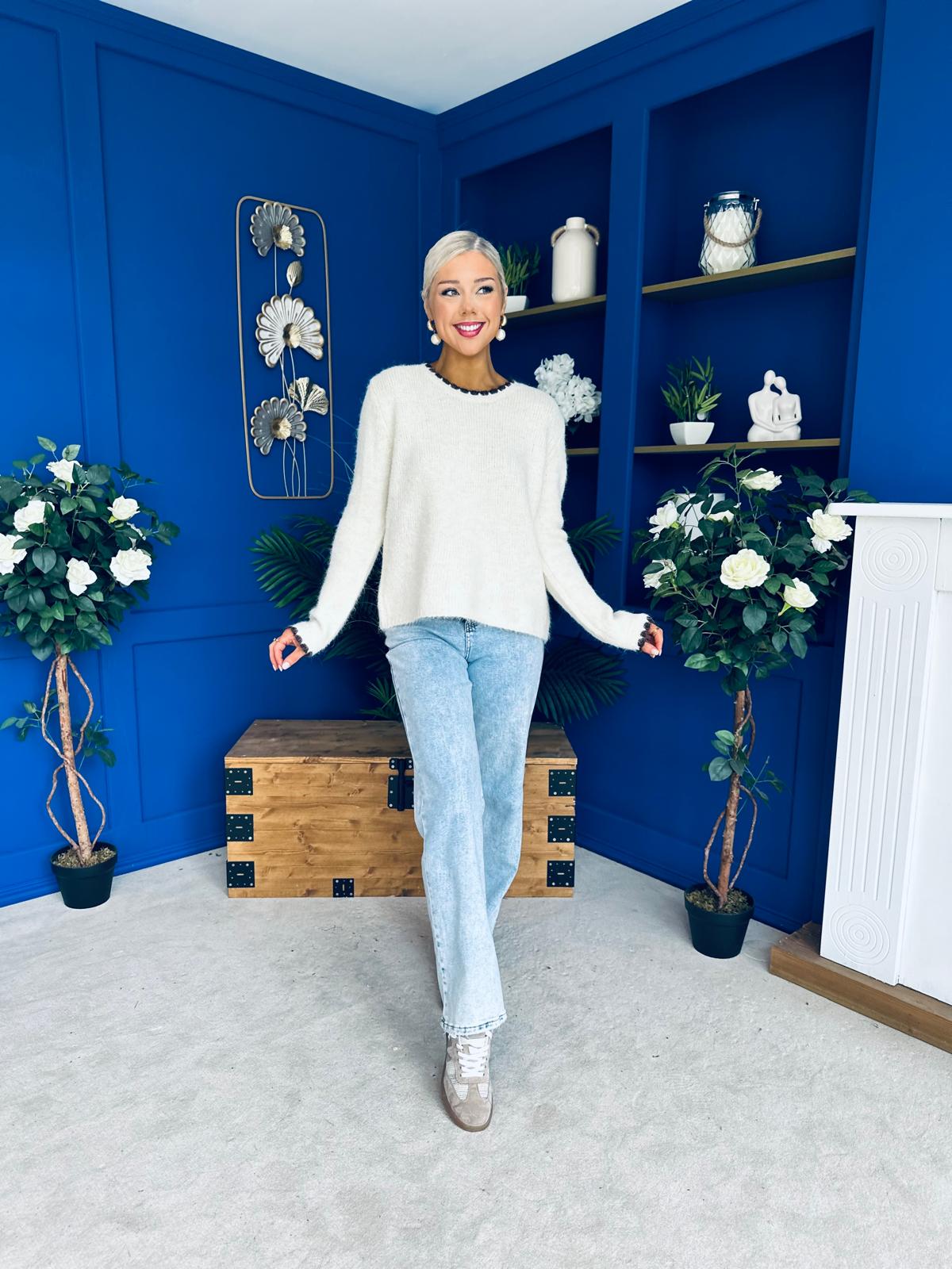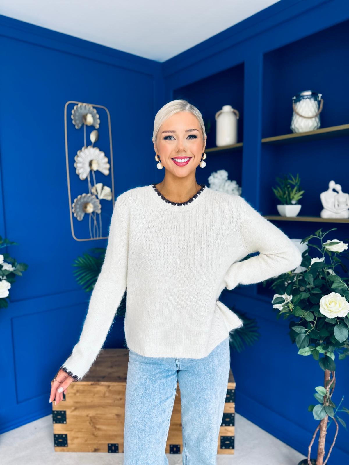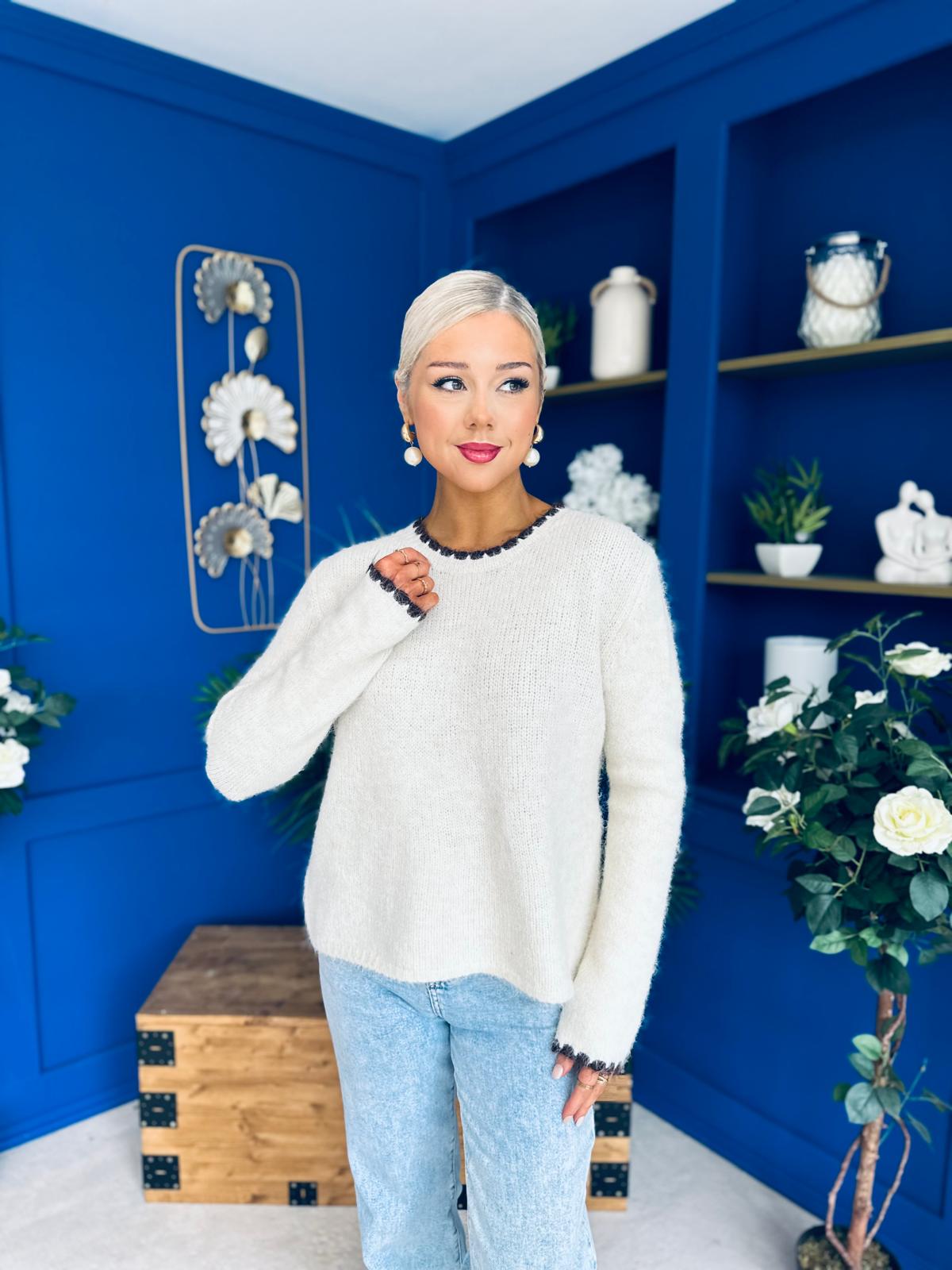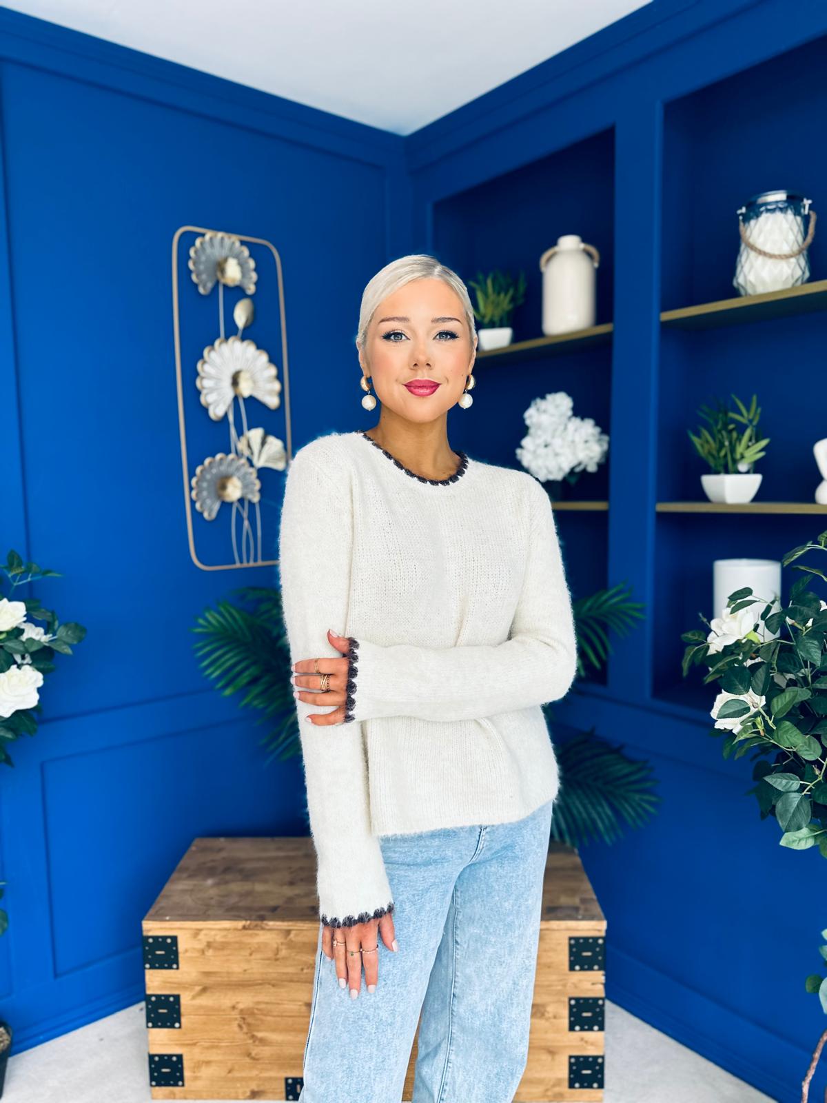 Gorgeous Chunky knit jumper with Coco brown collar and cuff detail.