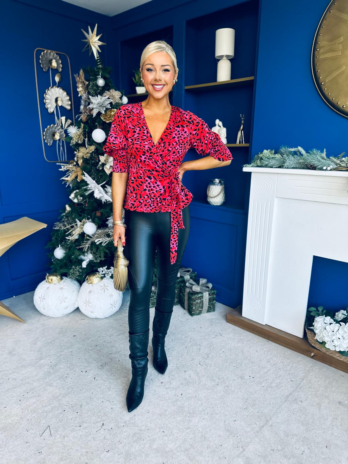 Brighten up your work wardrobe with the Eliza Shirred Cuff Wrap Top Red Pink Animal!