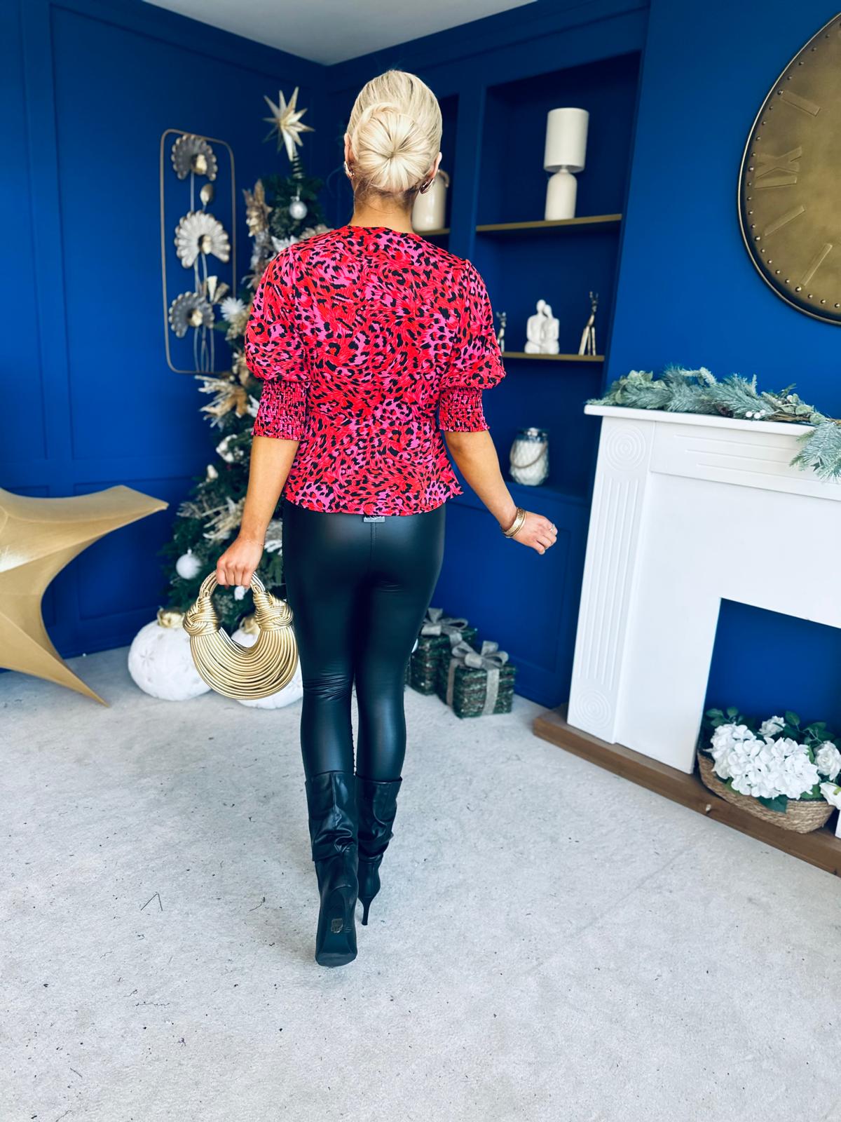 Eliza Shirred Cuff Wrap Top Red Pink Animal