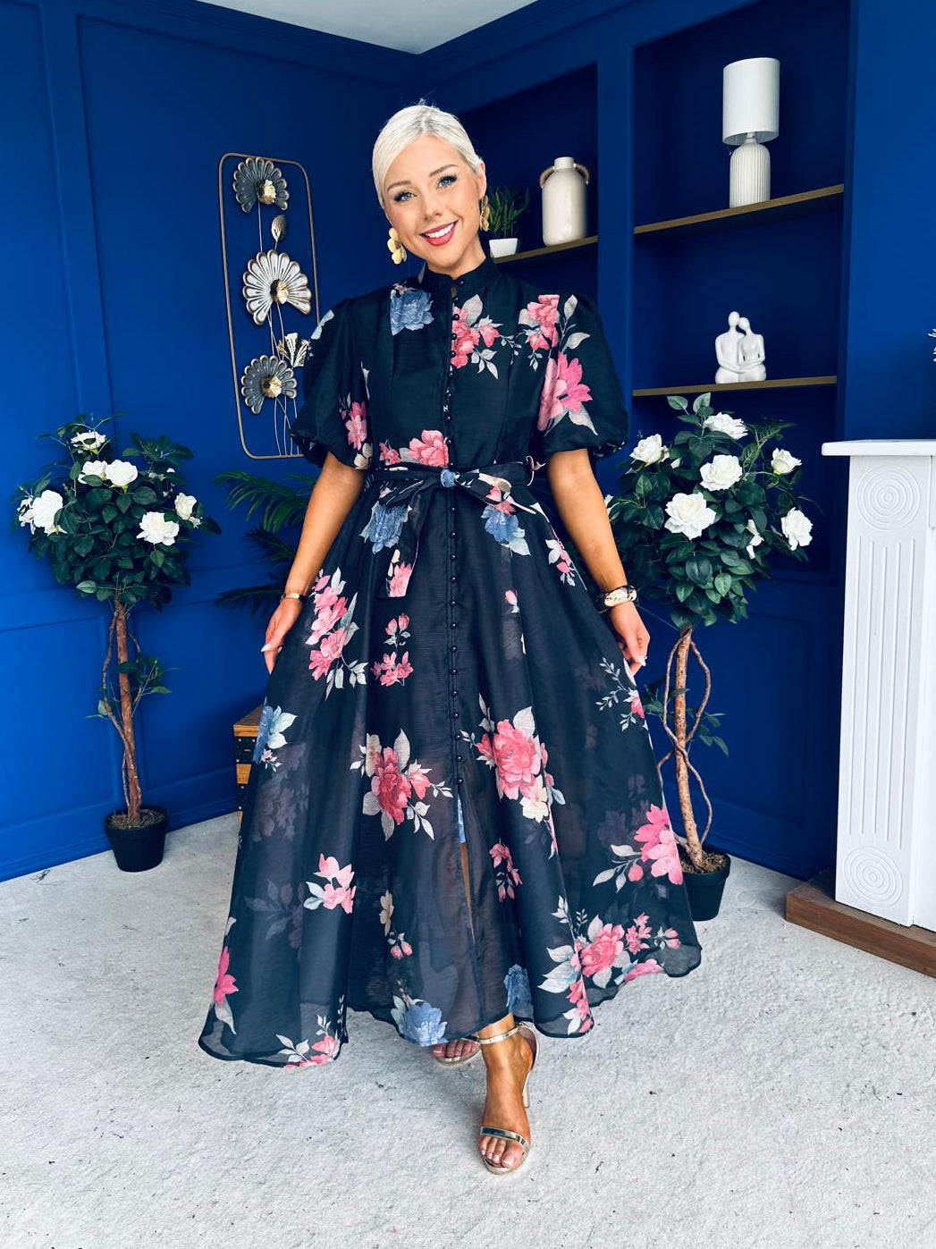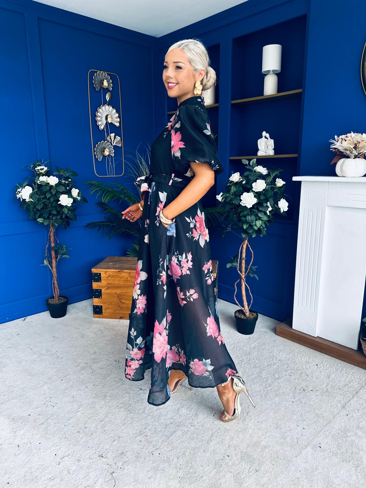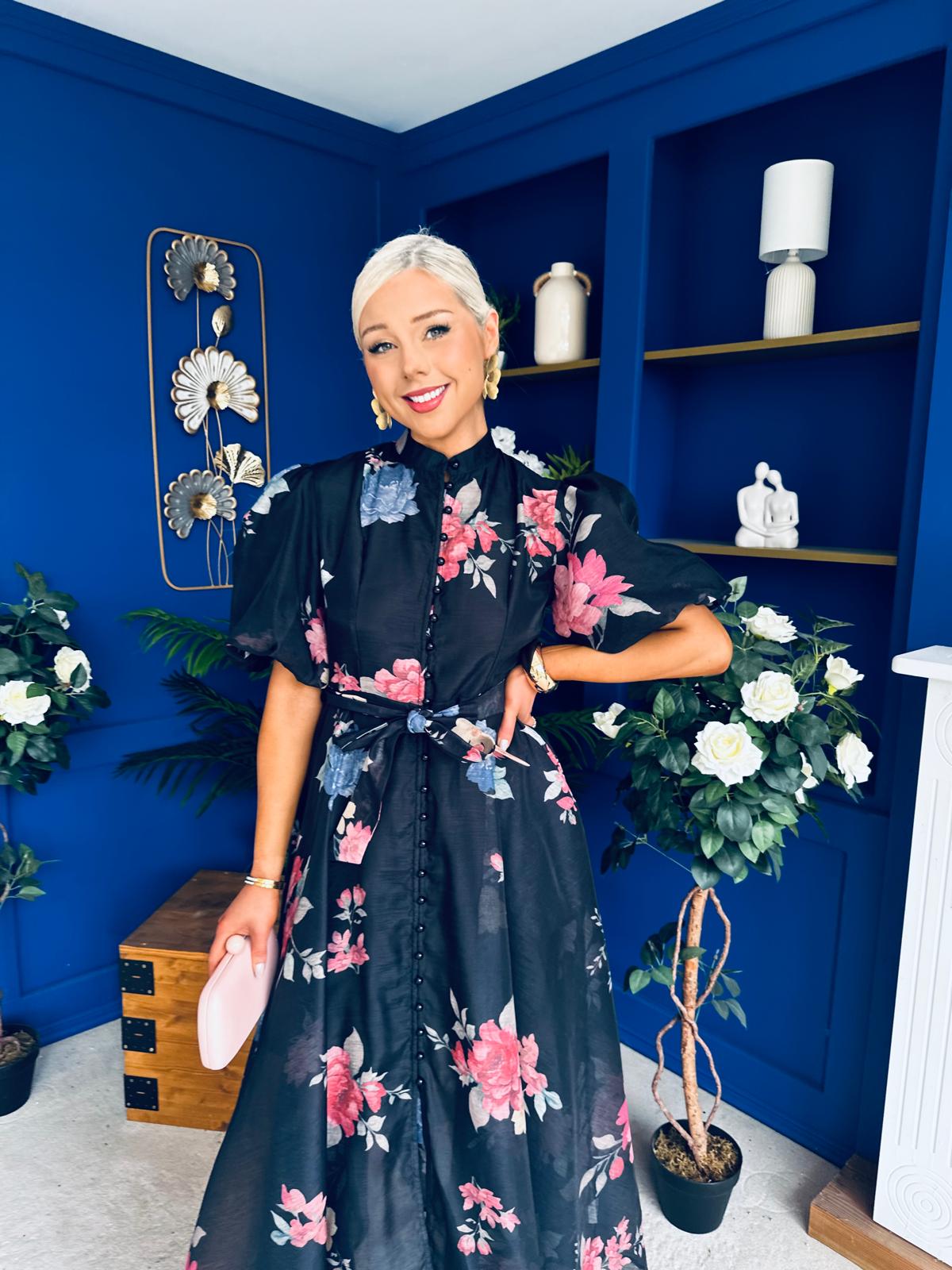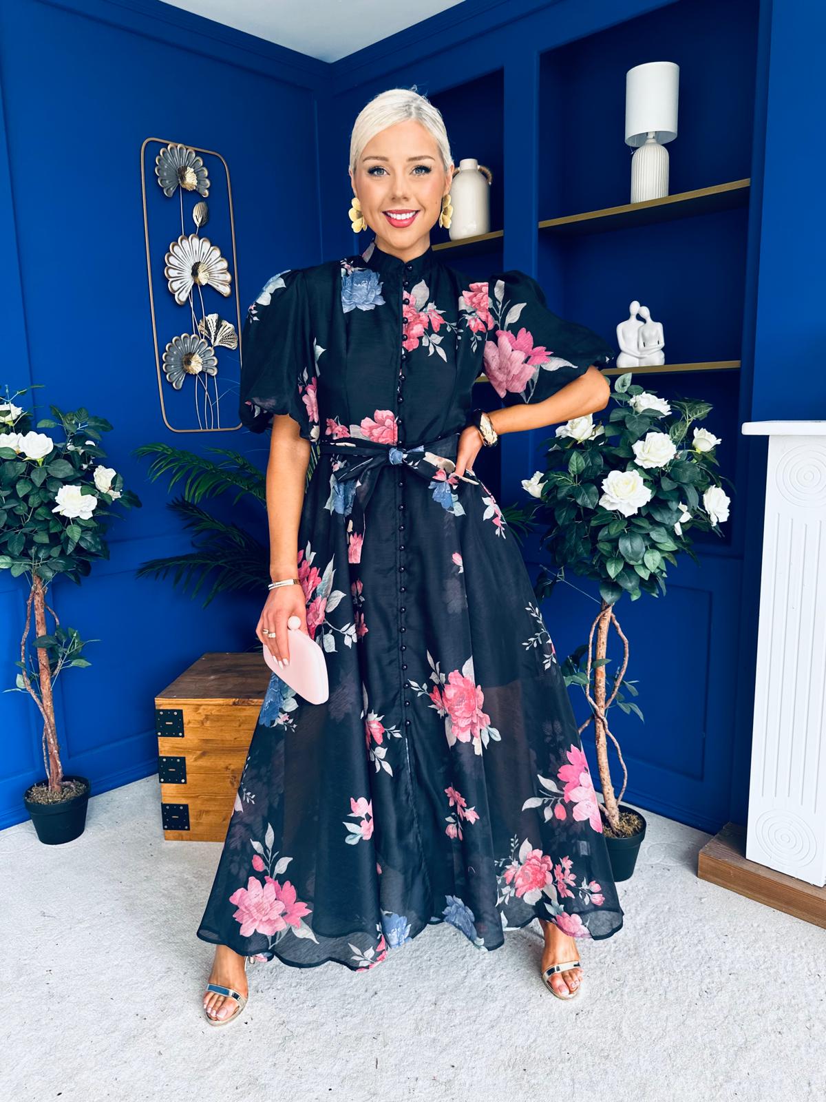 With a classic shirt detail neckline, button detailing, flowing skirt matching belt, floral detail and a wonderful puff sleeve.