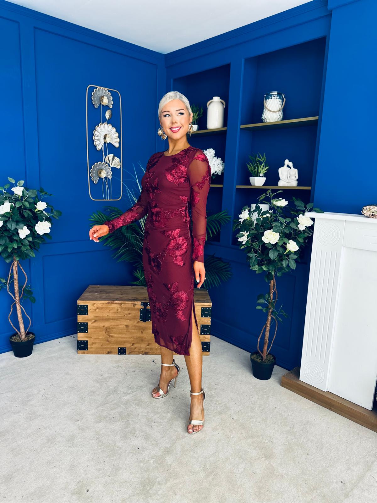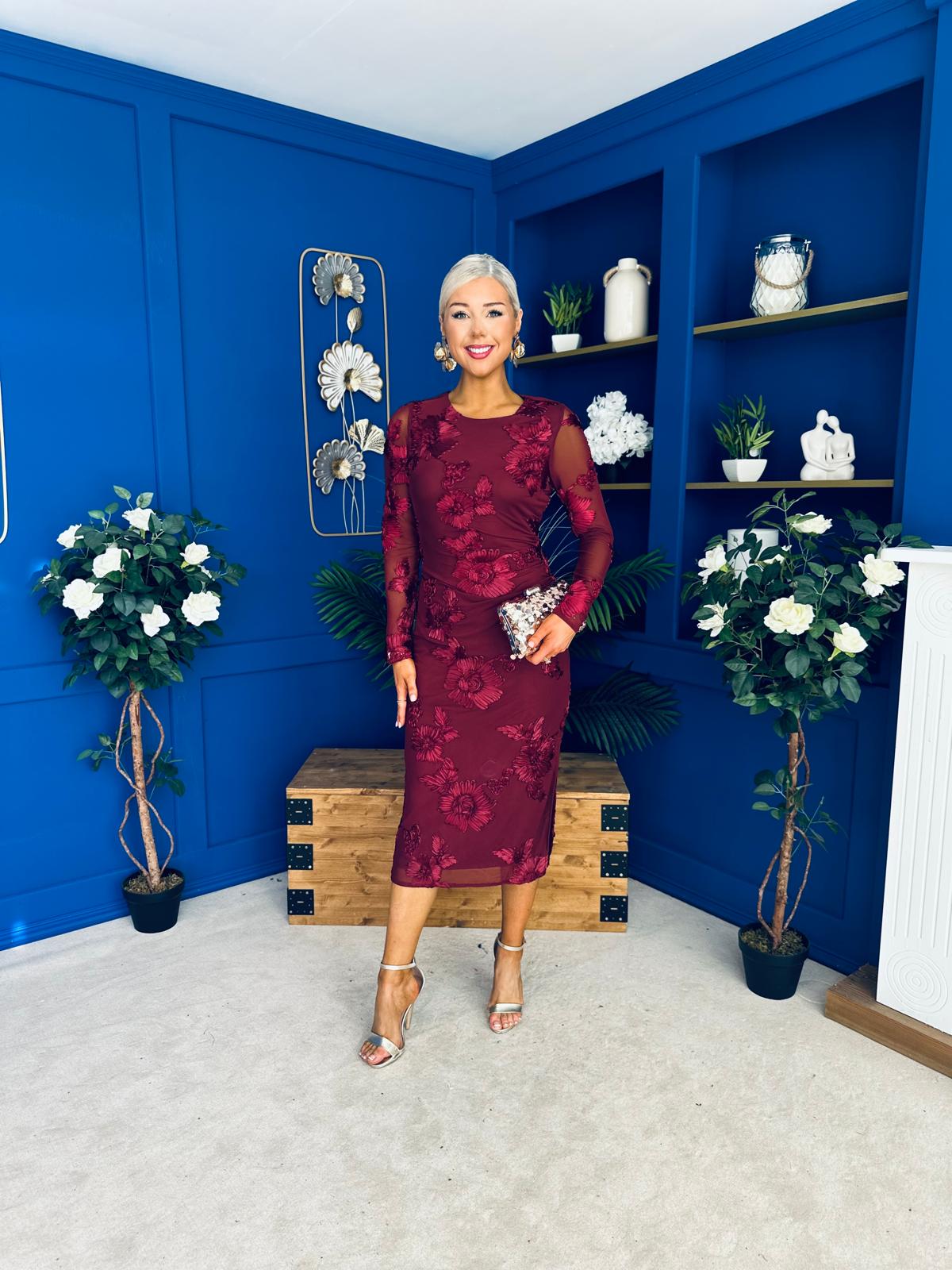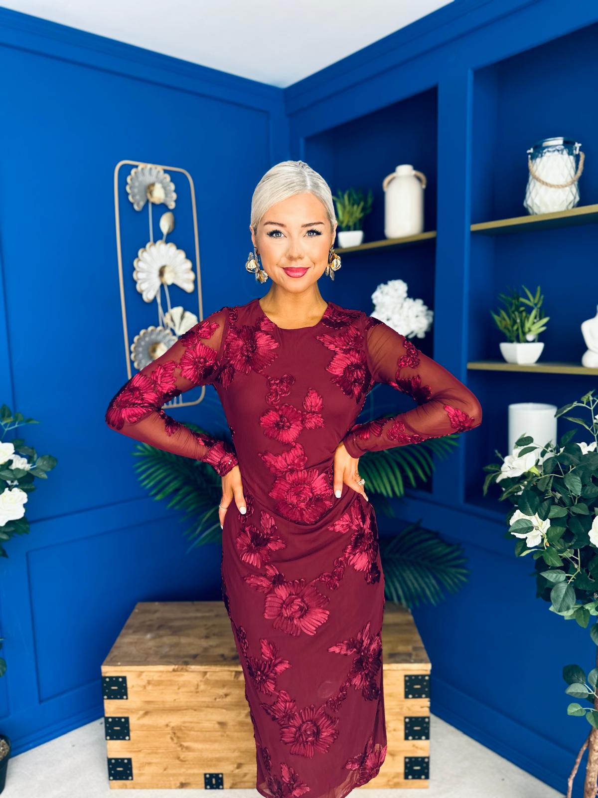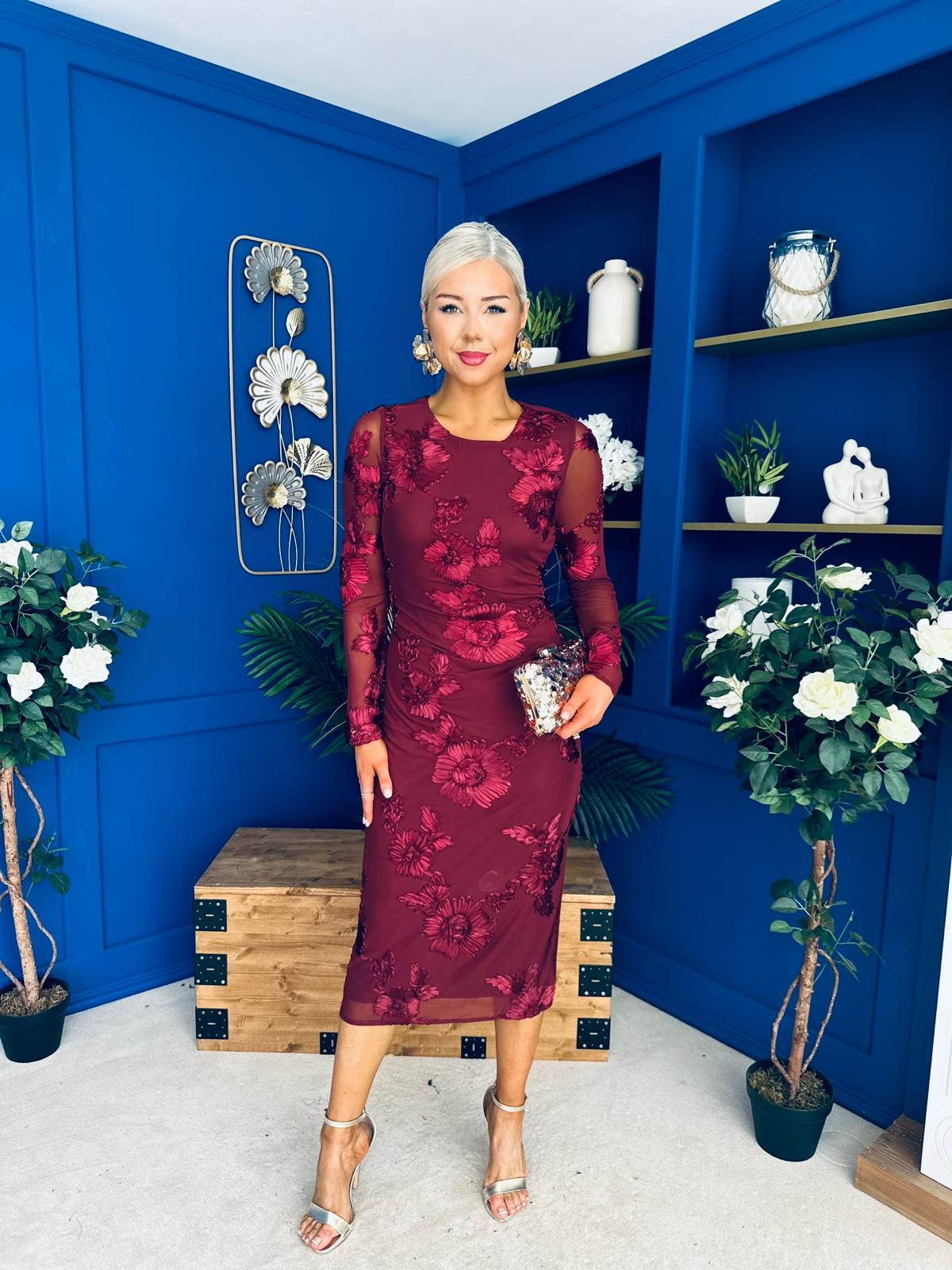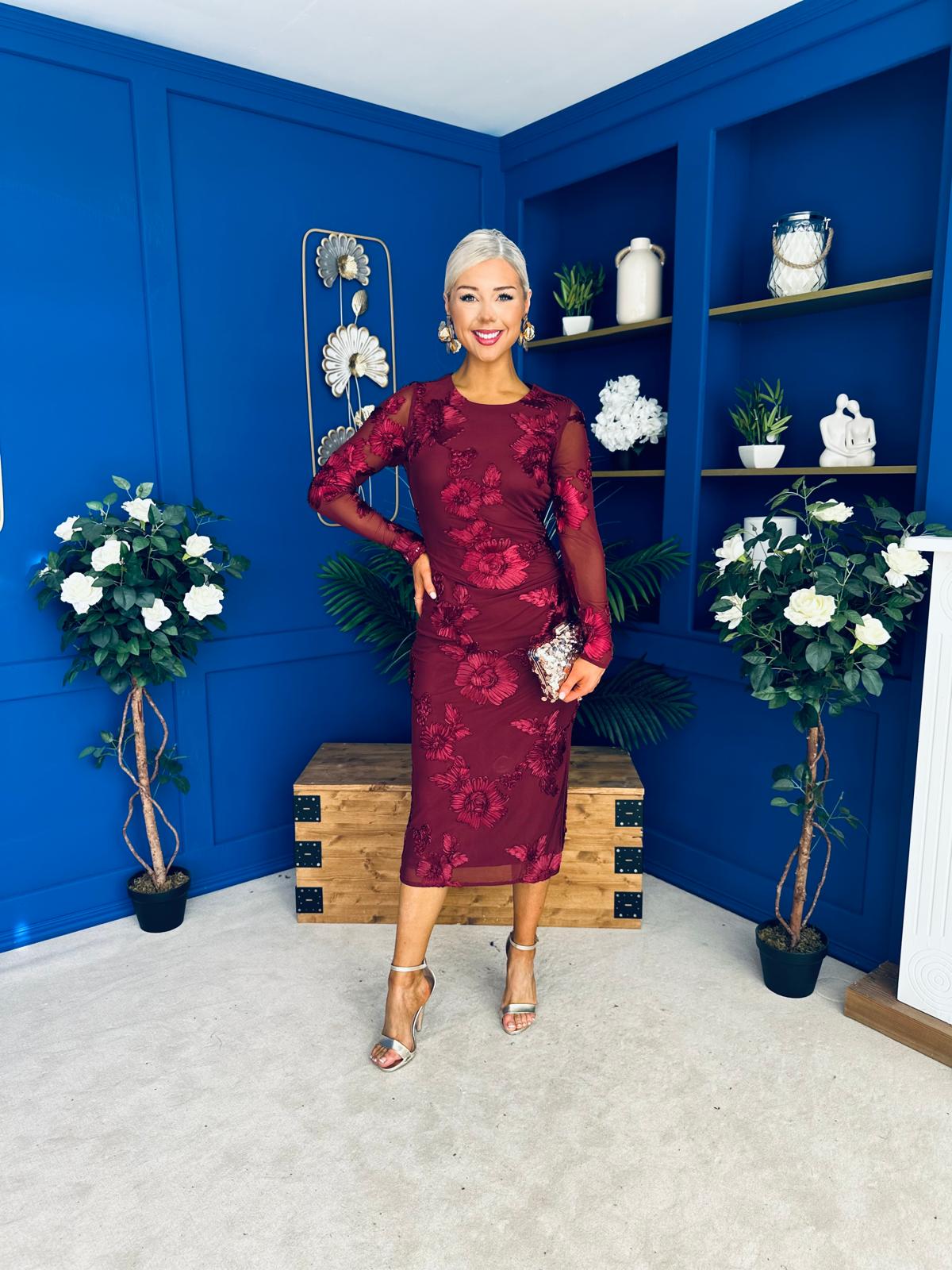 Elodie Floral Embroidered Mesh Bodycon Dress Wine