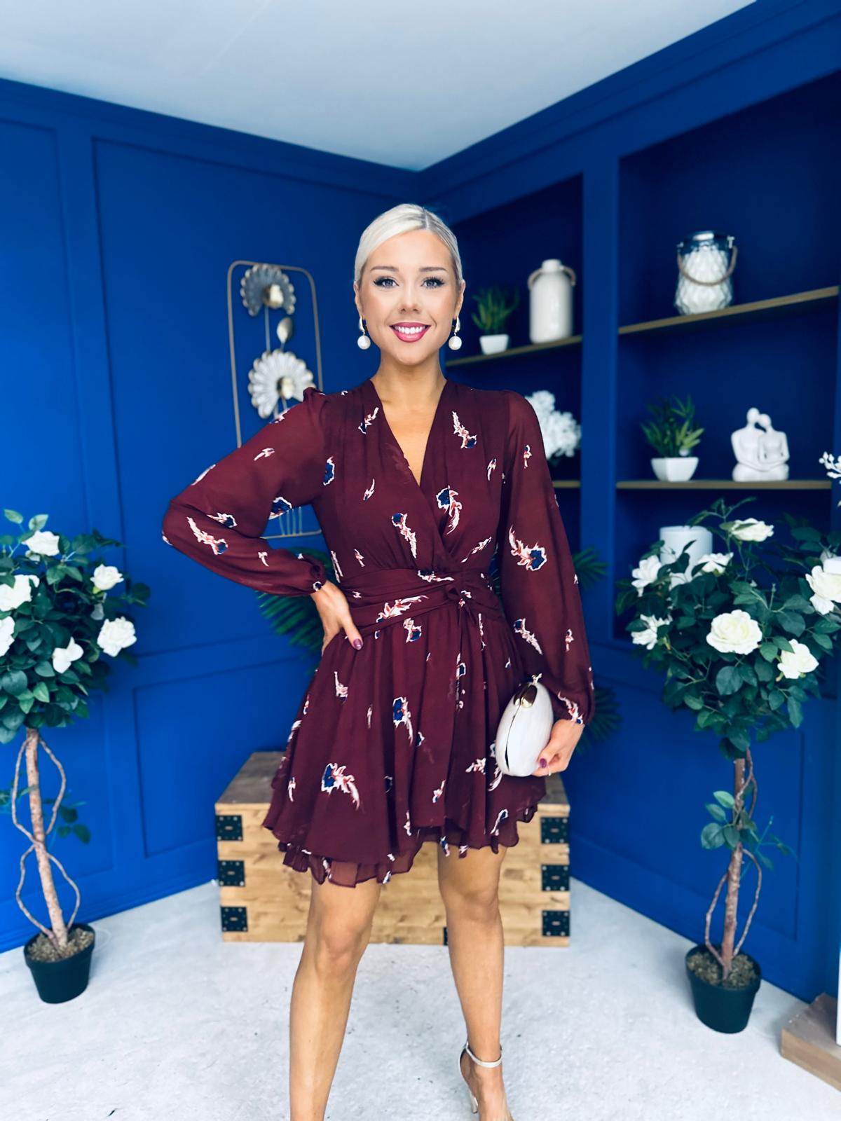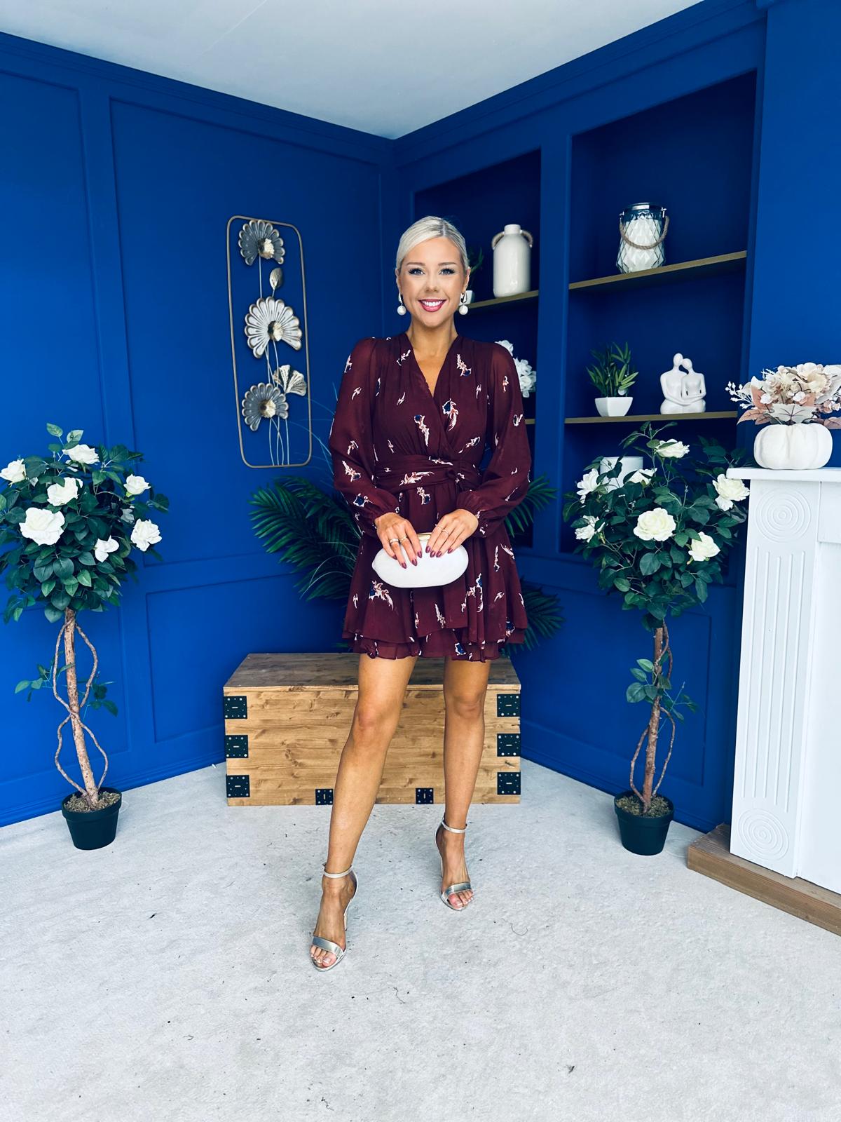 Its dramatic sliver studded fabric, wrap over neckline & full sleeve with elasticated waist and faux wrap skirt detail create a stand out look