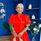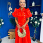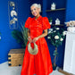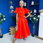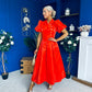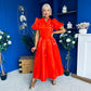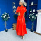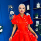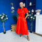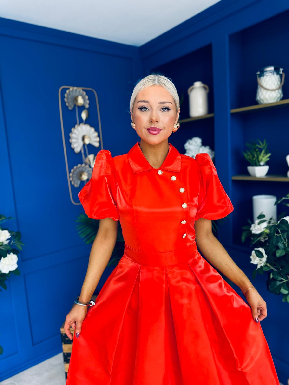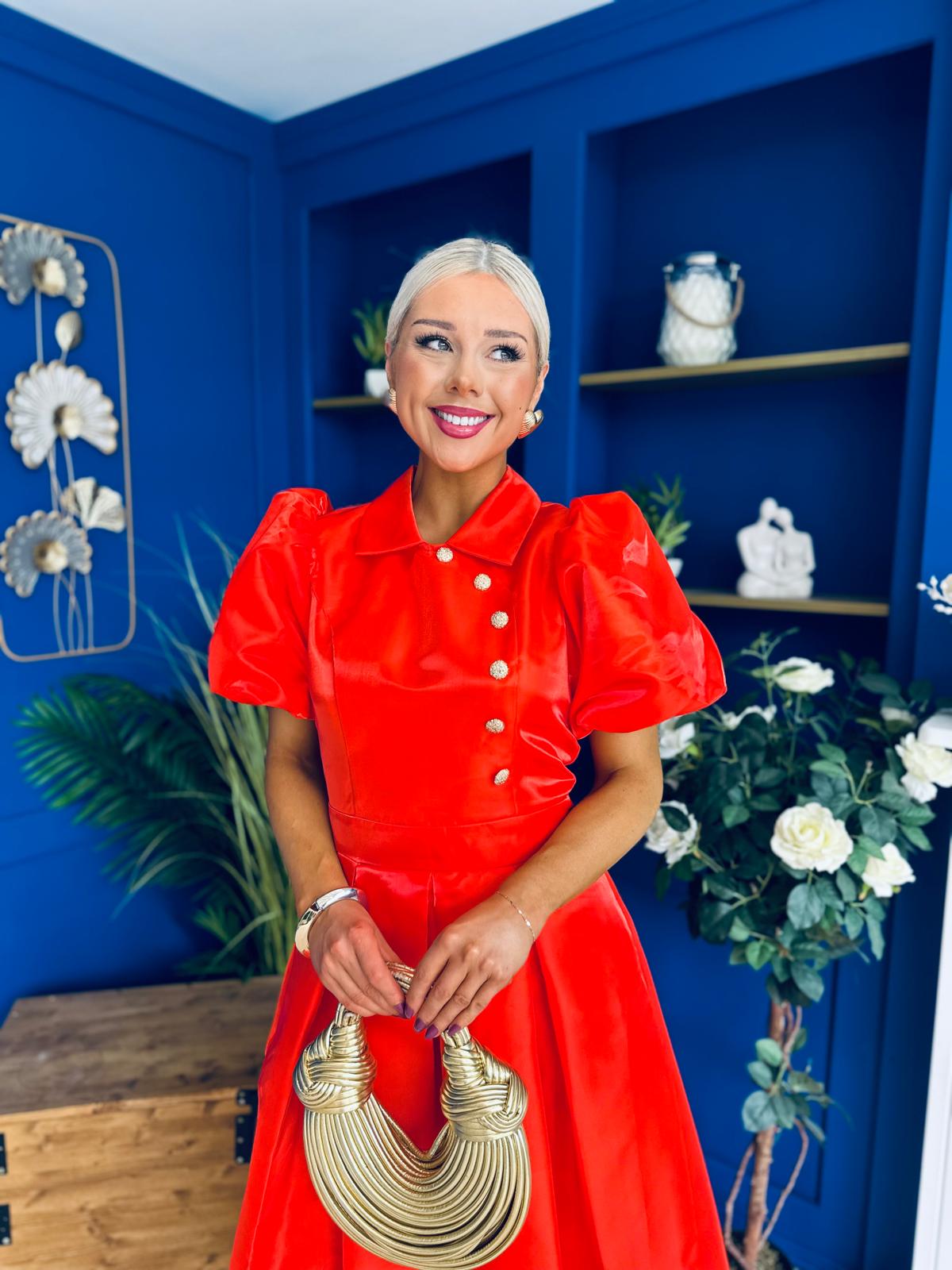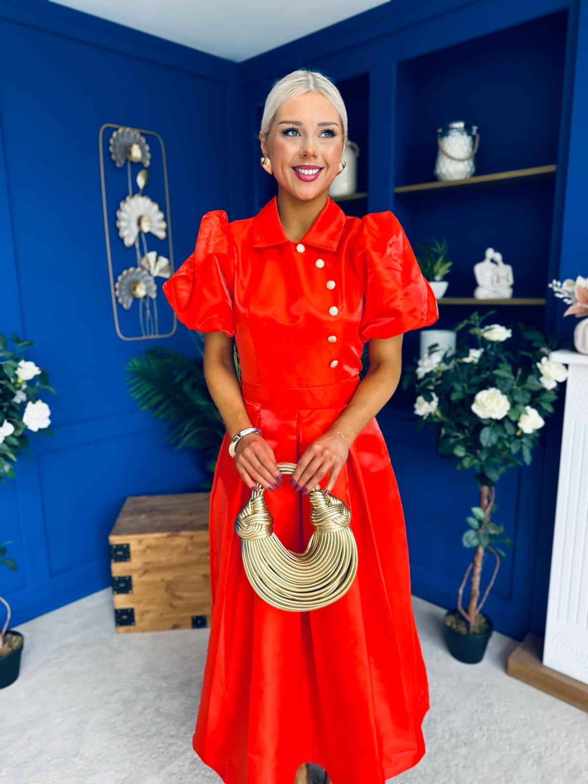 From the standout puff sleeve, faux button detailing to bust, midriff hug & fabulous flowing wide pleat skirt, this dress is truly one of a kind & sure to make an impact at any event