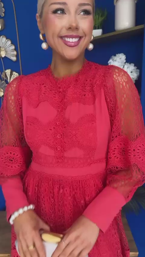 With a gorgeous neckline, crochet detail, full detailed sleeve and flowing detailed skirt.