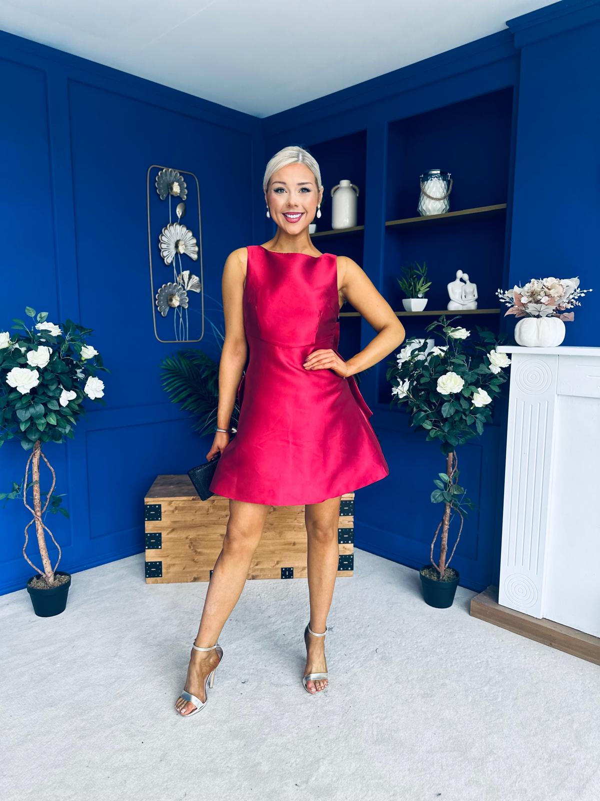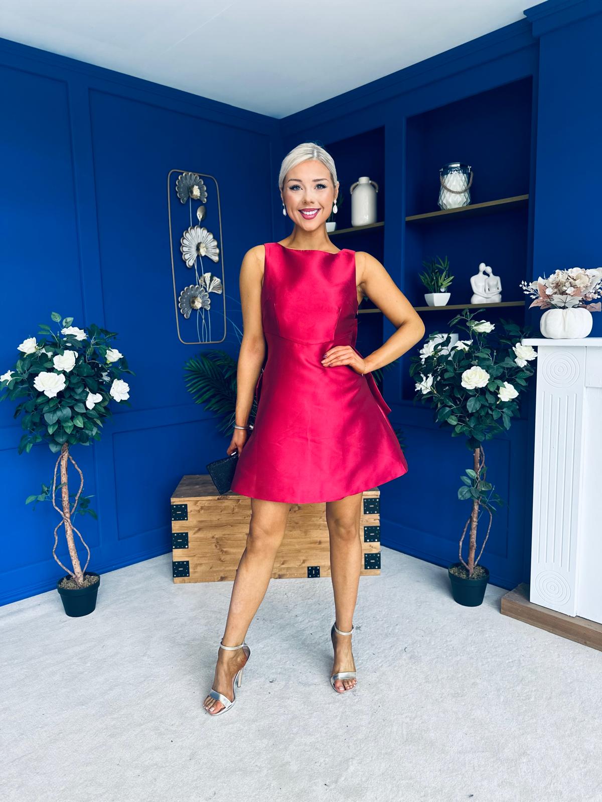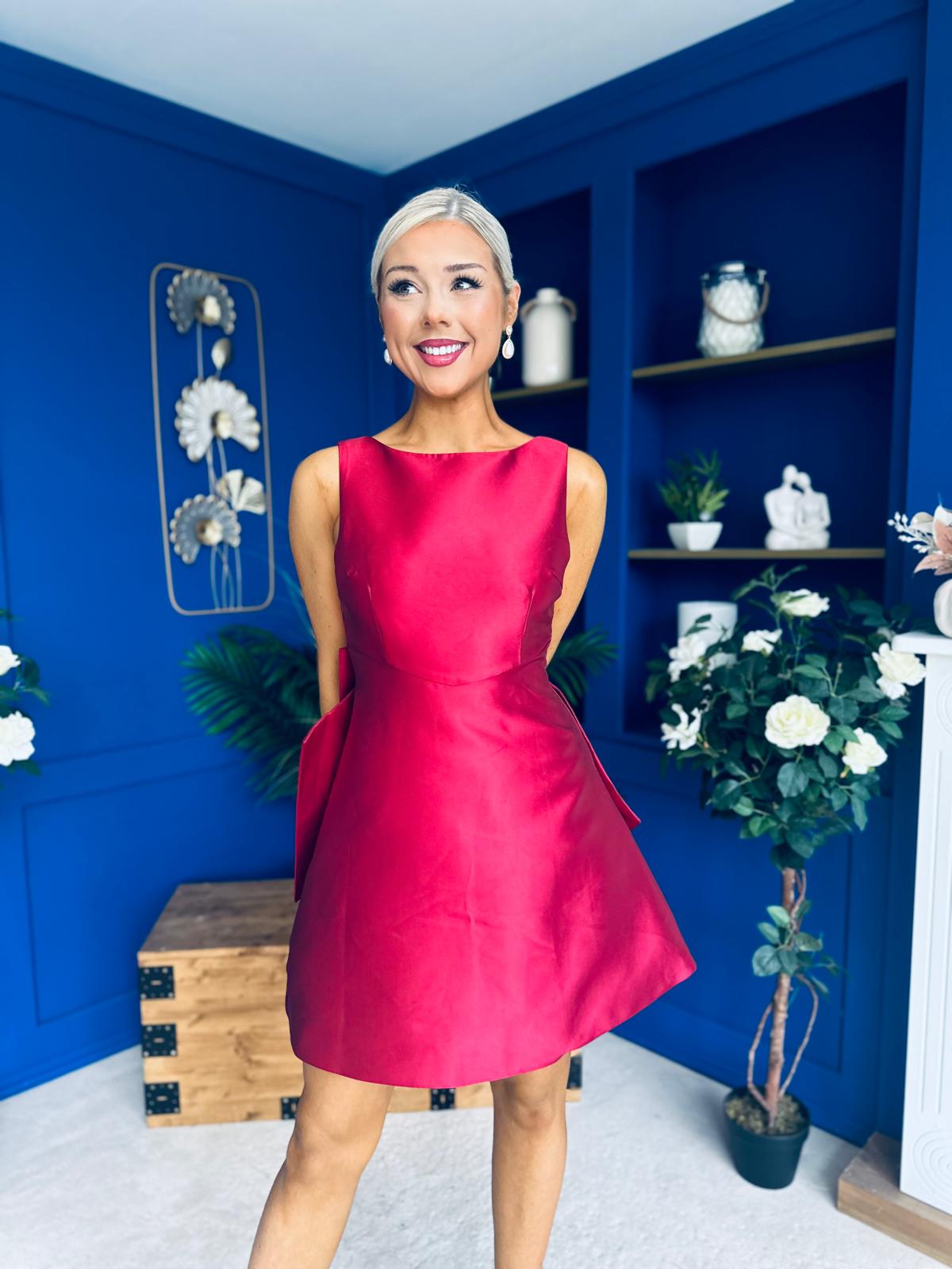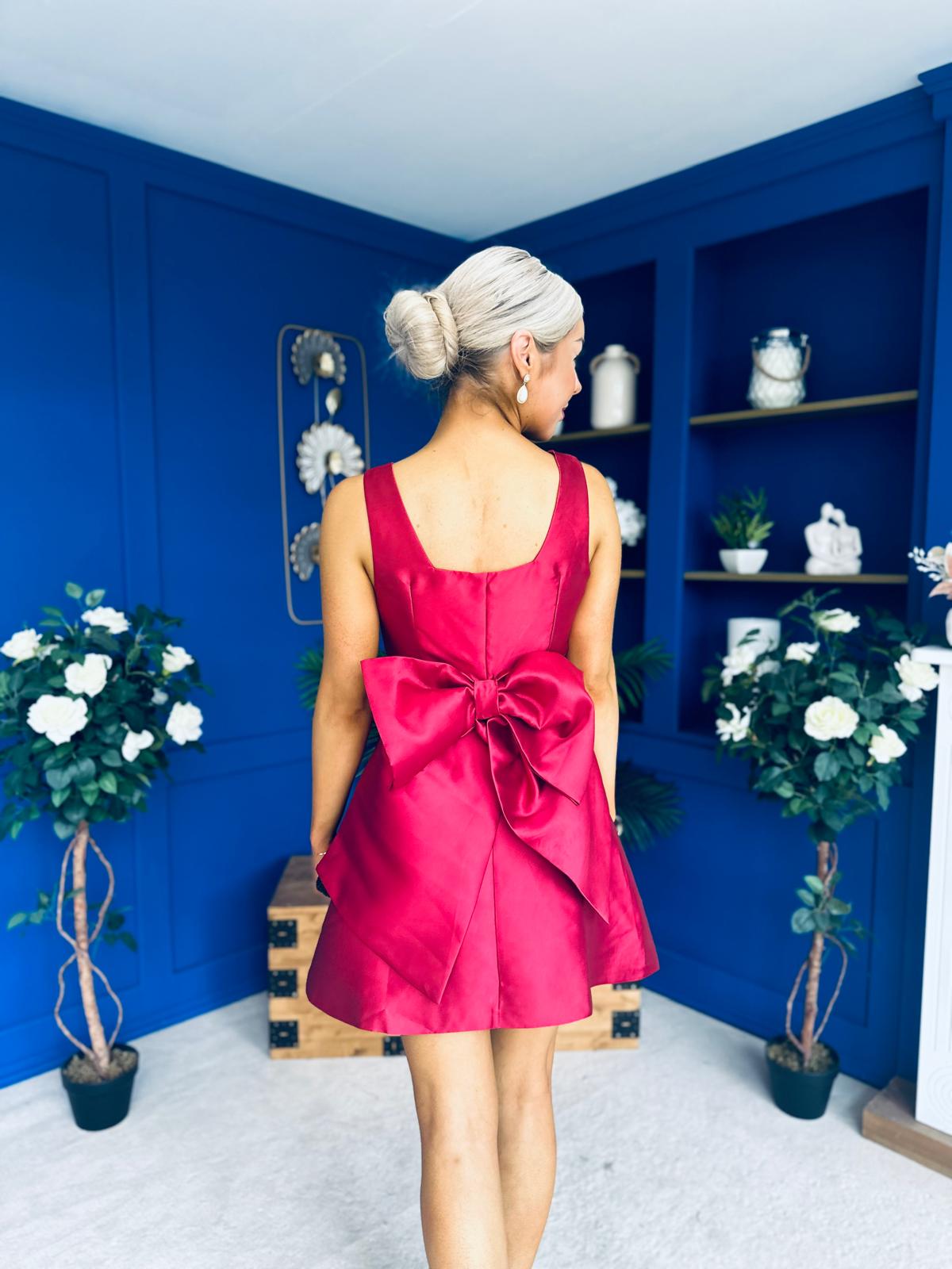 The mini length adds a playful edge, while the standout bow detail at the back brings an elegant, statement touch to your look.