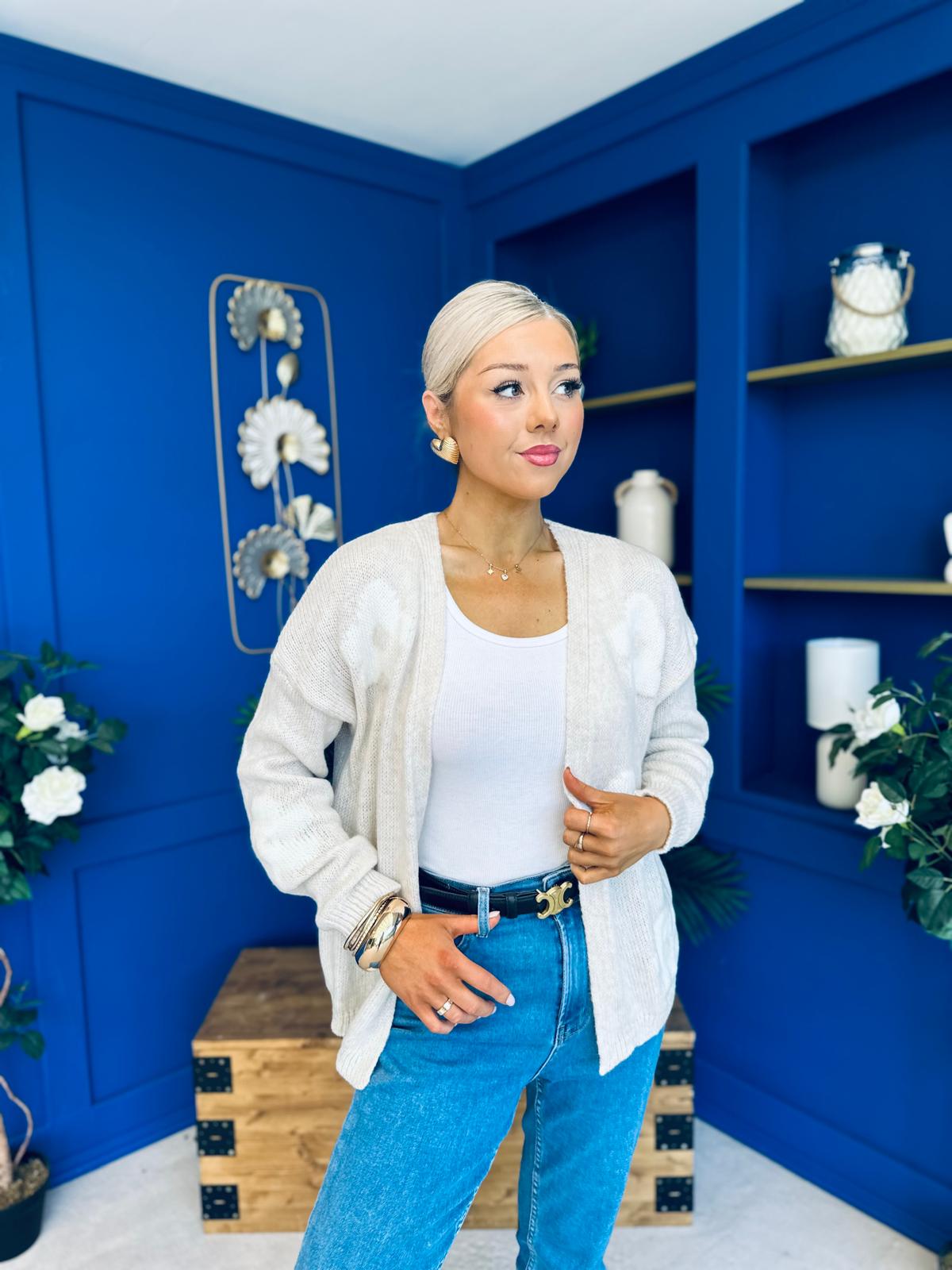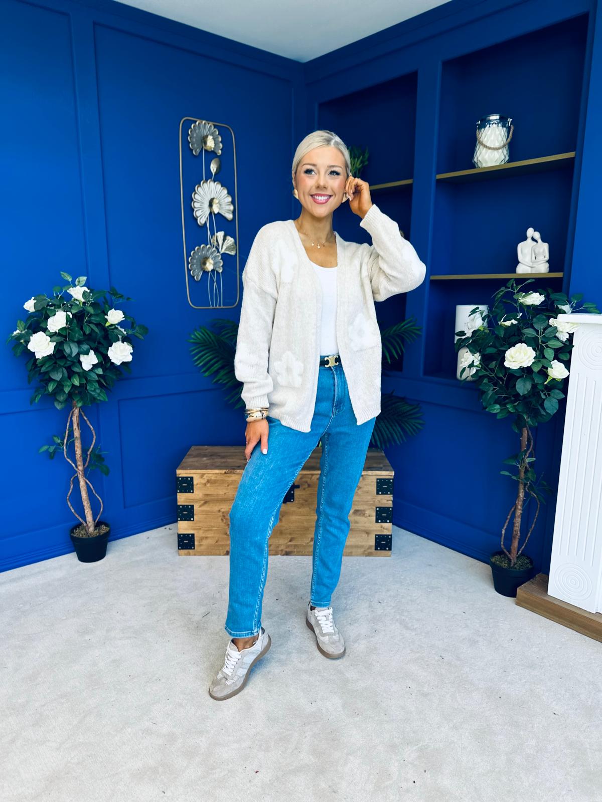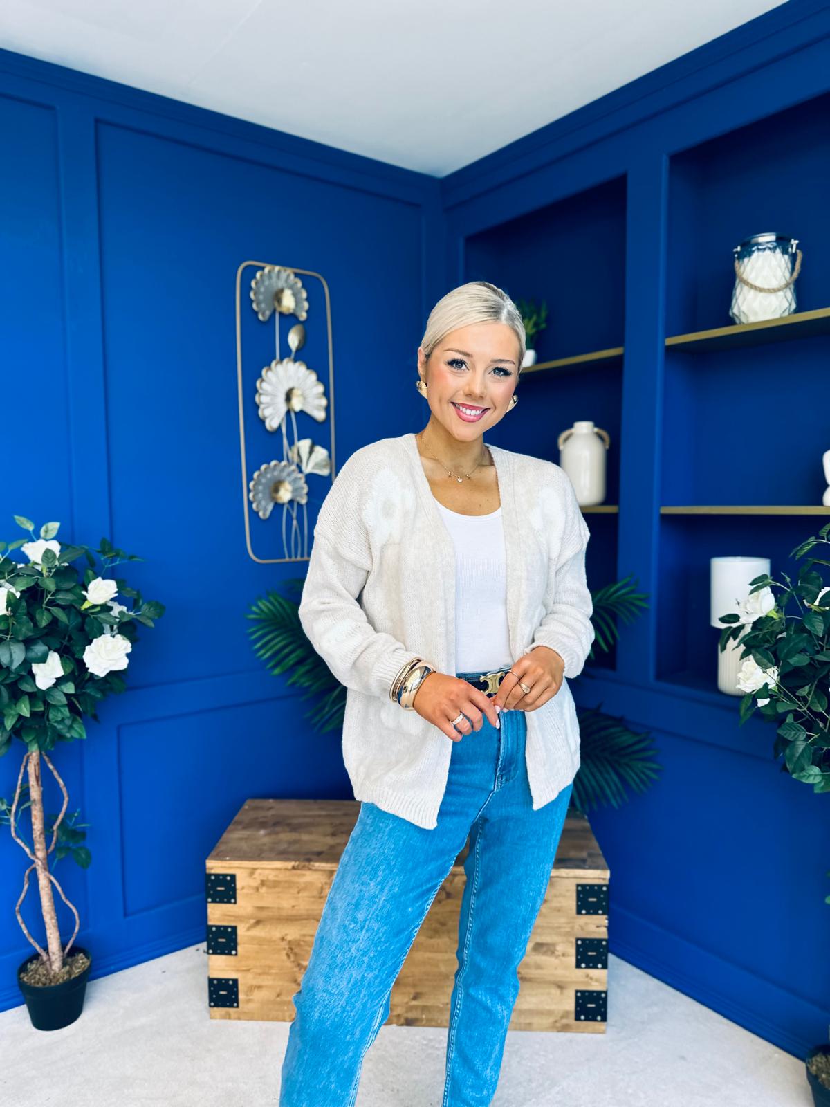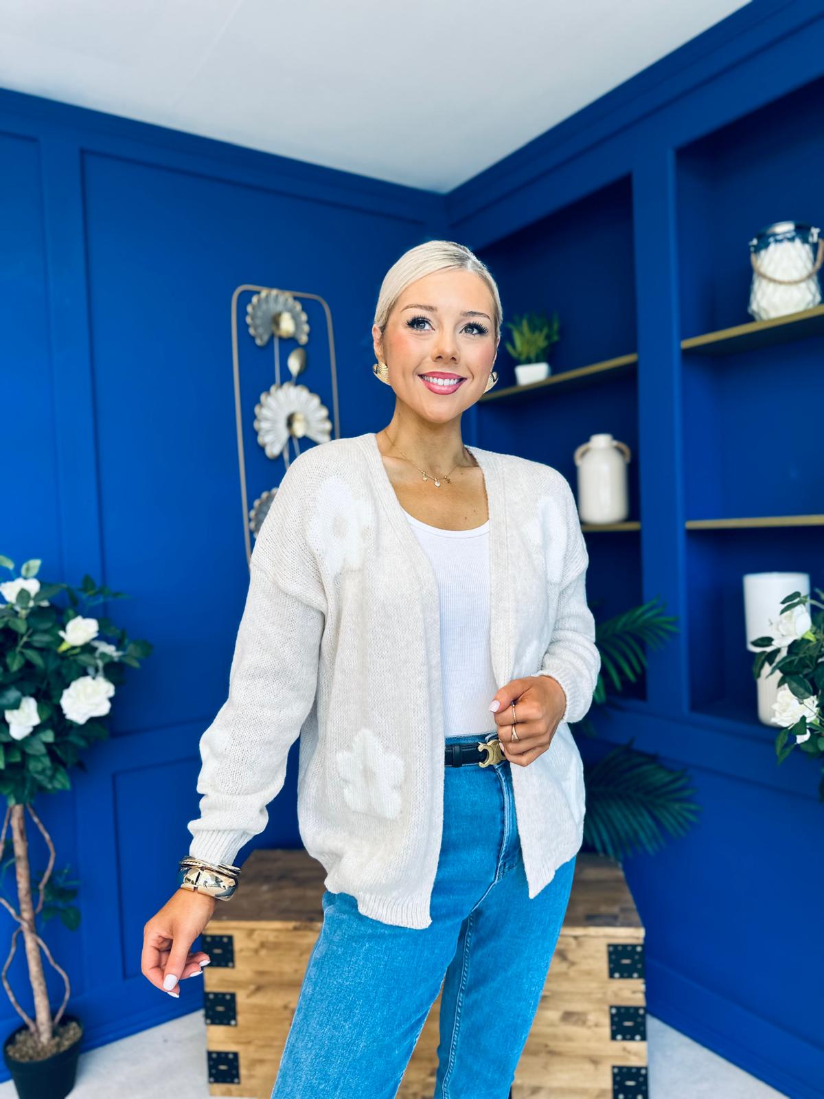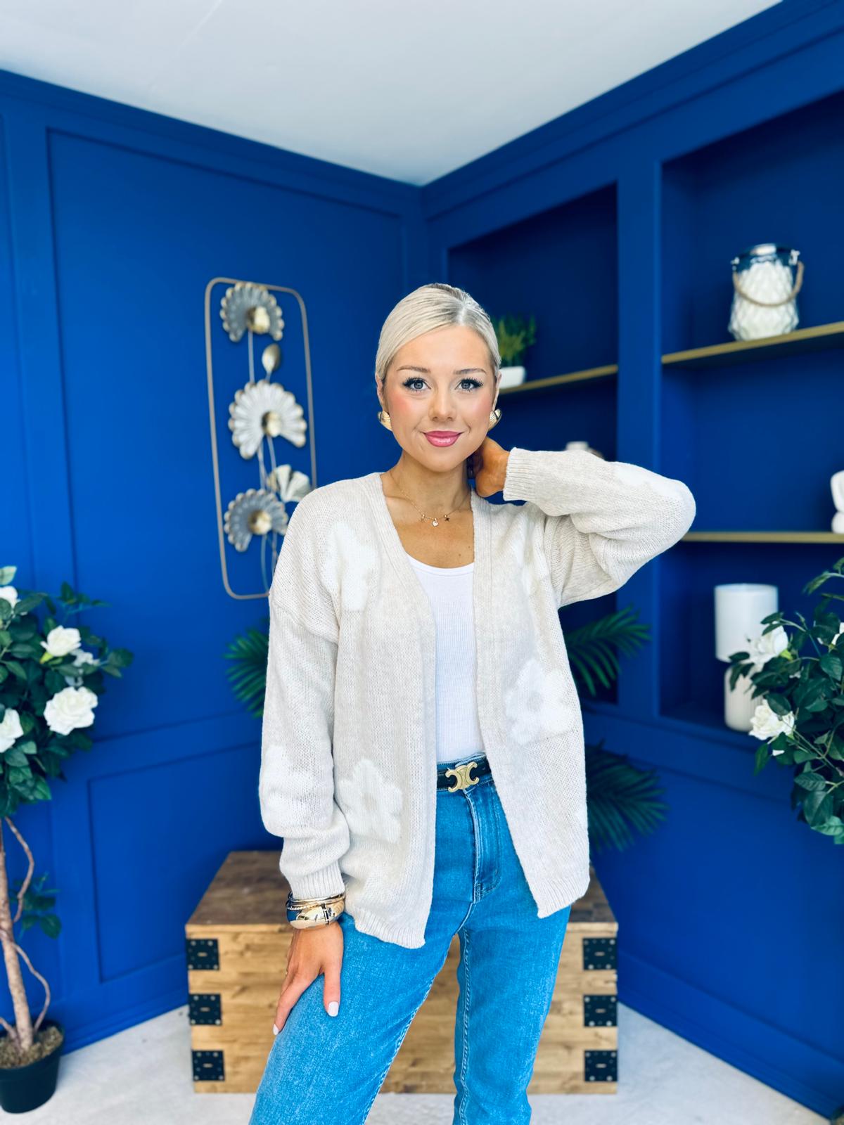 A gorgeous chunky knit cardi with floral detail to brighten up any outfit 👏