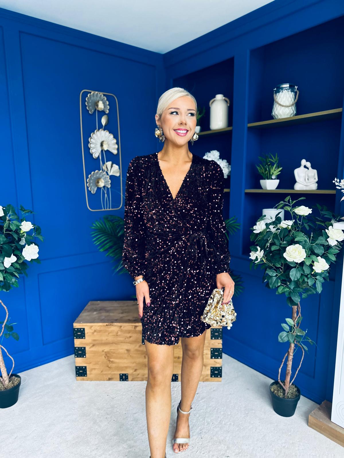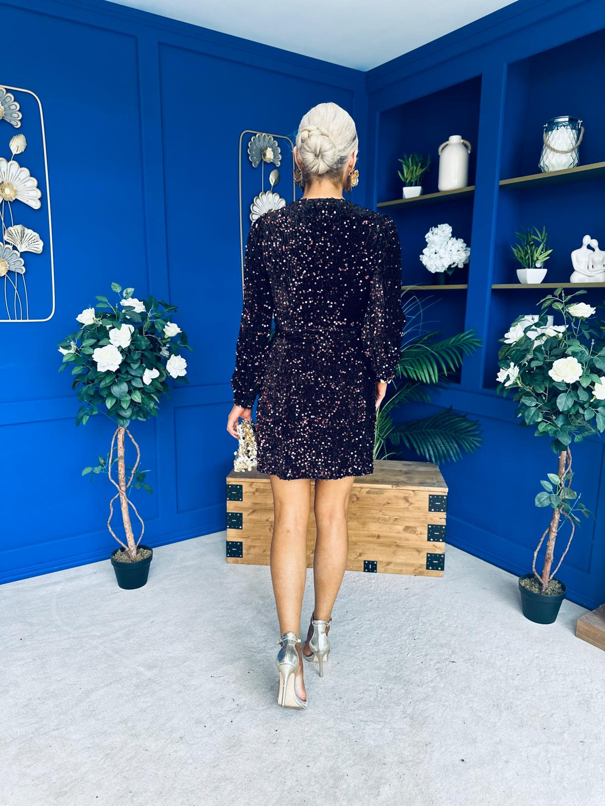 Stand out from the crowd in our new detailed sequin wrap mini dress.