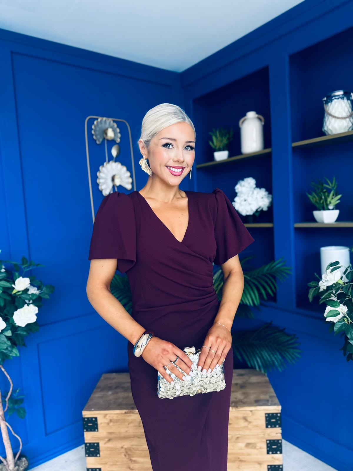 Freya Puff Sleeve Wrap Neck Ruched Midi Plum