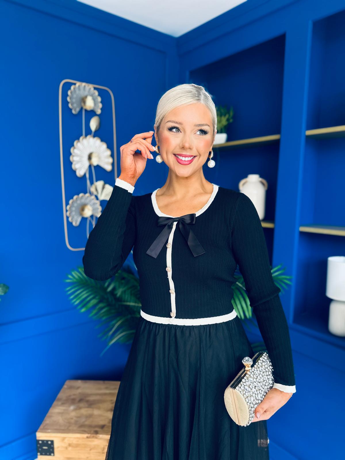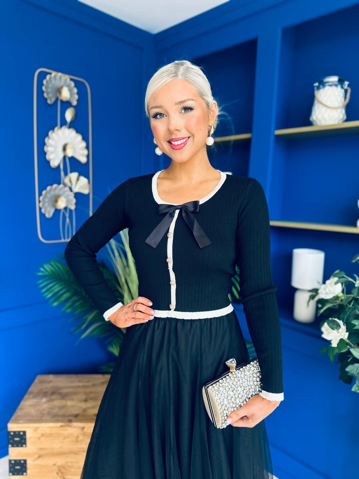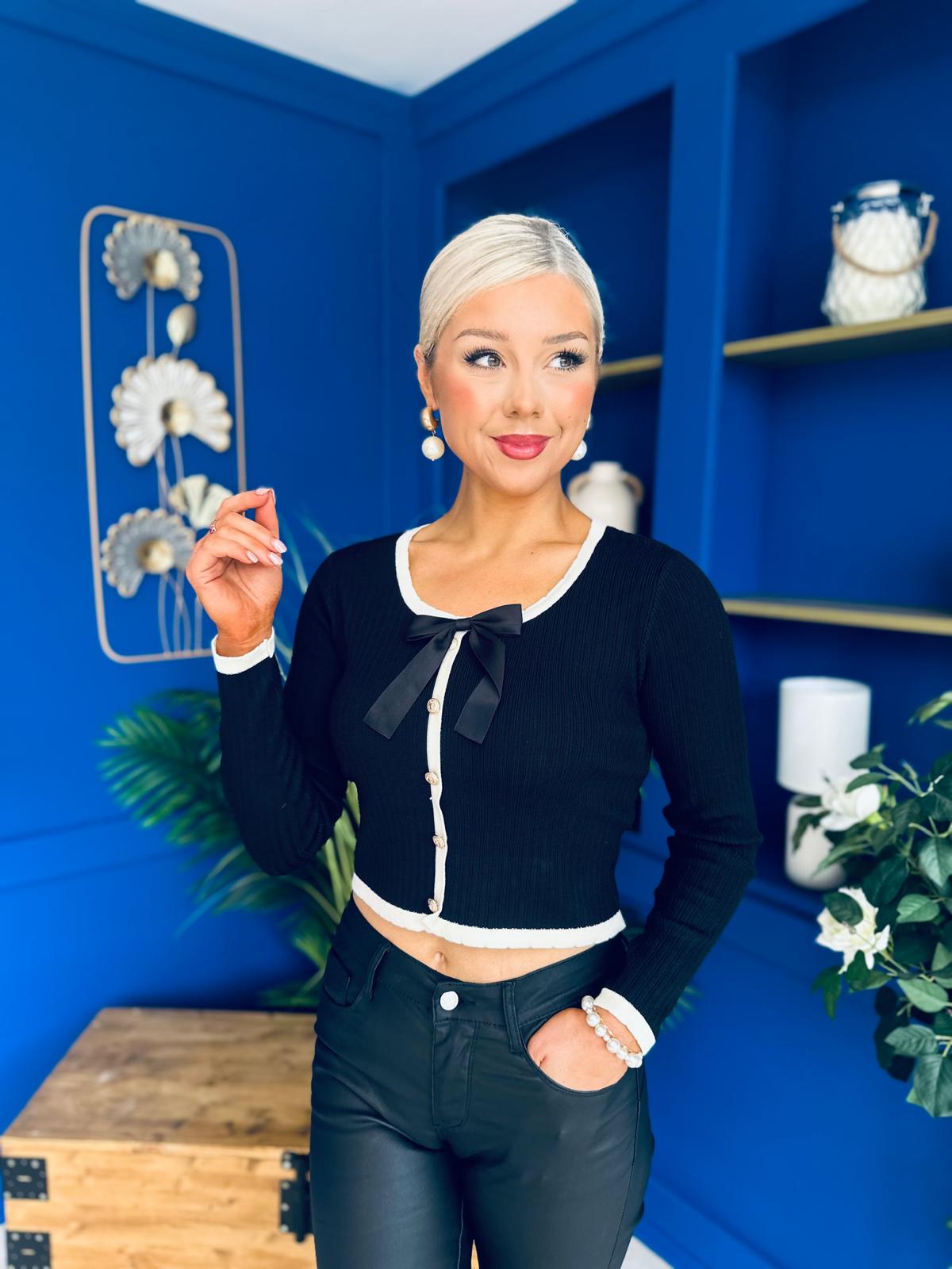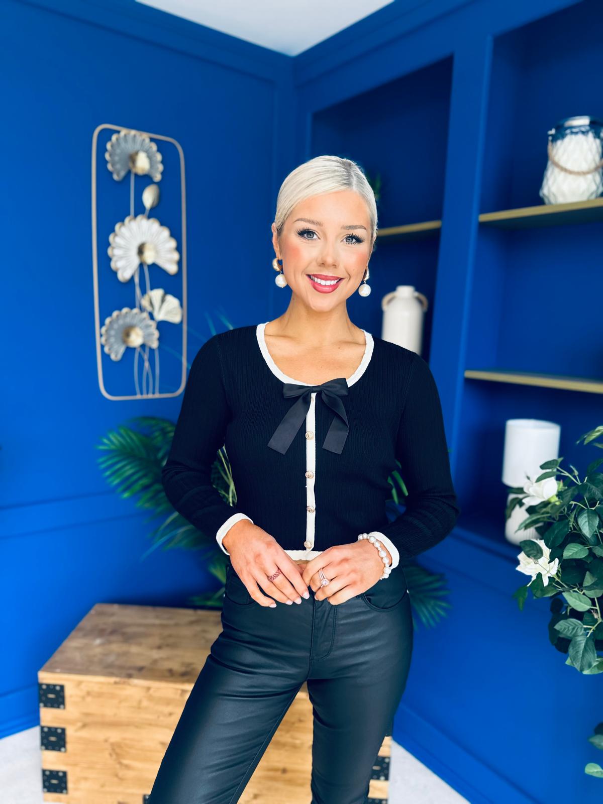 Super soft knit material. Complete with faux button down detail, bow neckline detail with a full length sleeve
