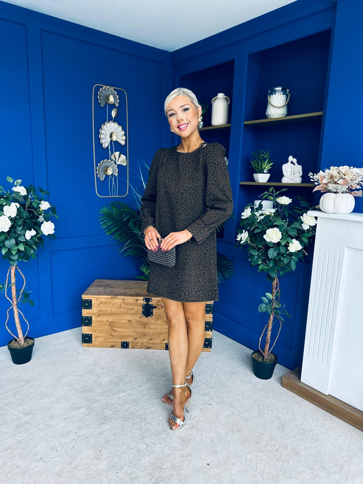 Crafted in a shape holding material, gold button detailing, full bell sleeve, matching belt and flowing skirt create a stand out look