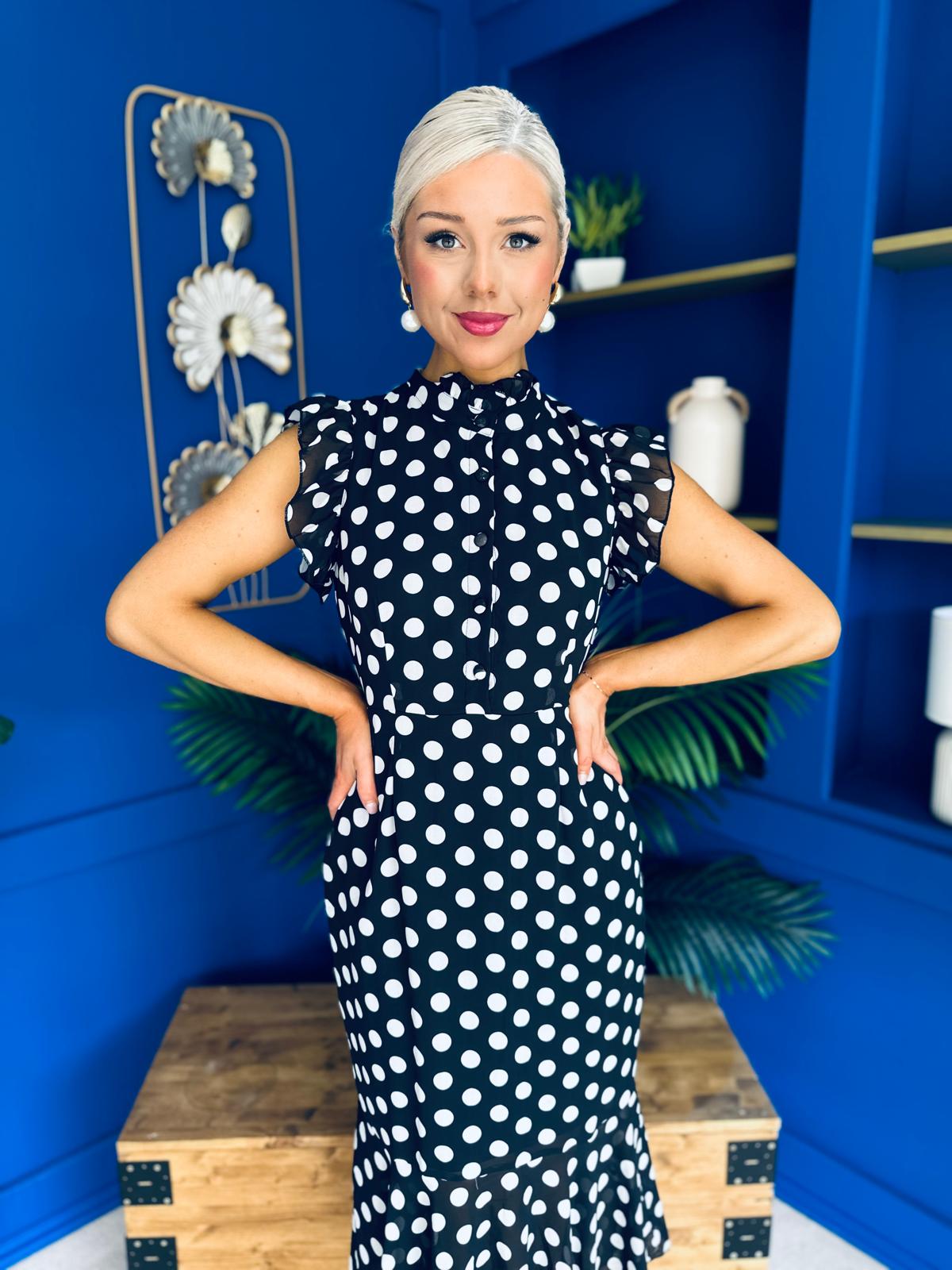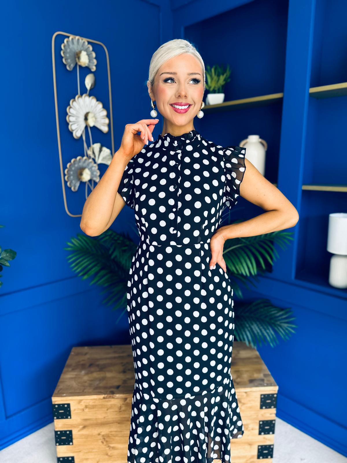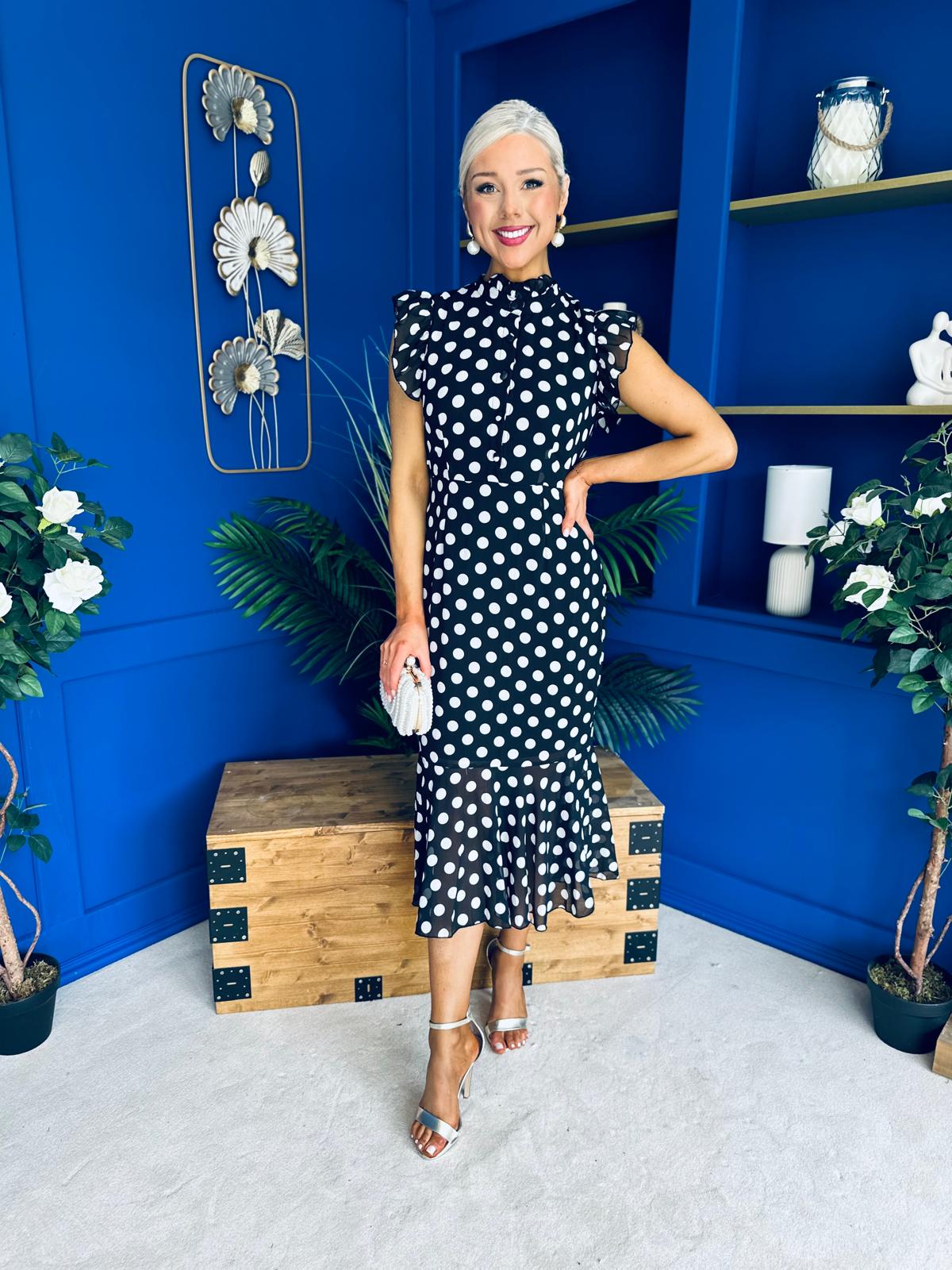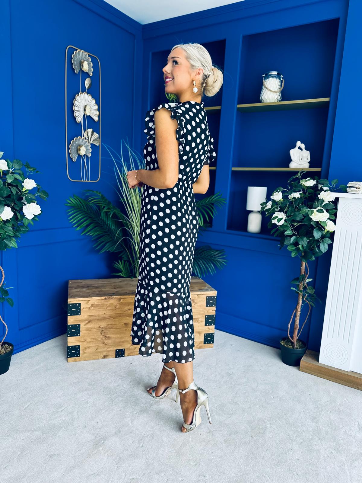 Hannah Frill Sleeve Button Front Midi Dress Black Polka