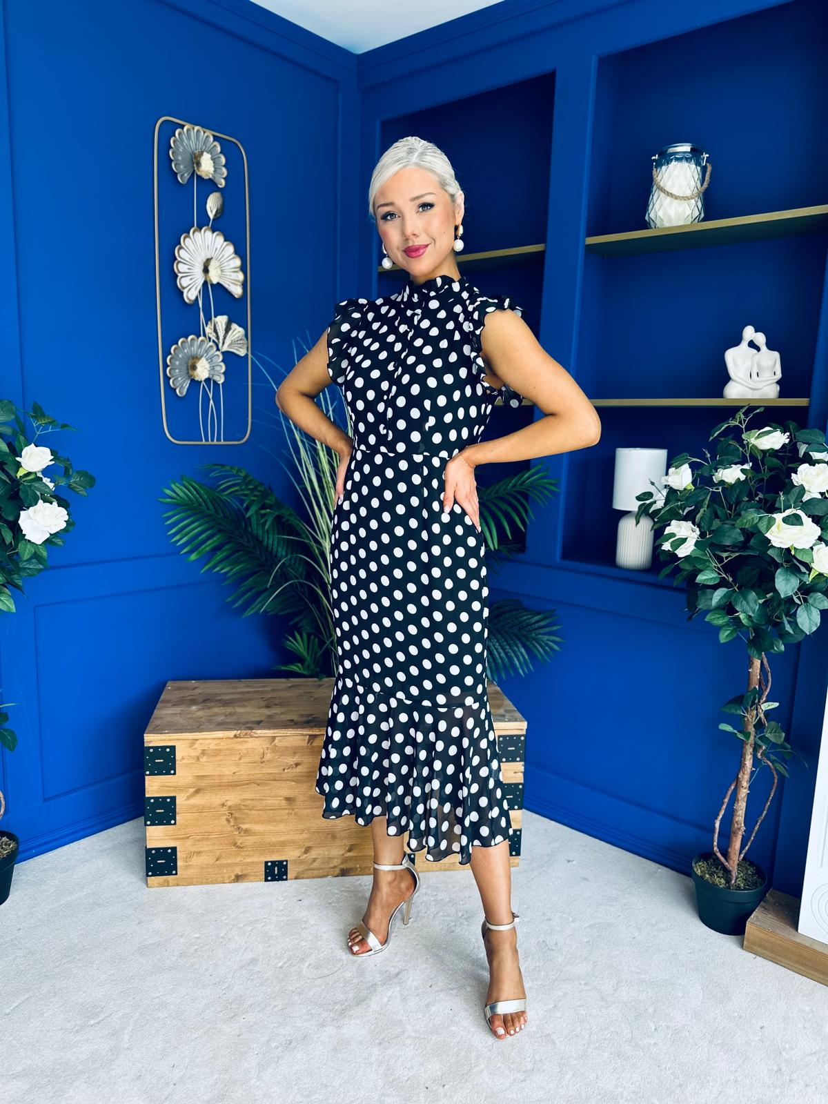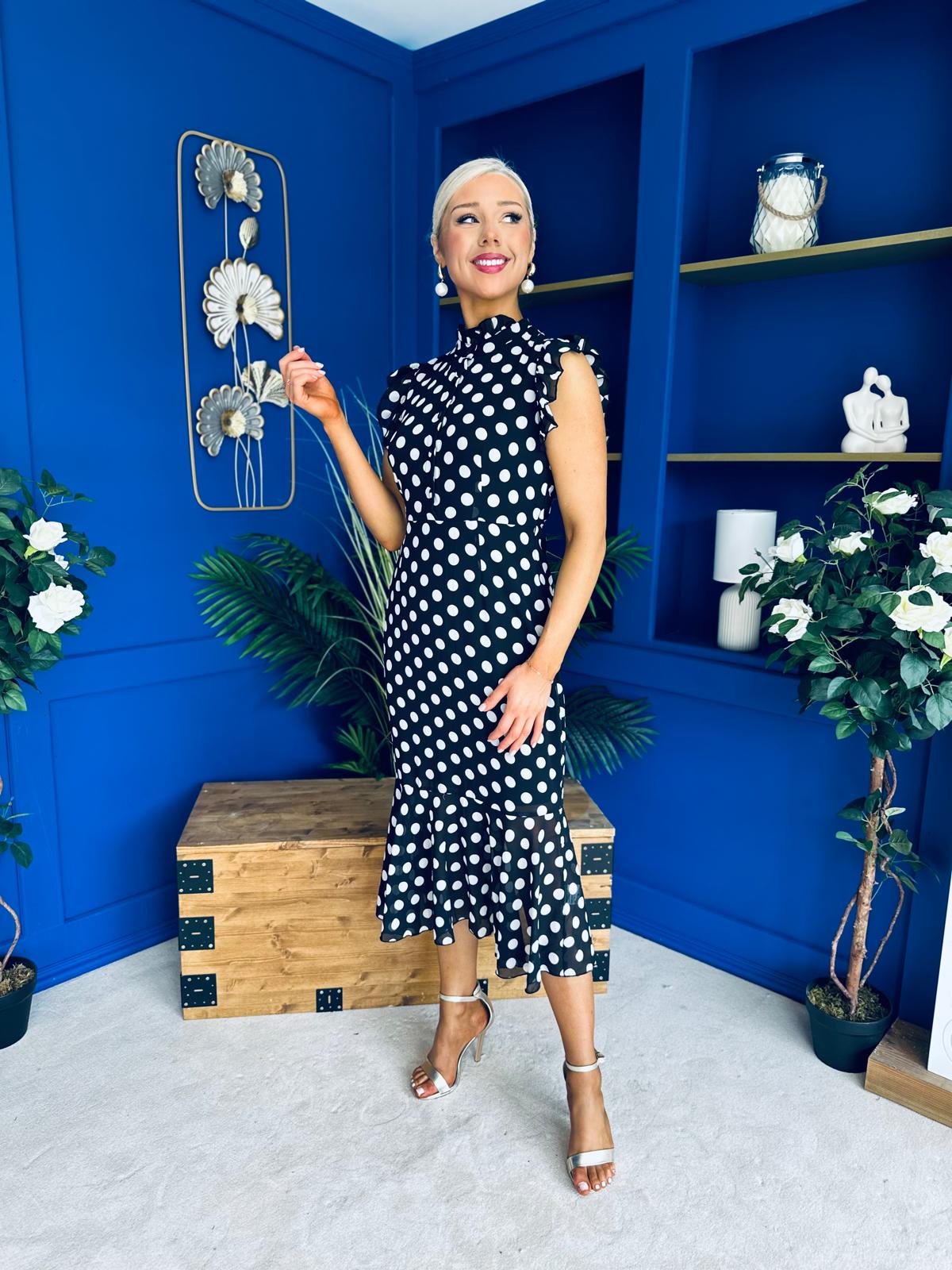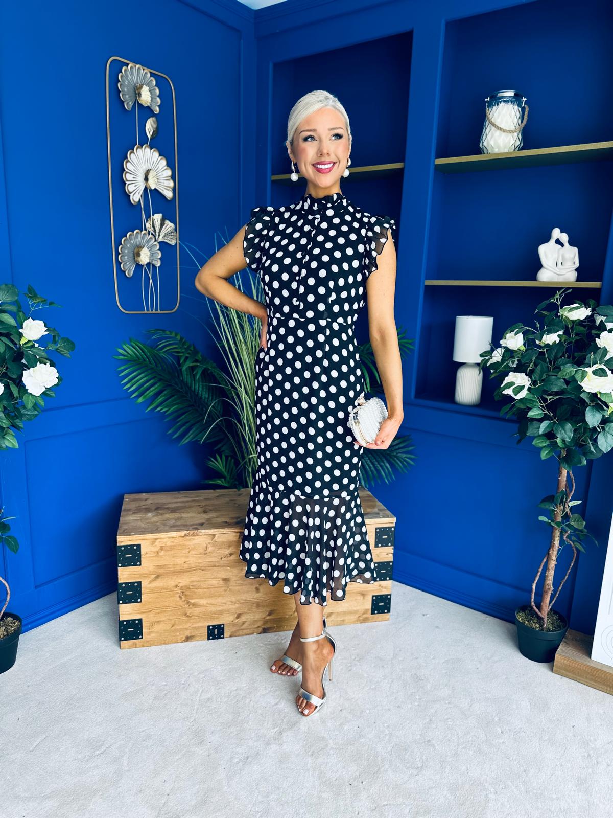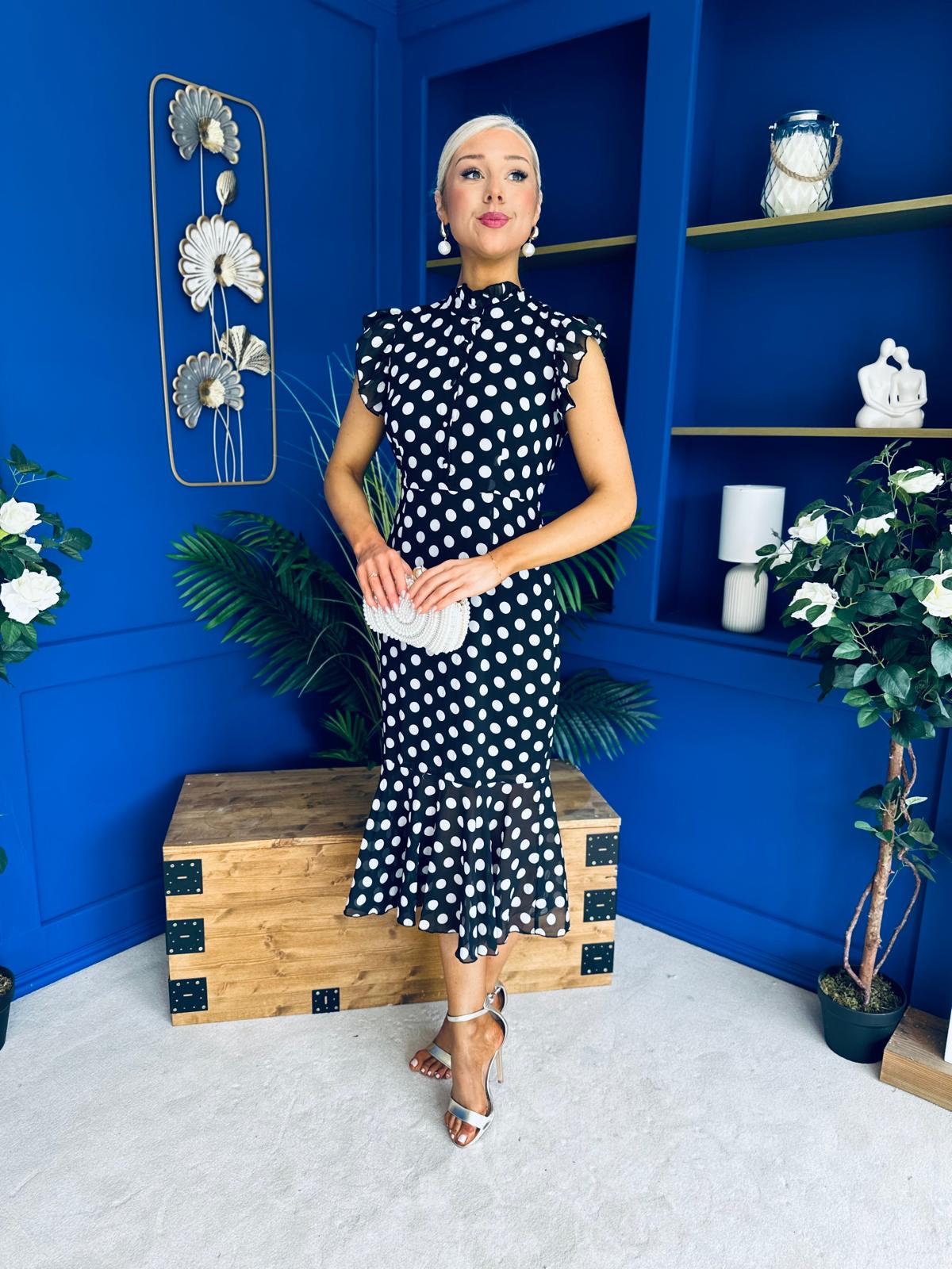 Hannah Frill Sleeve Button Front Midi Dress Black Polka