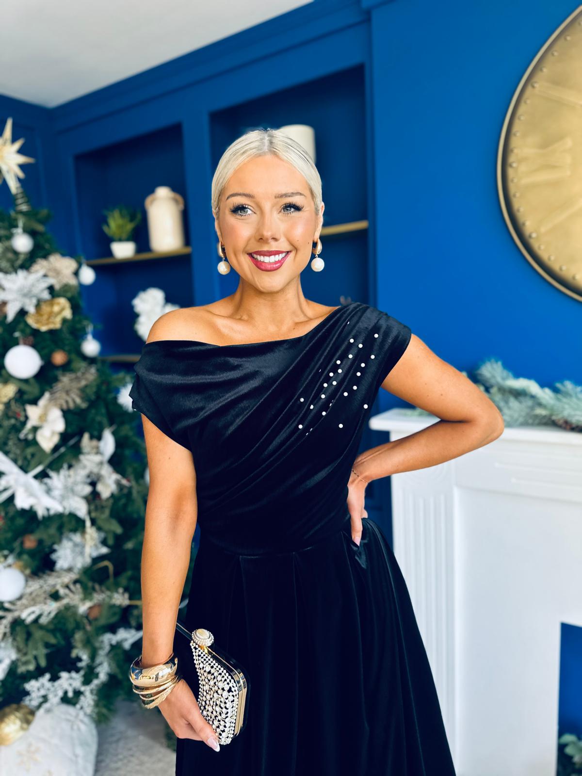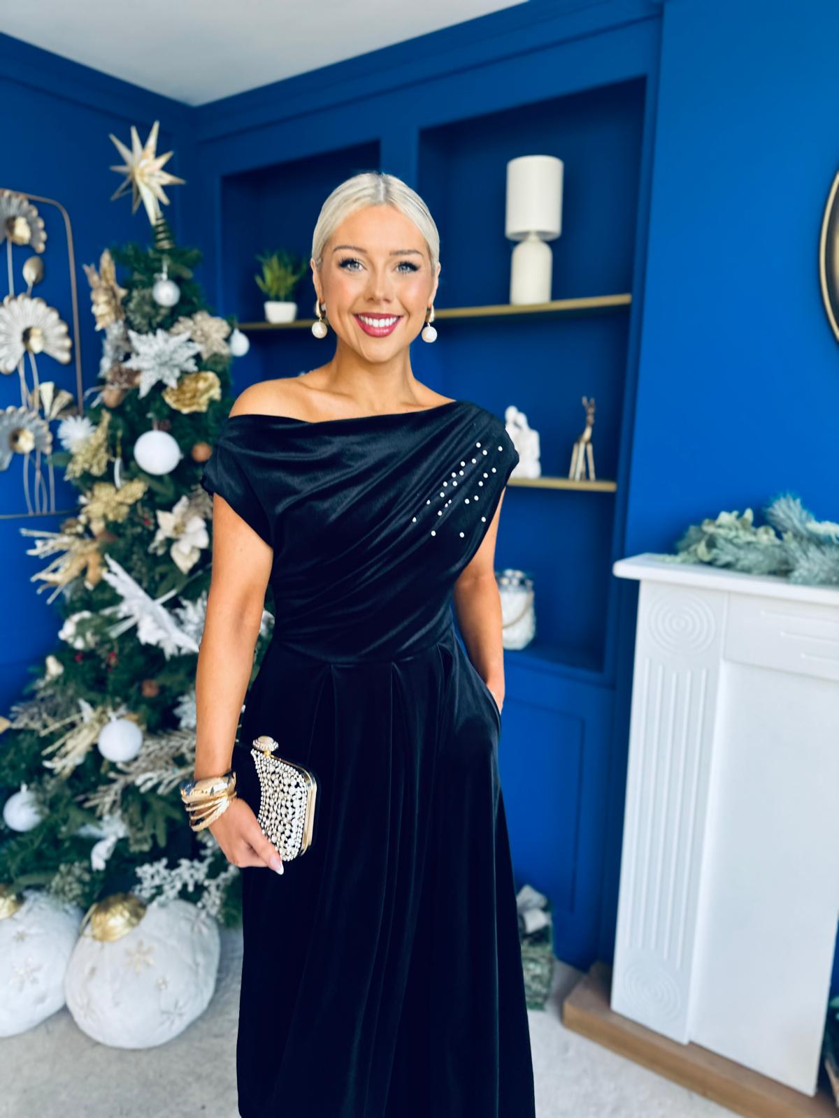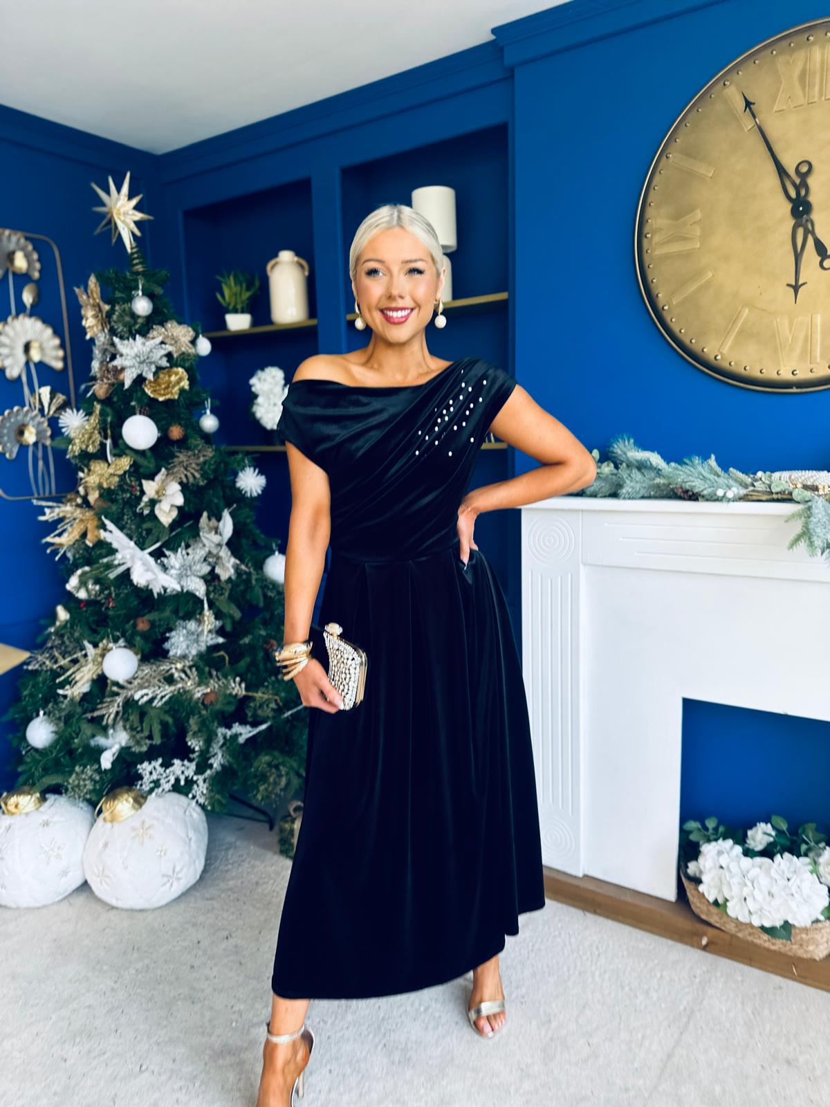 Our new Harriet velvet dress with asymmetric neckline, Pearl detail to bust & box pleat skirt is simply fabulous
