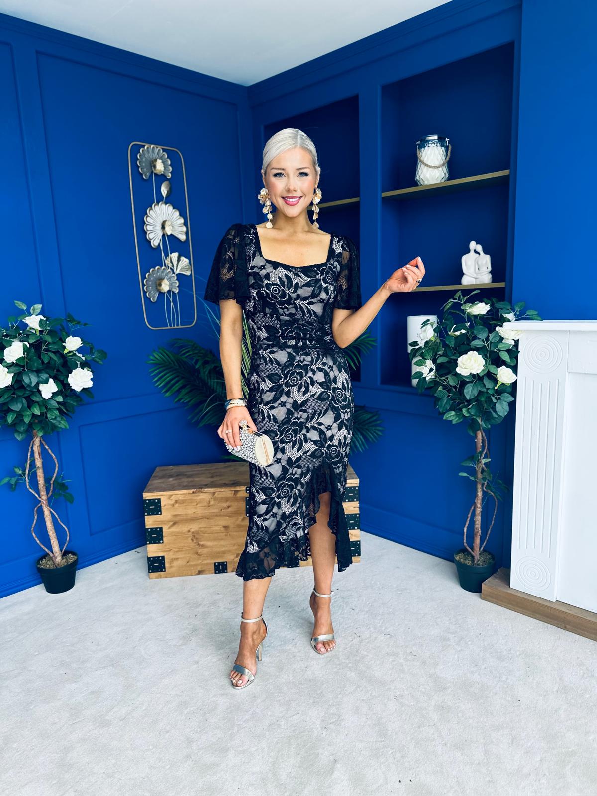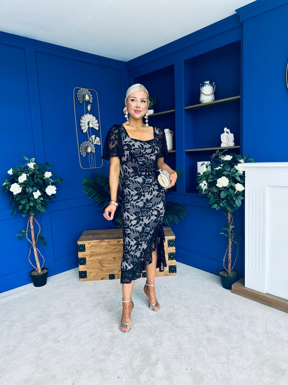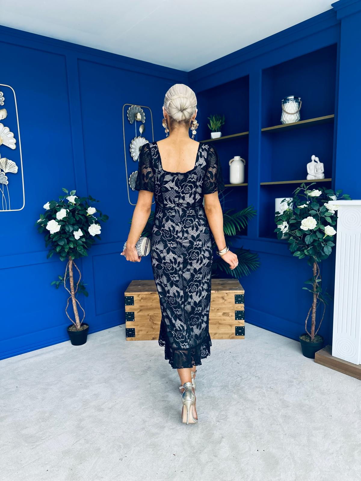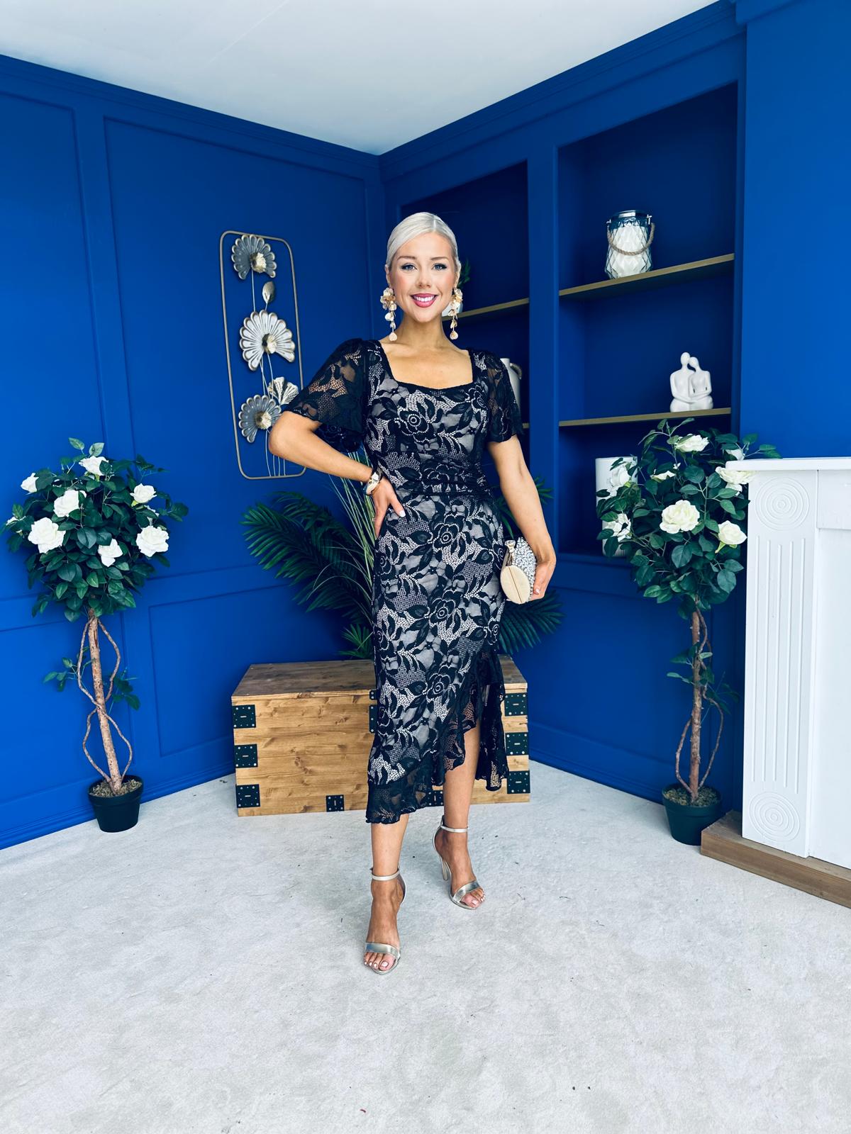 Heidi Ruched Occasion Midi Dress Lace Nude & Black