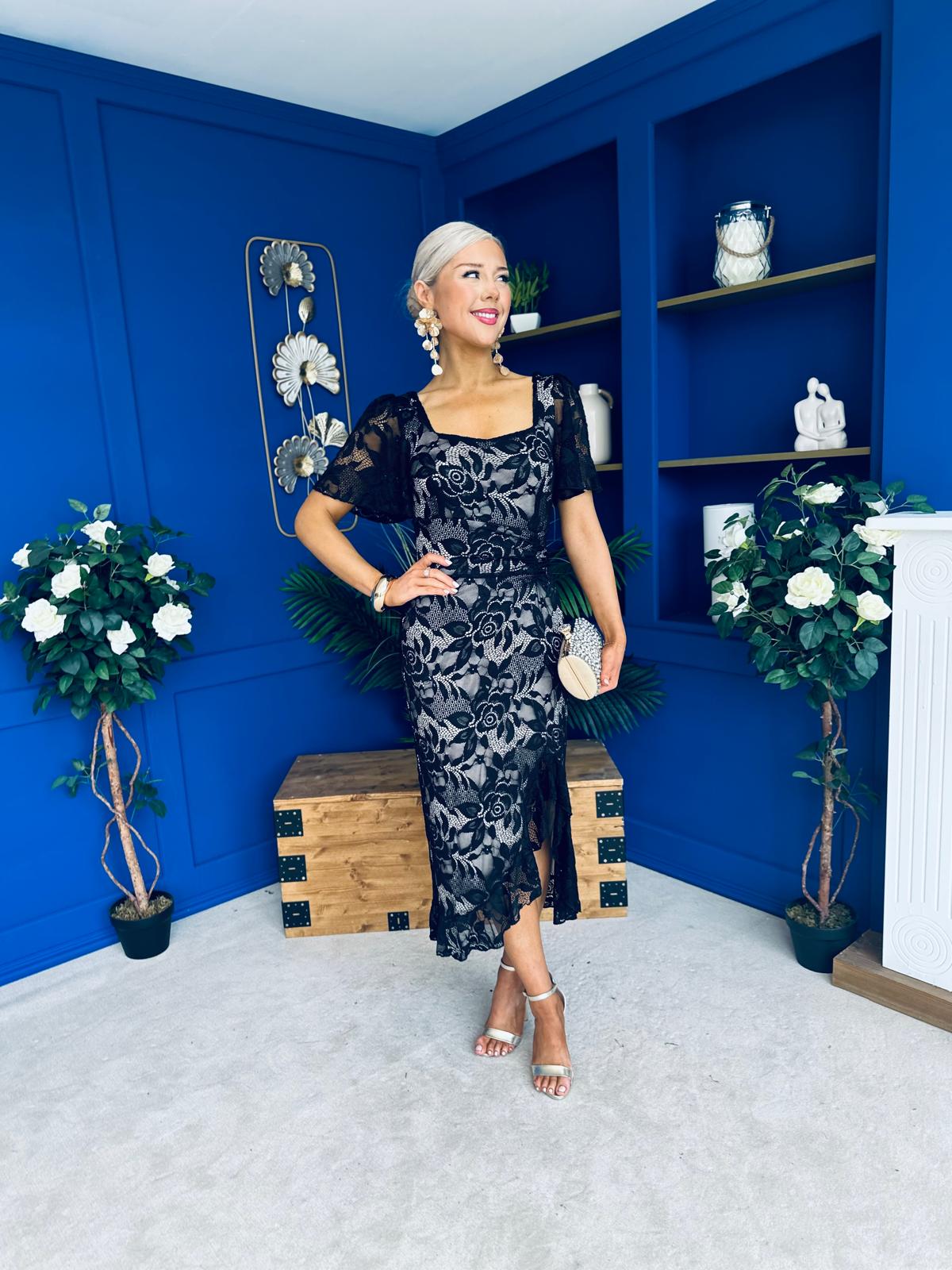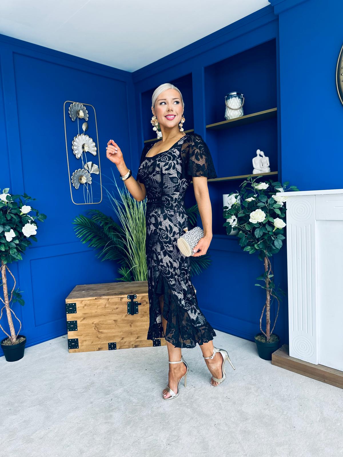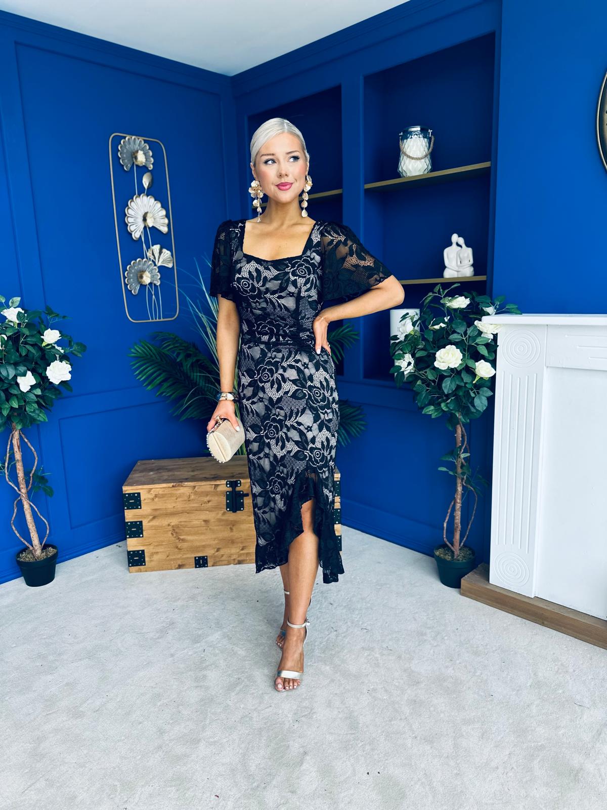 Heidi Ruched Occasion Midi Dress Lace Nude & Black