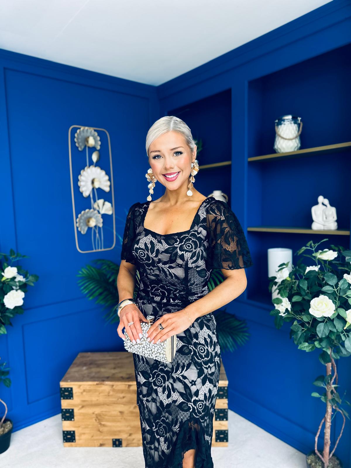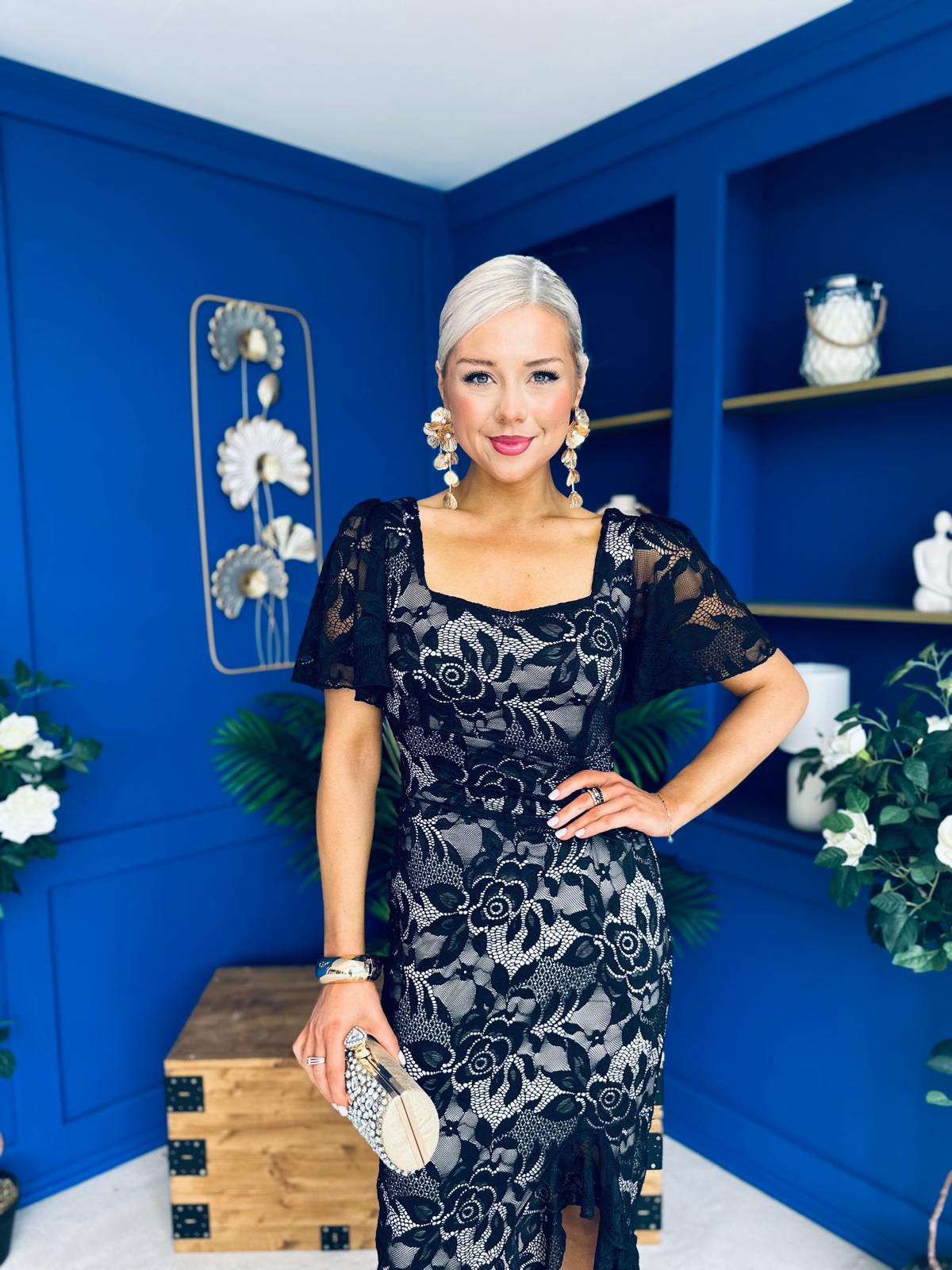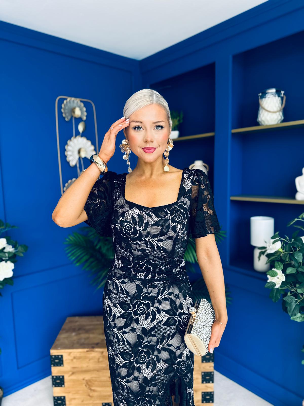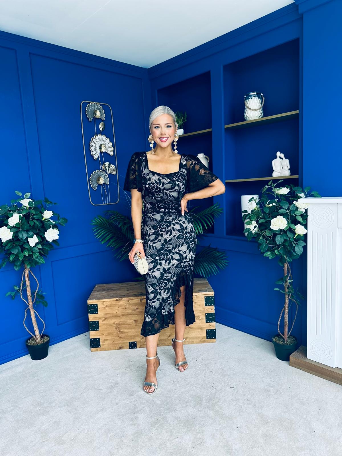 Heidi Ruched Occasion Midi Dress Lace Nude & Black