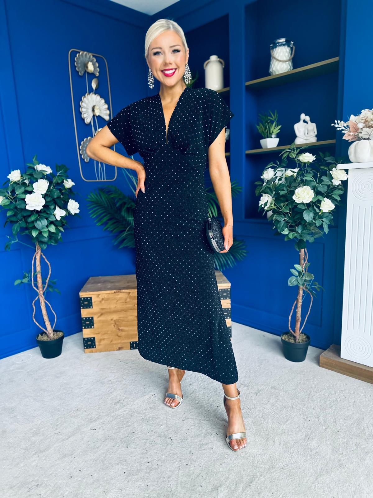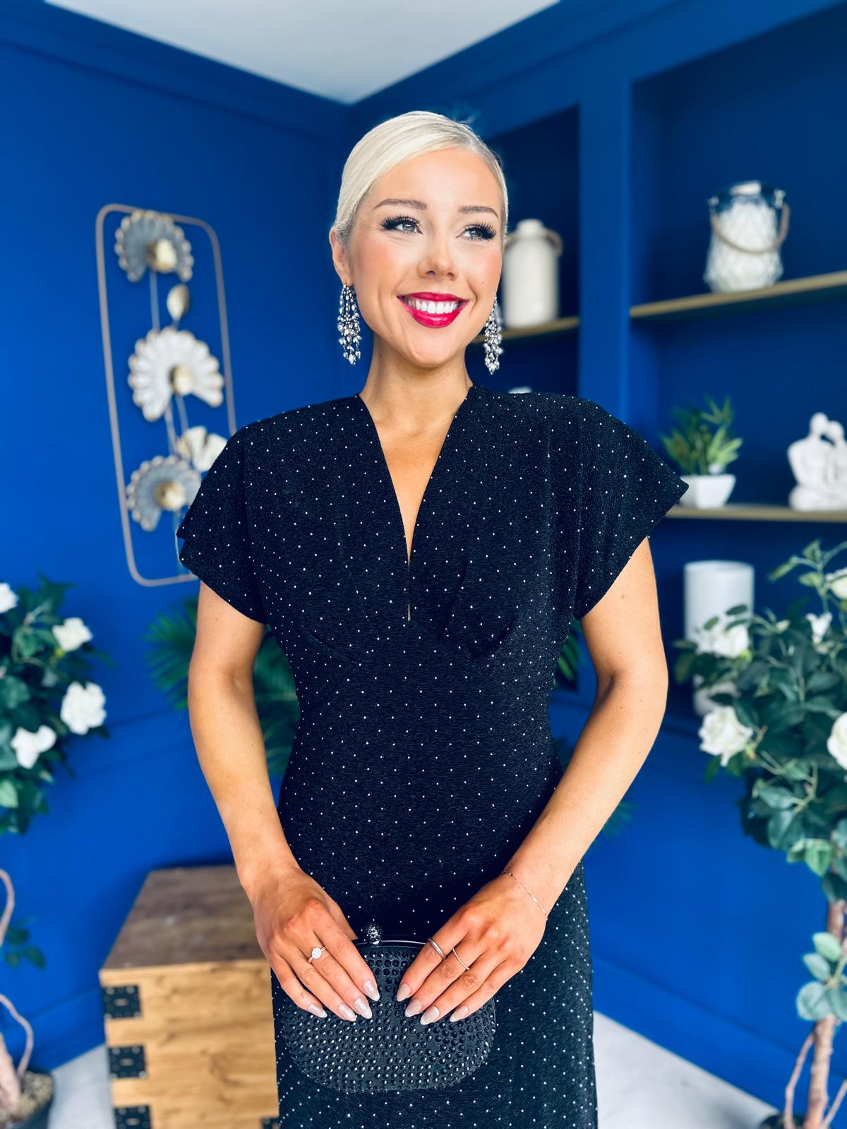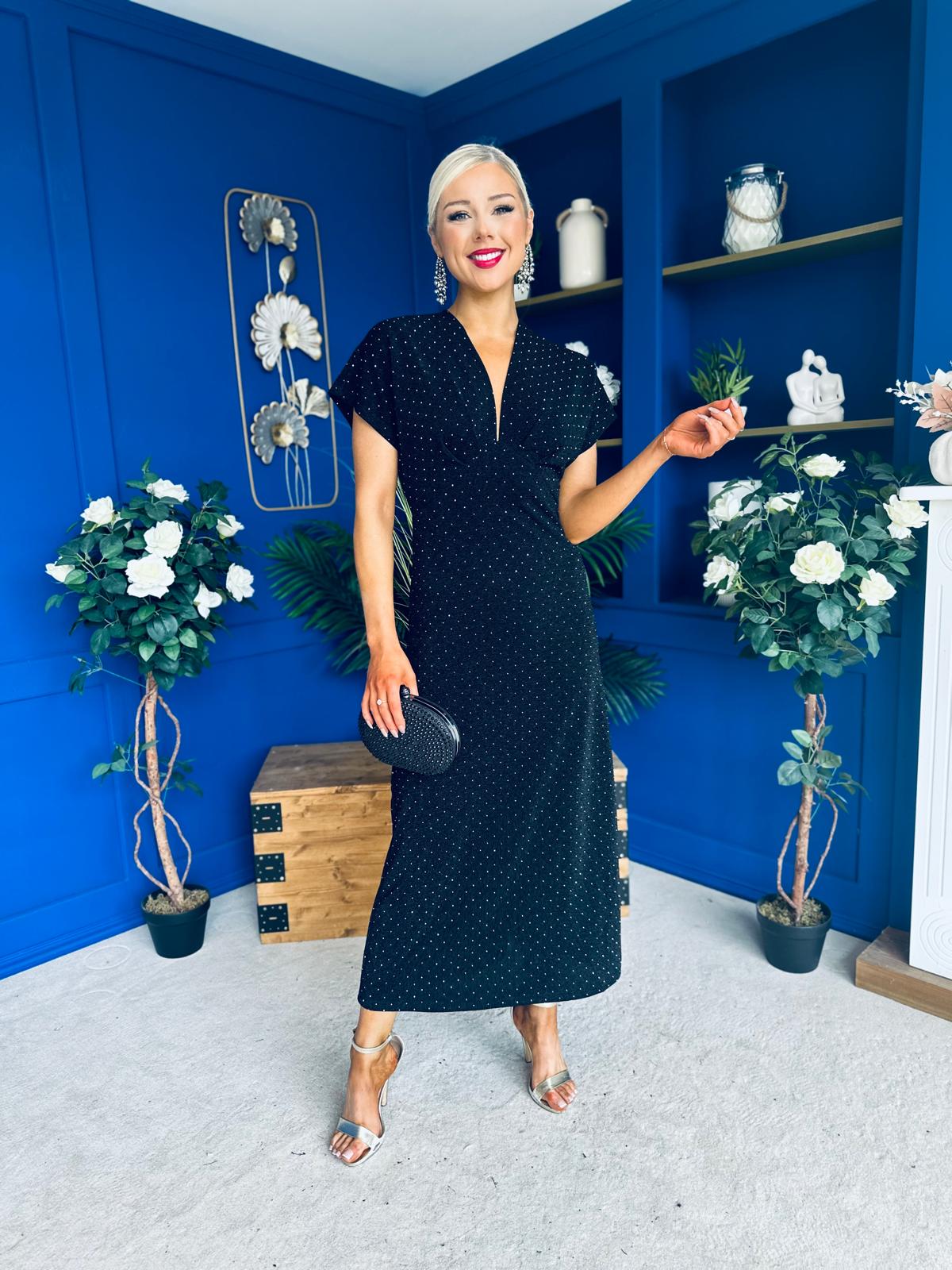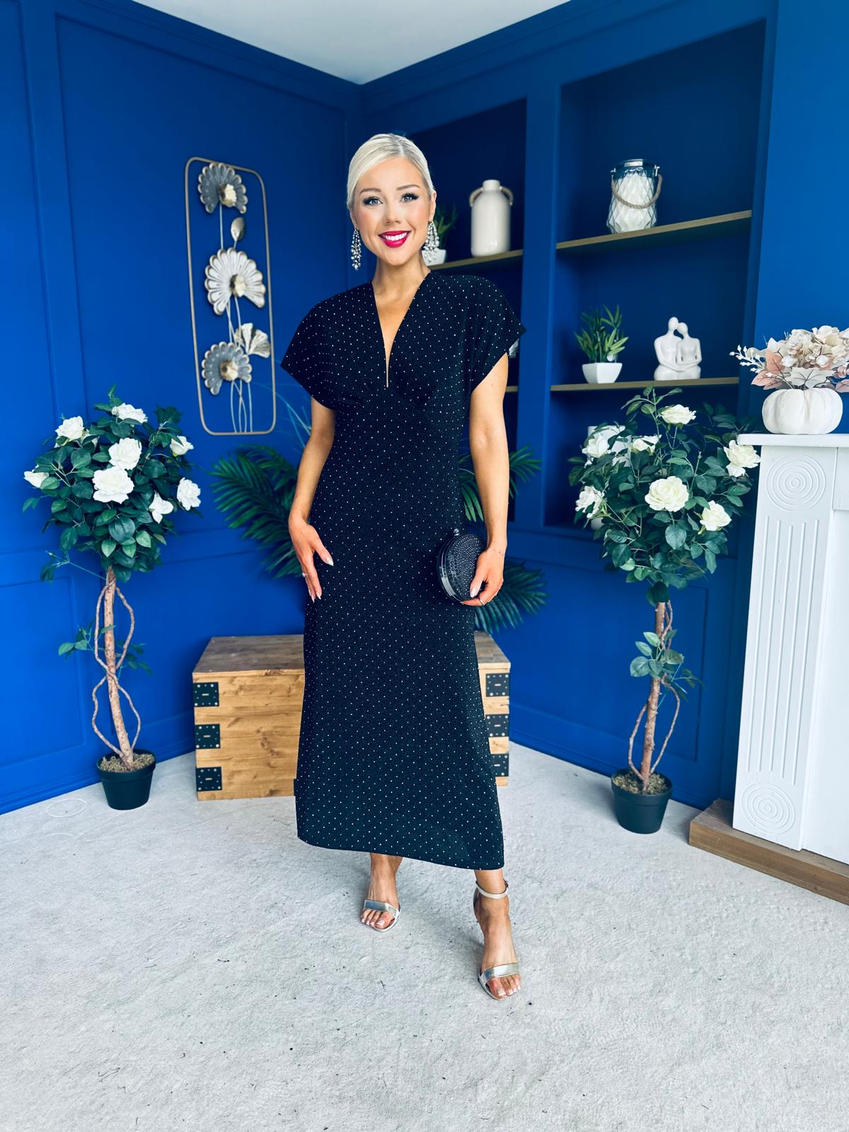 This fabulous piece boasts a vibrant shimmer with metallic stud that will turn heads at any event.
