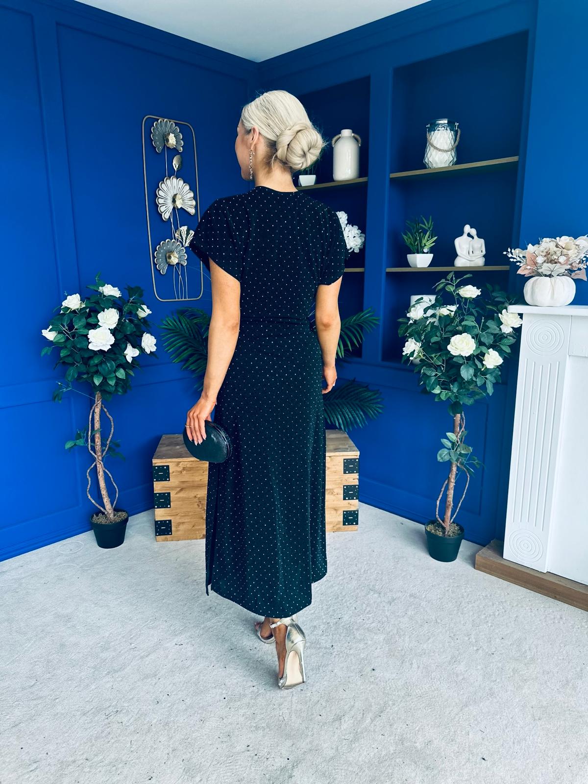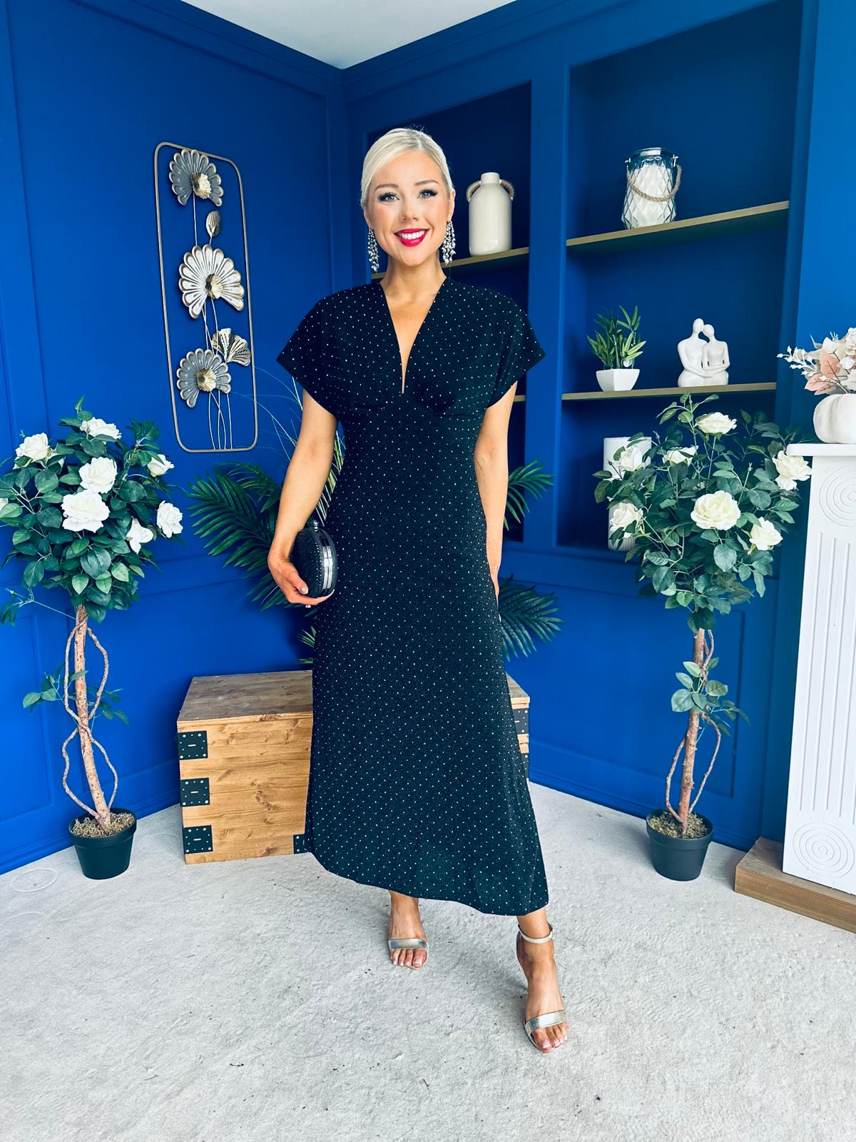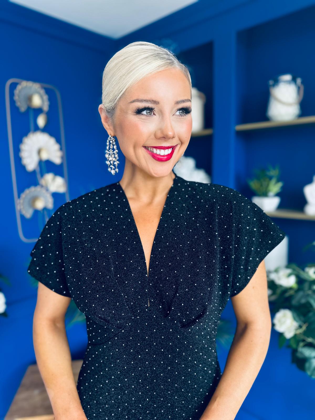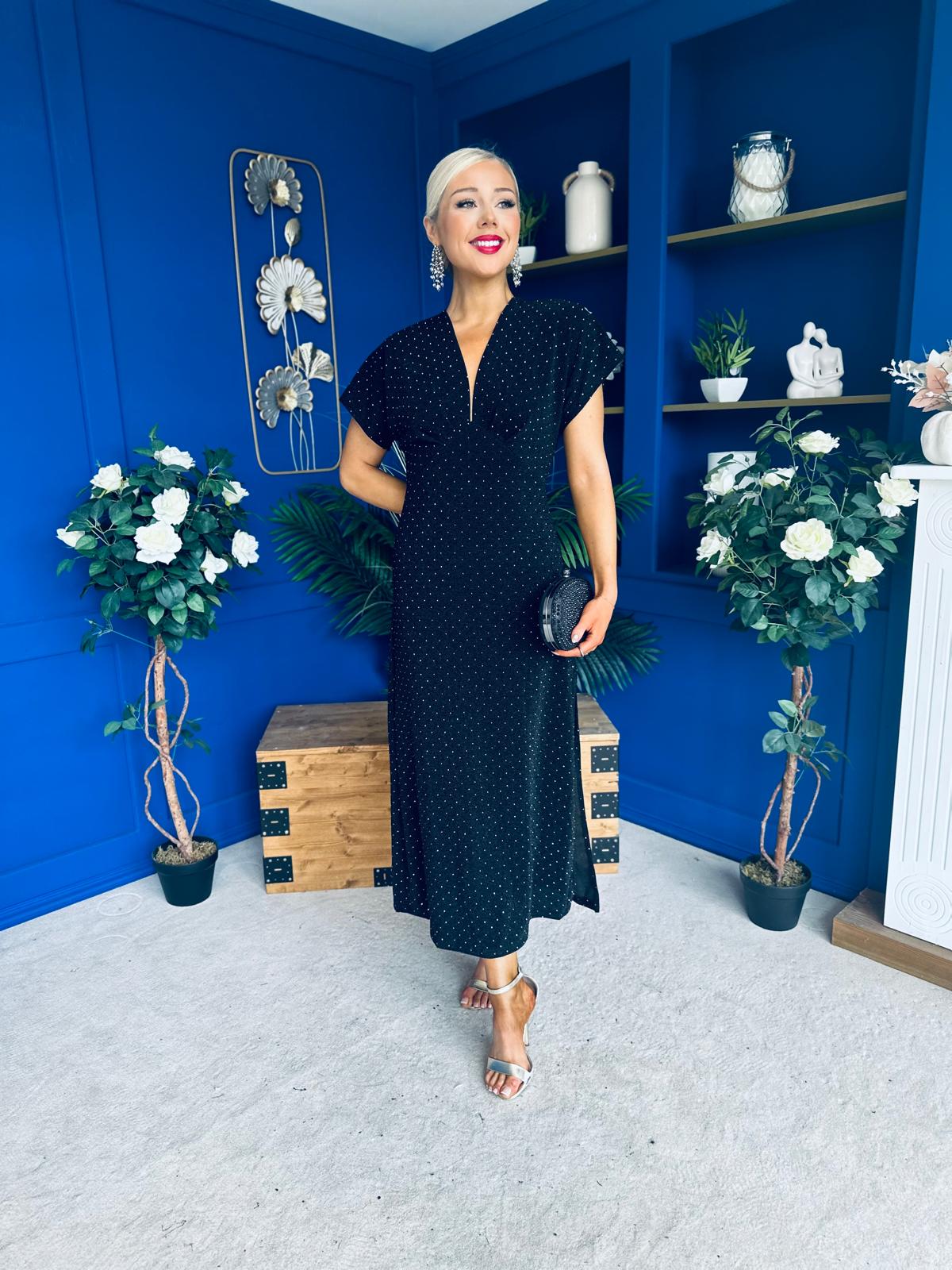 This fabulous piece boasts a vibrant shimmer with metallic stud that will turn heads at any event.