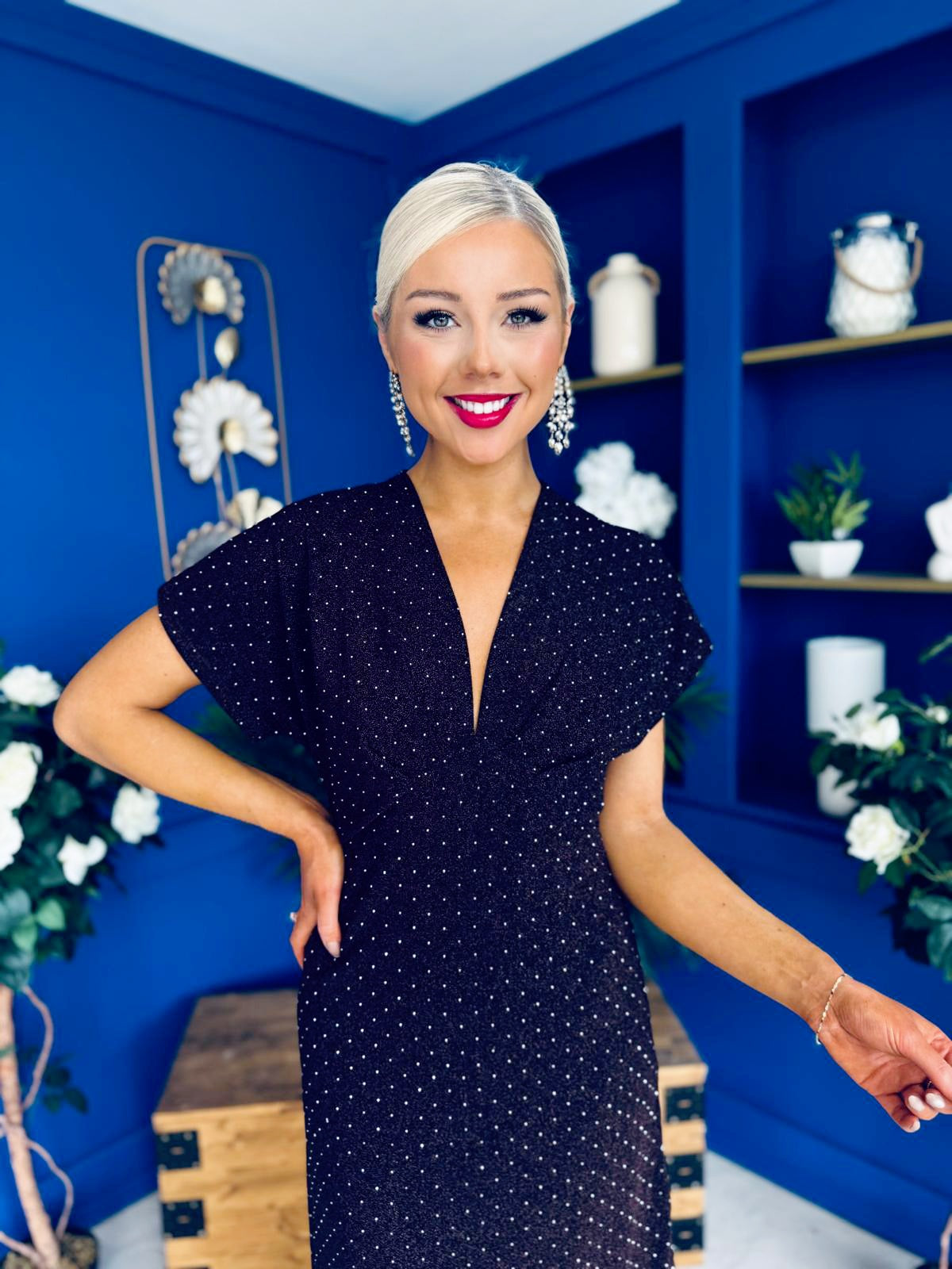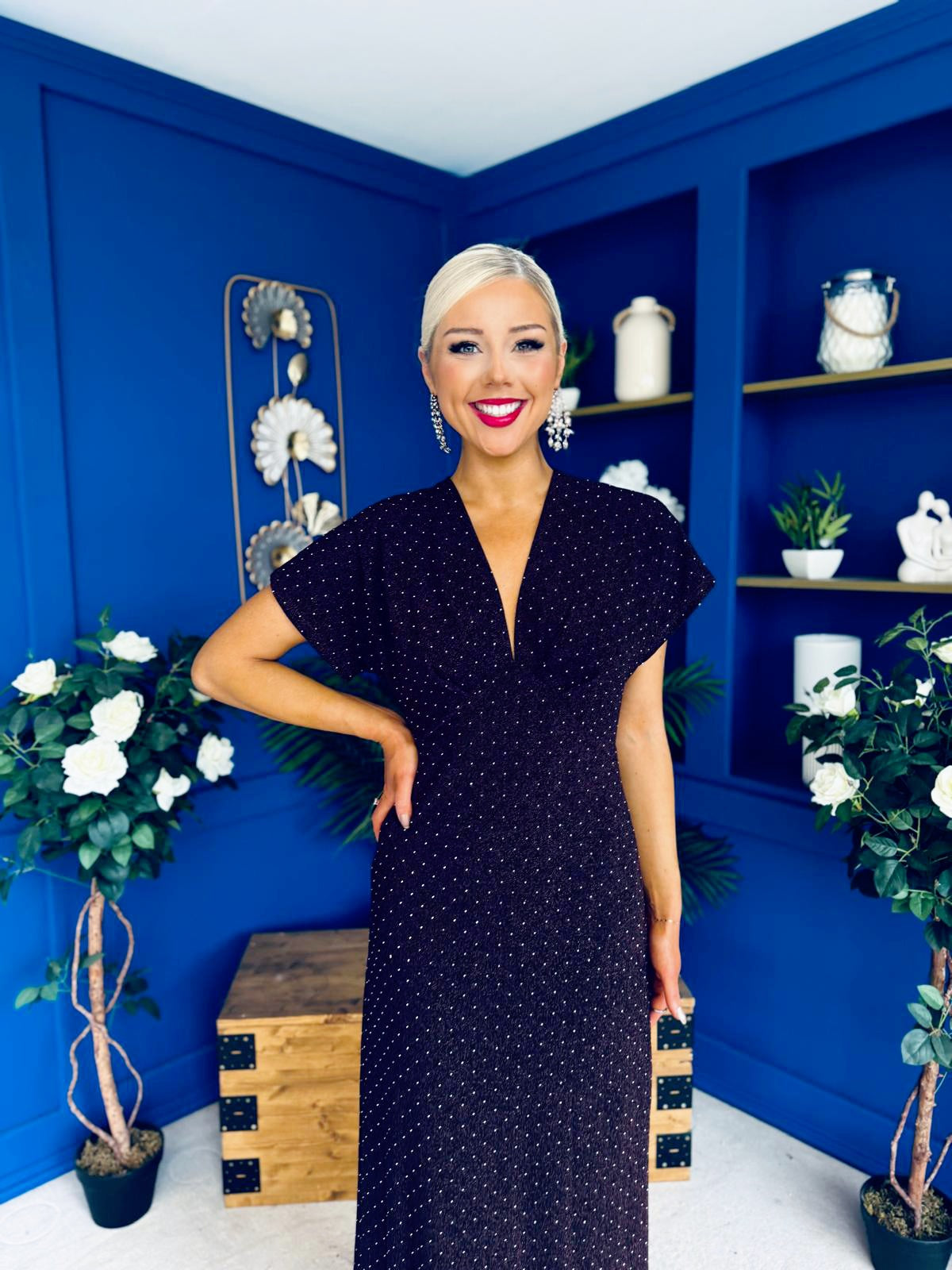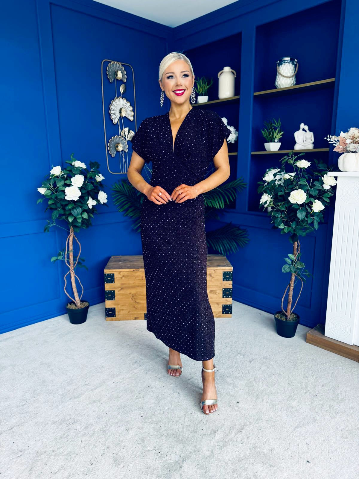 This fabulous piece boasts a vibrant shimmer with metallic stud that will turn heads at any event.
