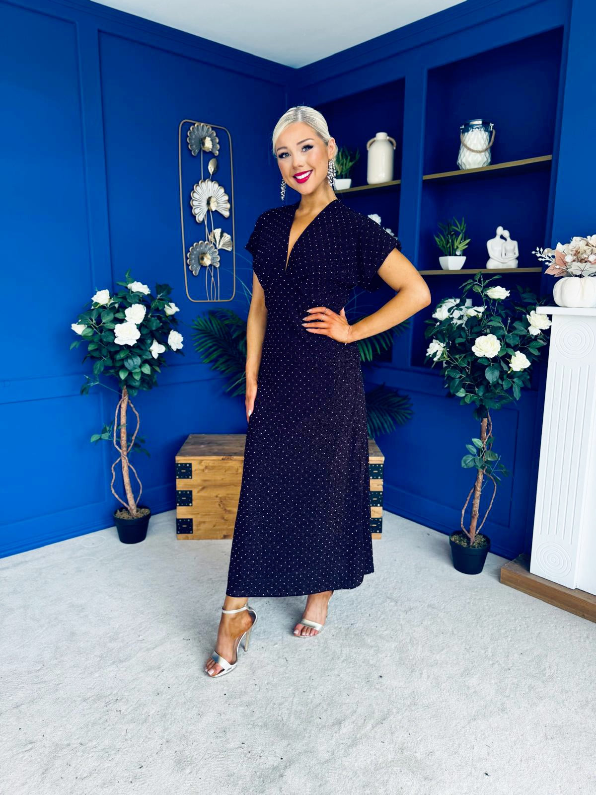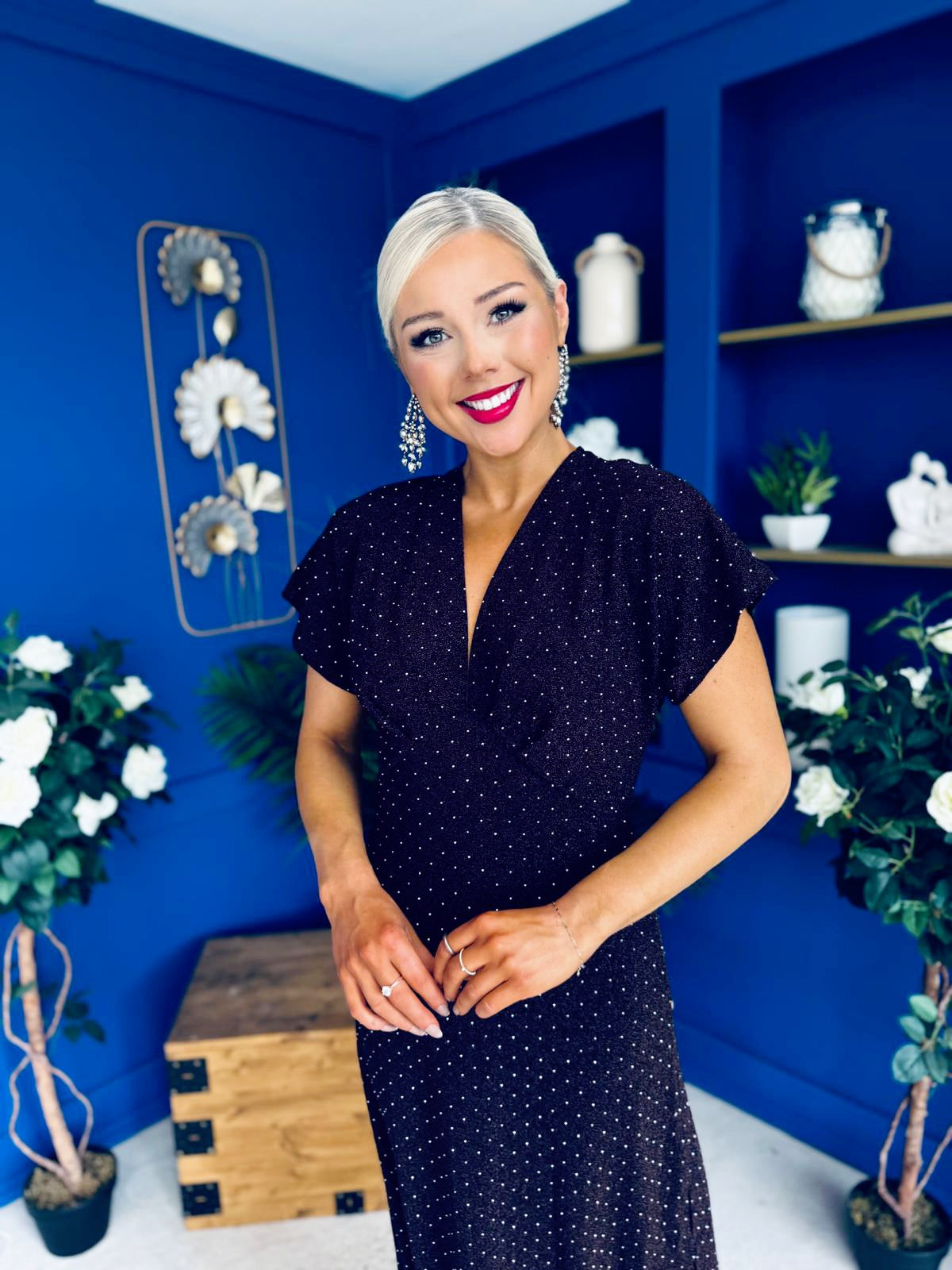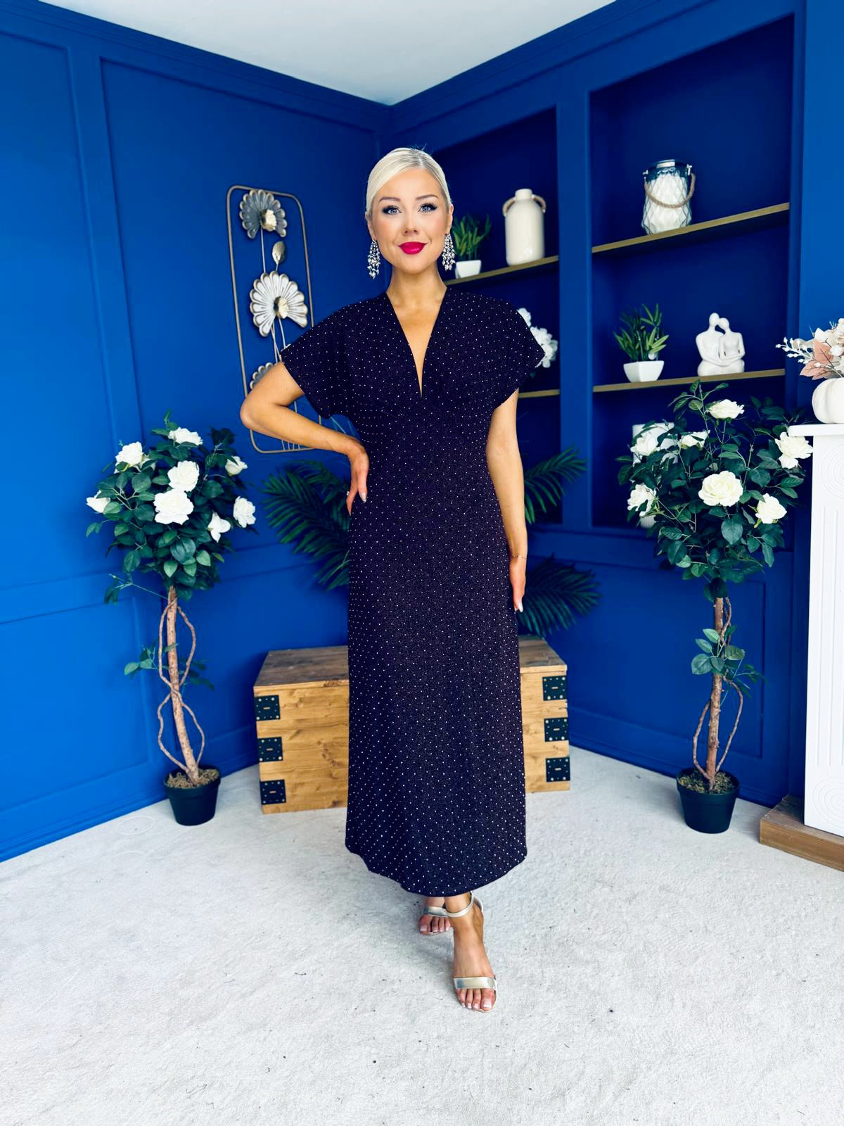 This fabulous piece boasts a vibrant shimmer with metallic stud that will turn heads at any event.