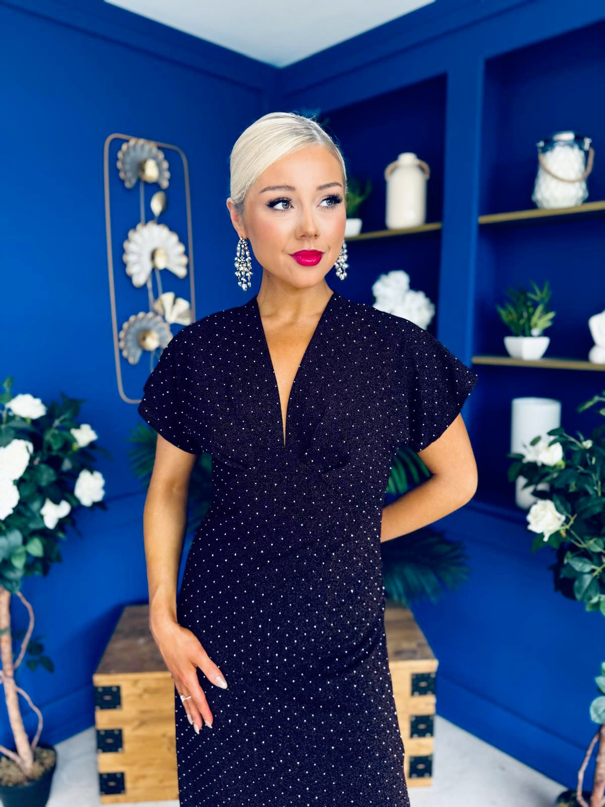 The length and angel sleeve add a touch of elegance while the shimmer fabric will have all eyes on you.