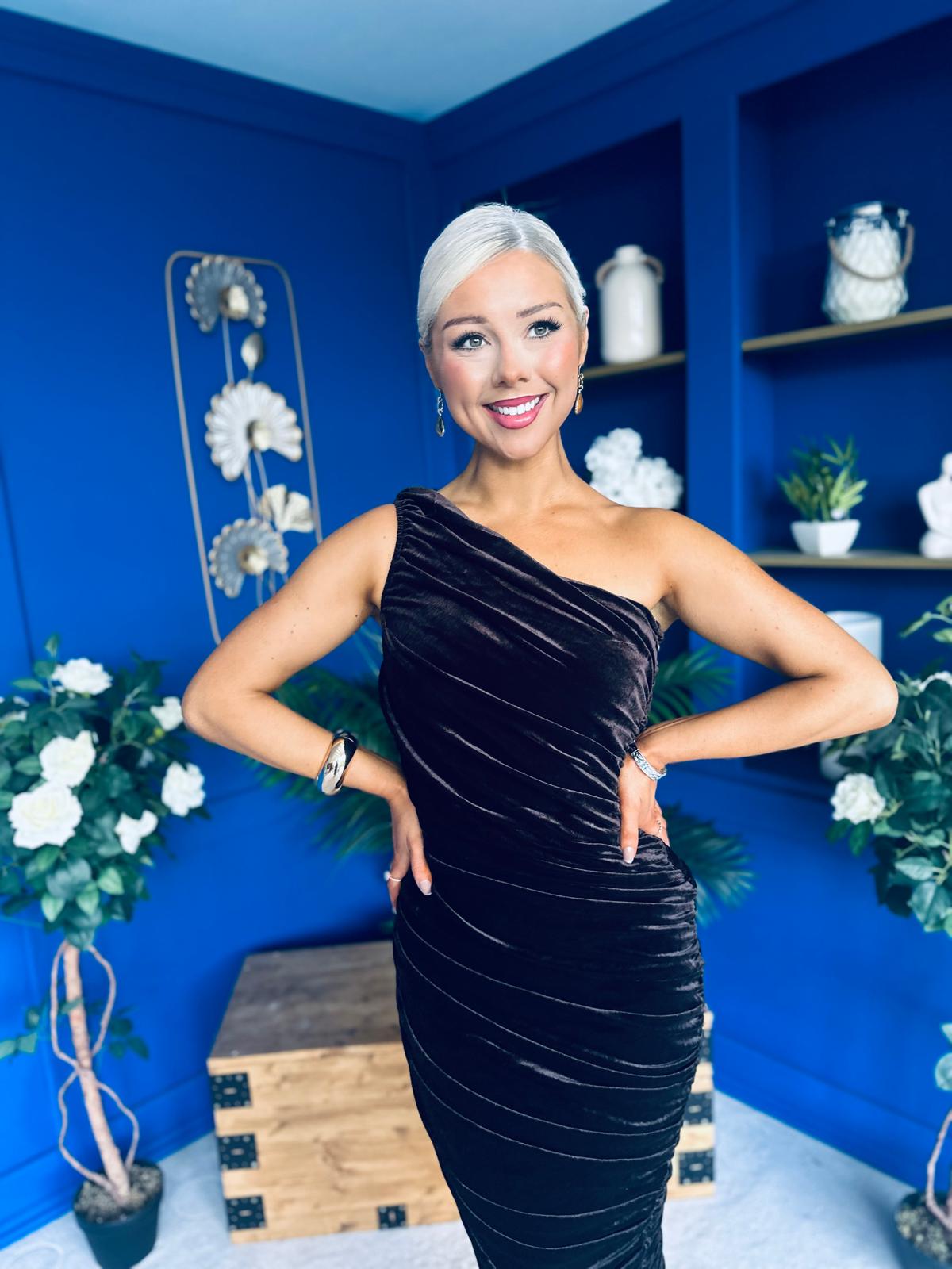 Our Chocolate Velvet One Shoulder Ruched Midi Dress is perfect for showing off your curves.