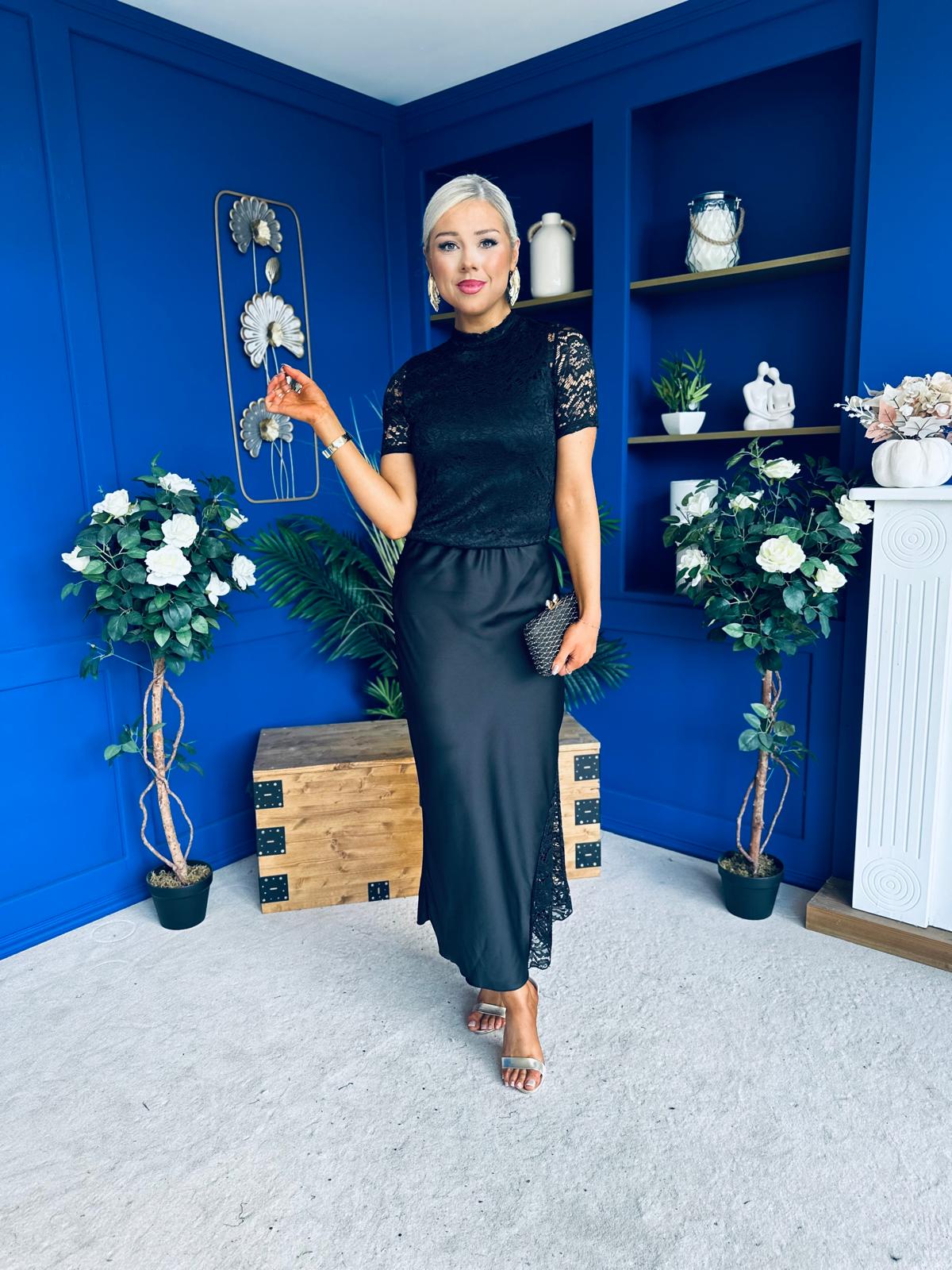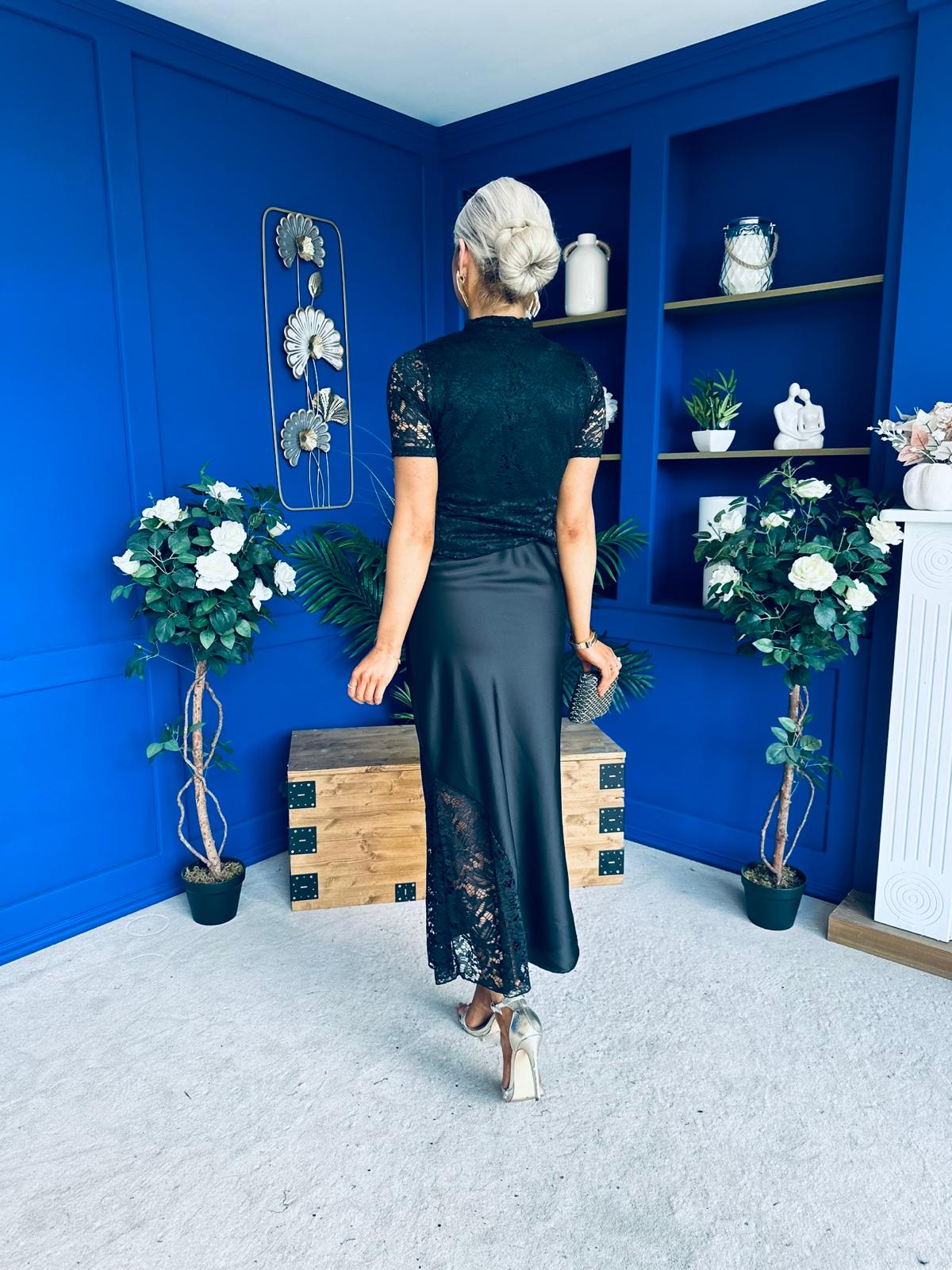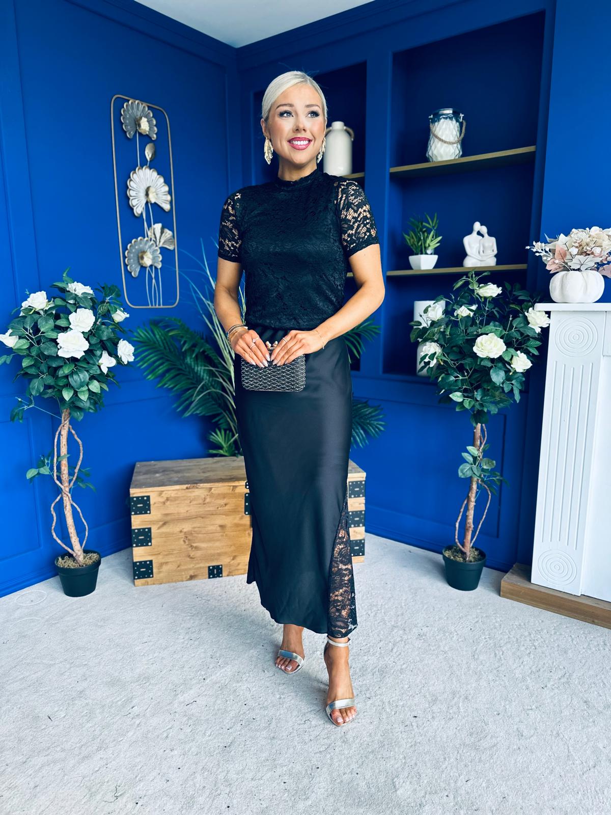 The matching skirt, with elasticated waist, comes in a soft flowing satin feel material with matching asymmetric lace detail for a sophisticated and exclusive look