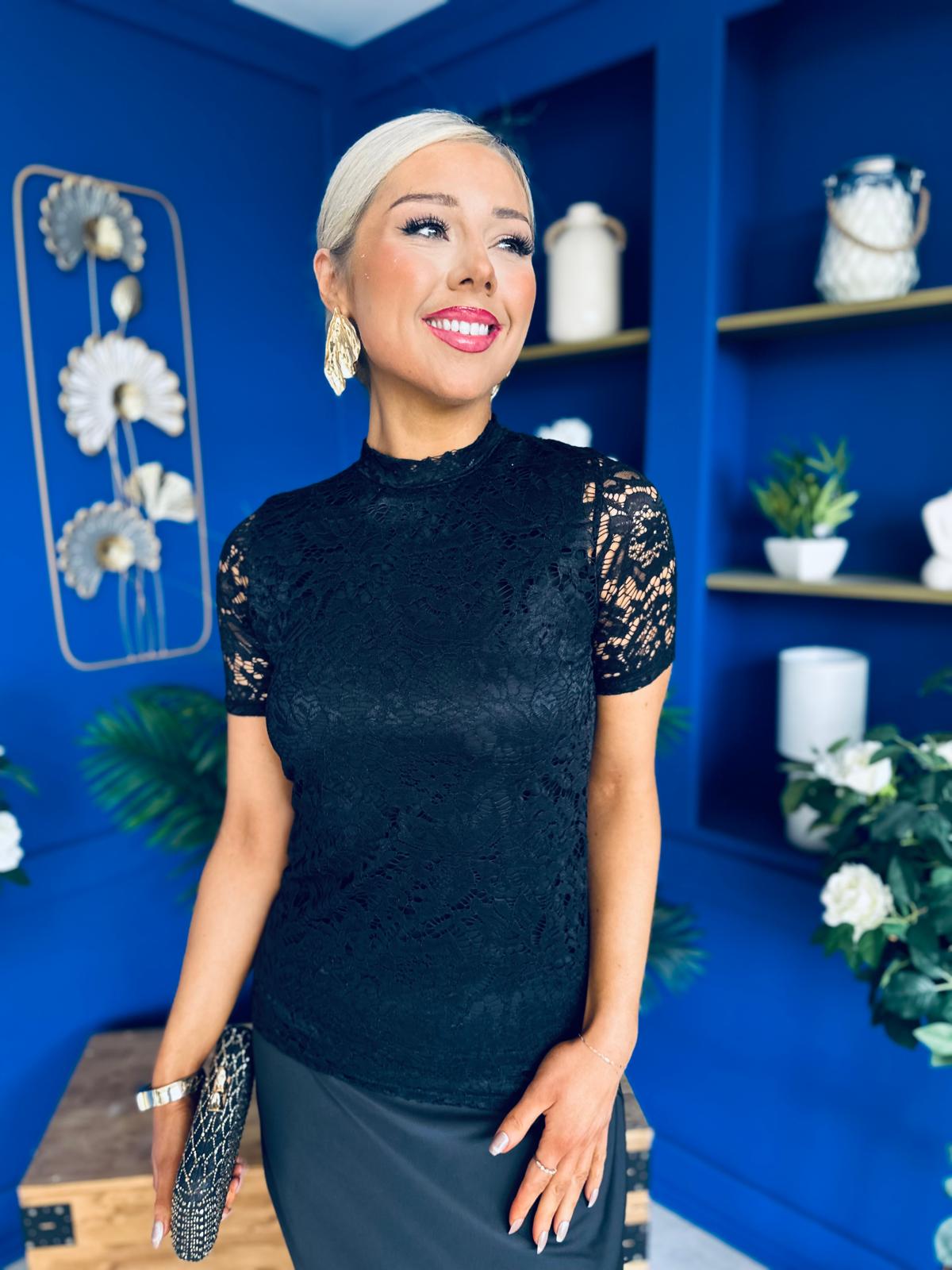 The fabulous top comes in a gorgeous lined lace fabric, with high neck and cap sleeve. Top can be worn inside or out.