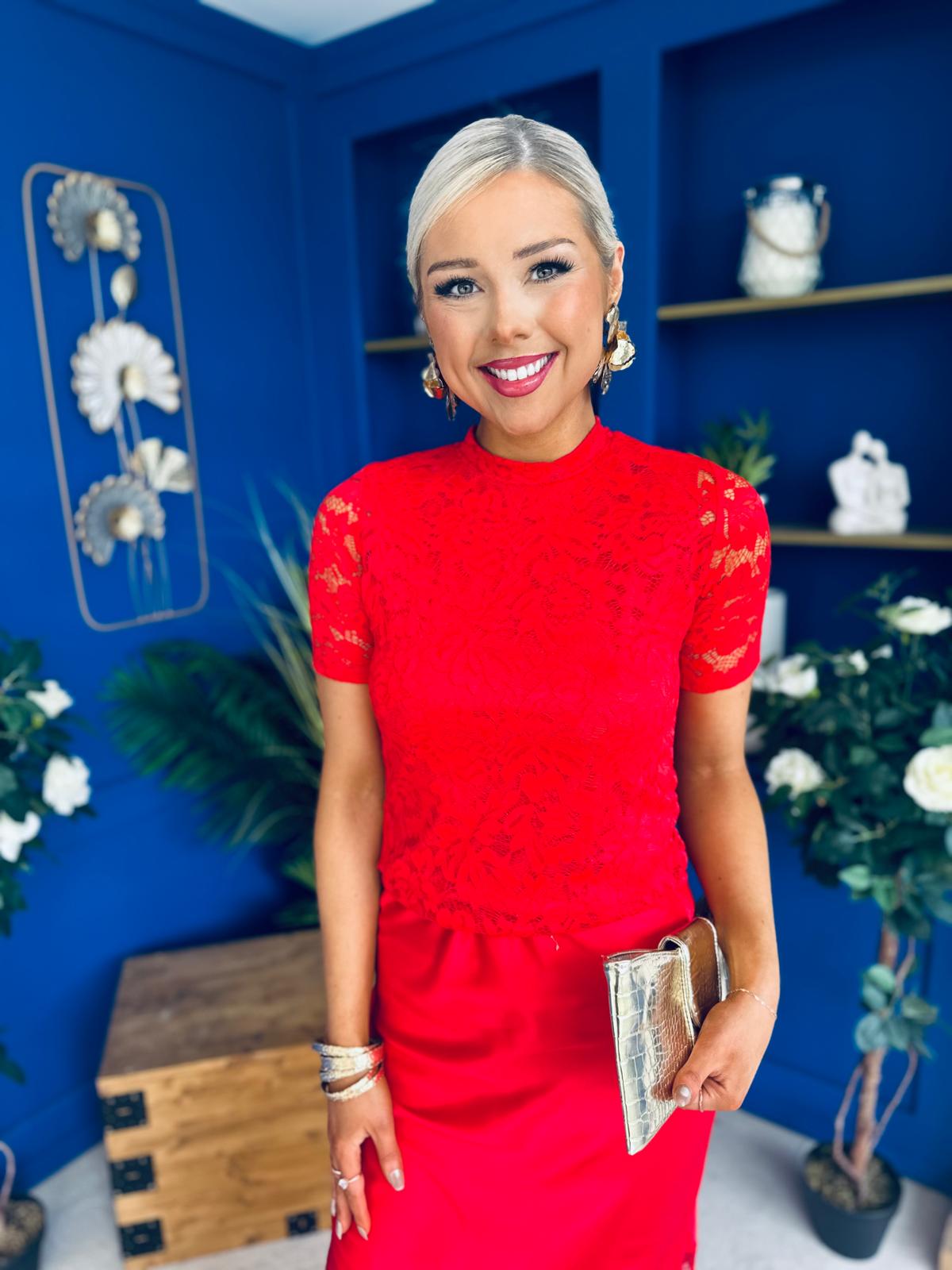 Hollie Detail Top & Satin Skirt Set Red