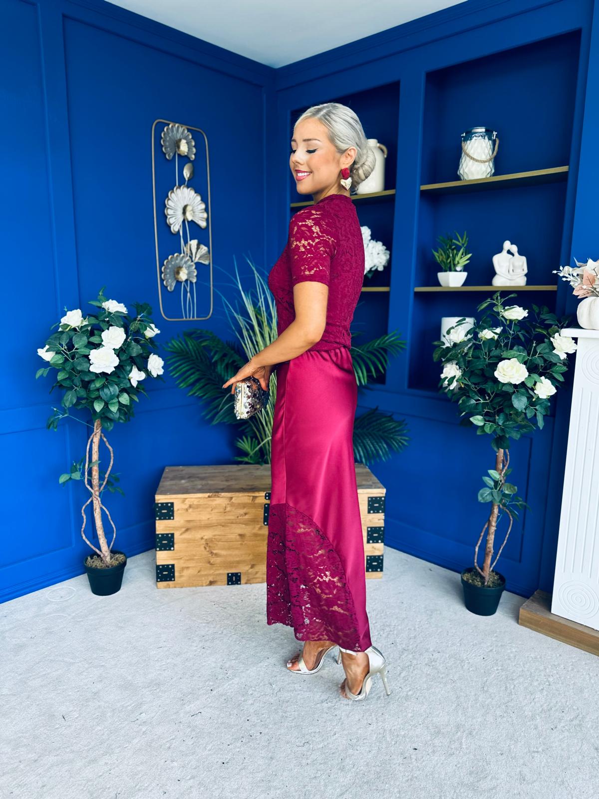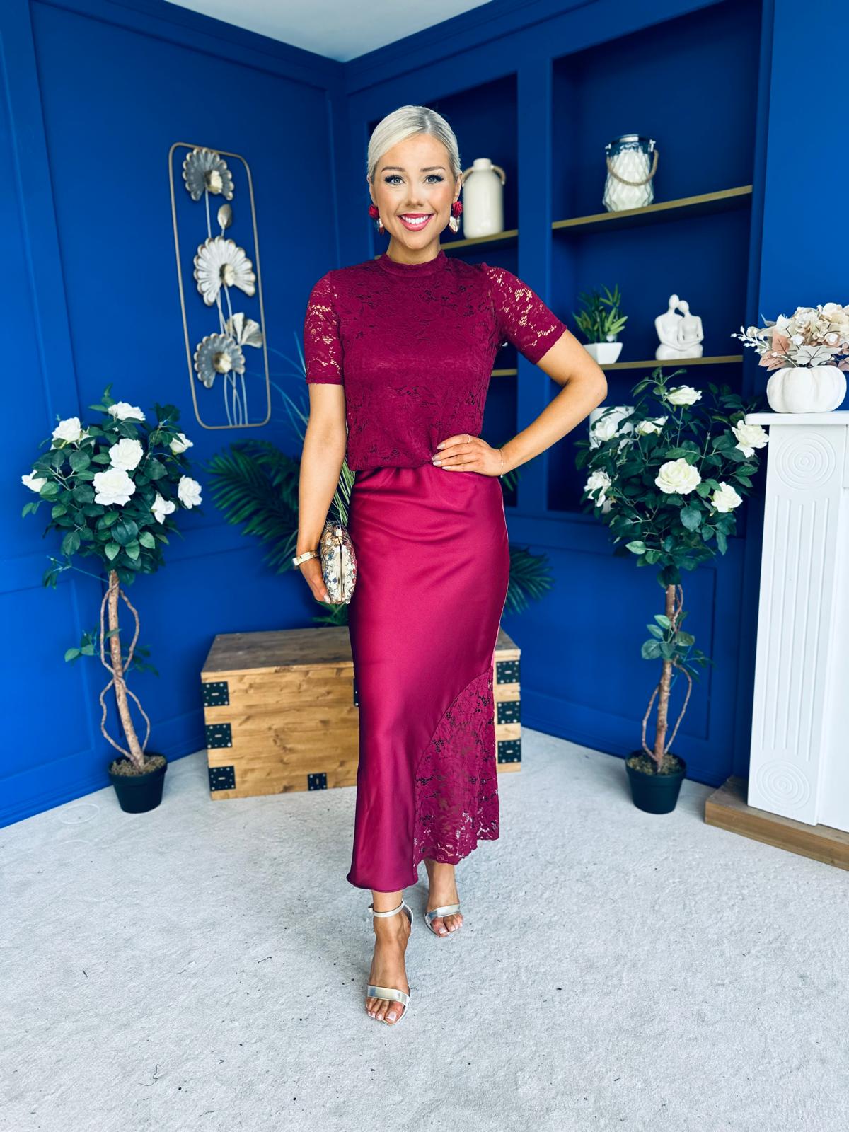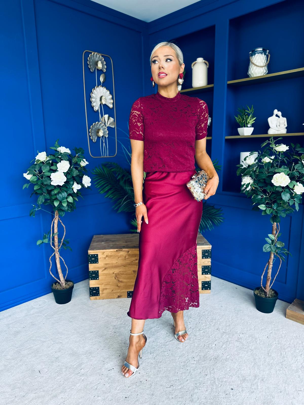 The matching skirt, with elasticated waist, comes in a soft flowing satin feel material with matching asymmetric lace detail for a sophisticated and exclusive look