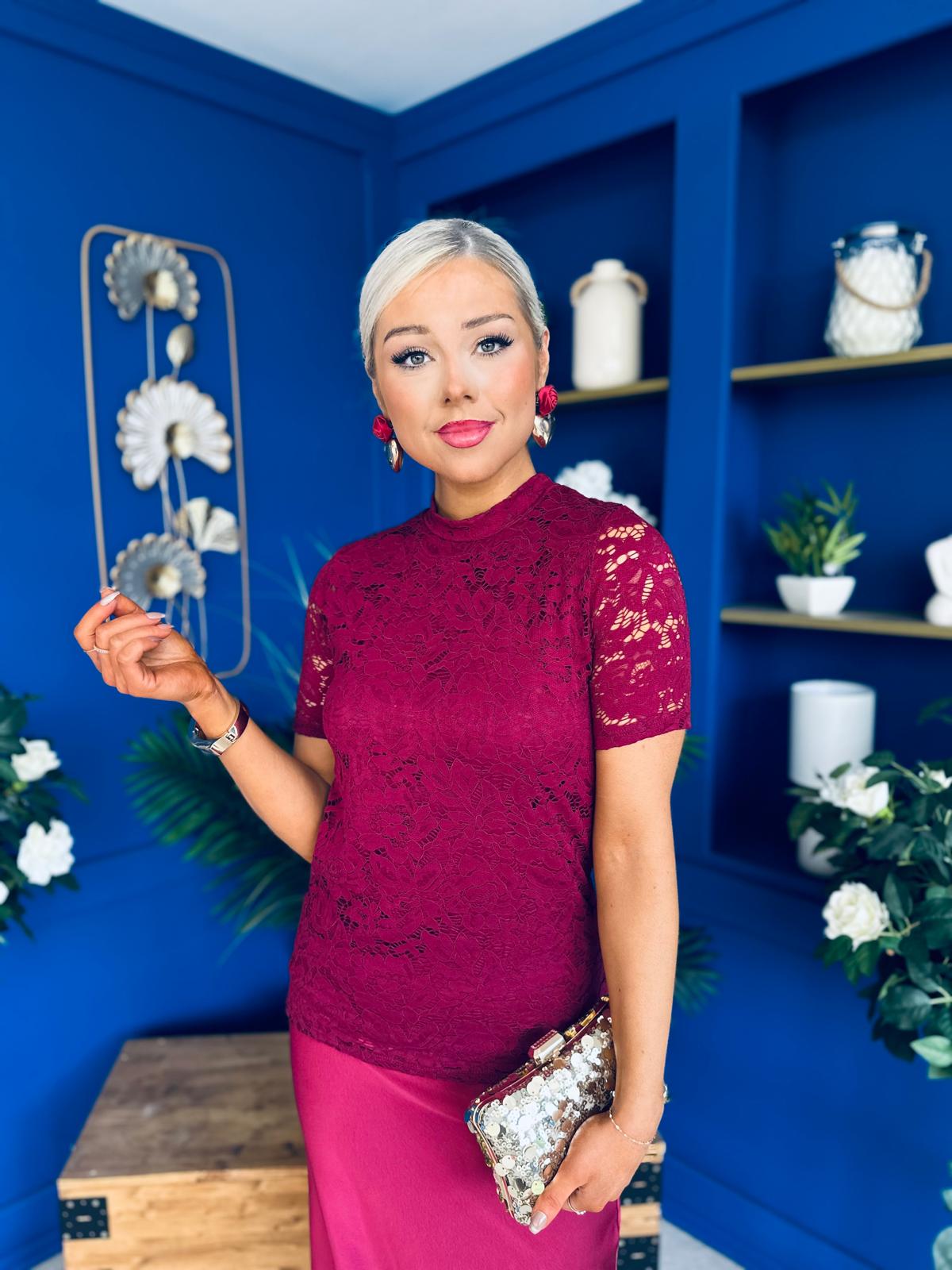 The fabulous top comes in a gorgeous lined lace fabric, with high neck and cap sleeve. Top can be worn inside or out.