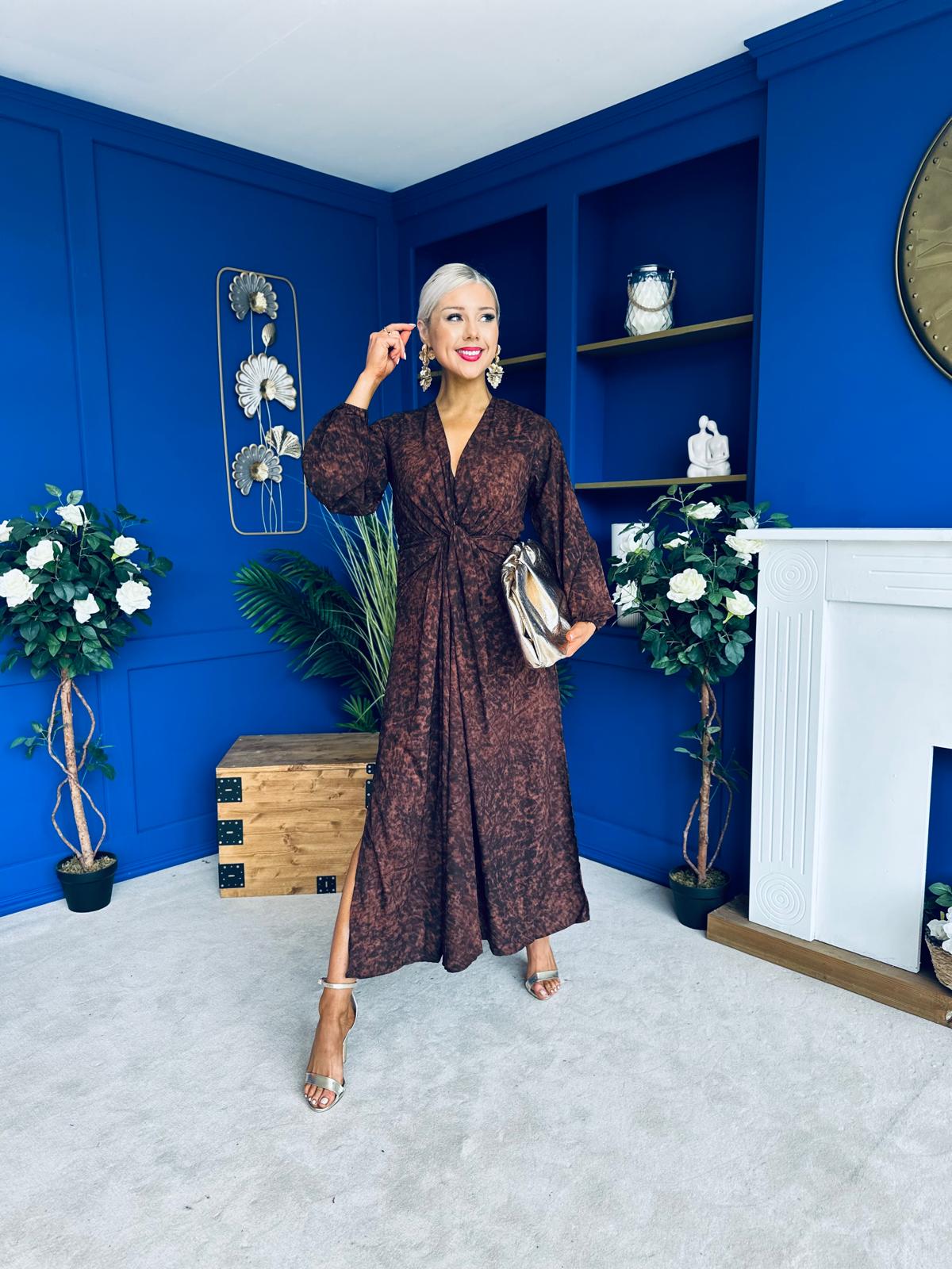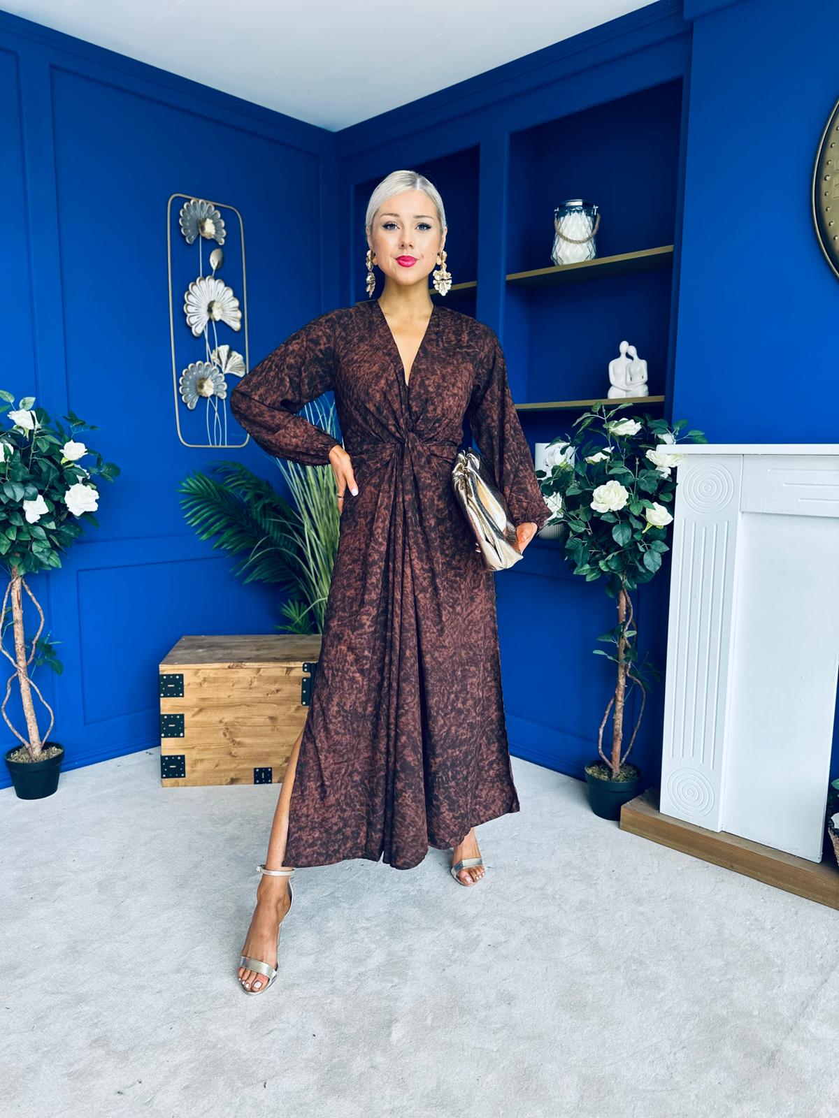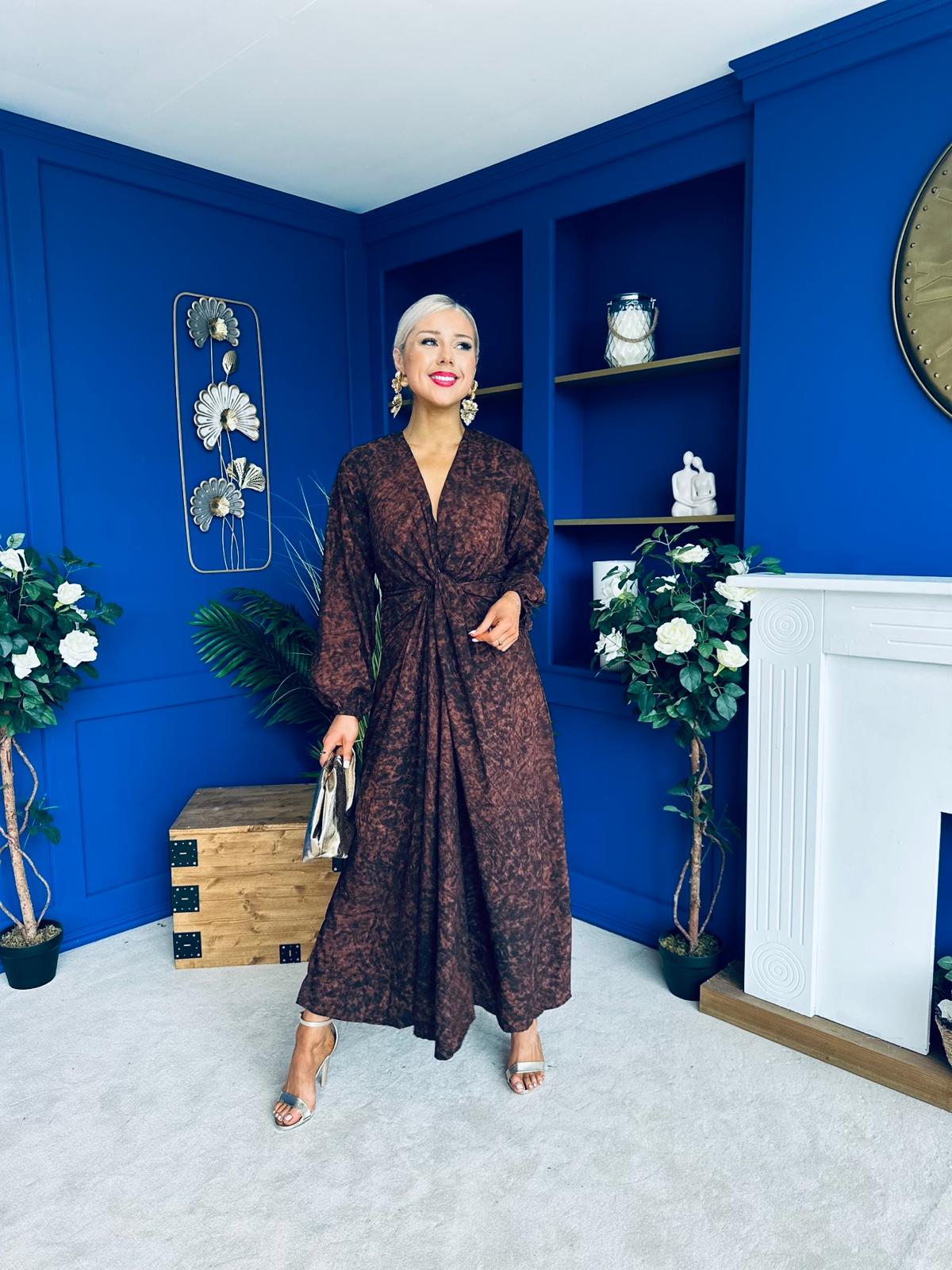 Its dramatic style, wrap V neckline & full sleeve with knot detail midriff and flowing skirt create a stand out look