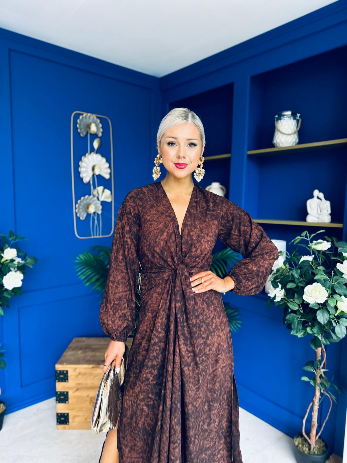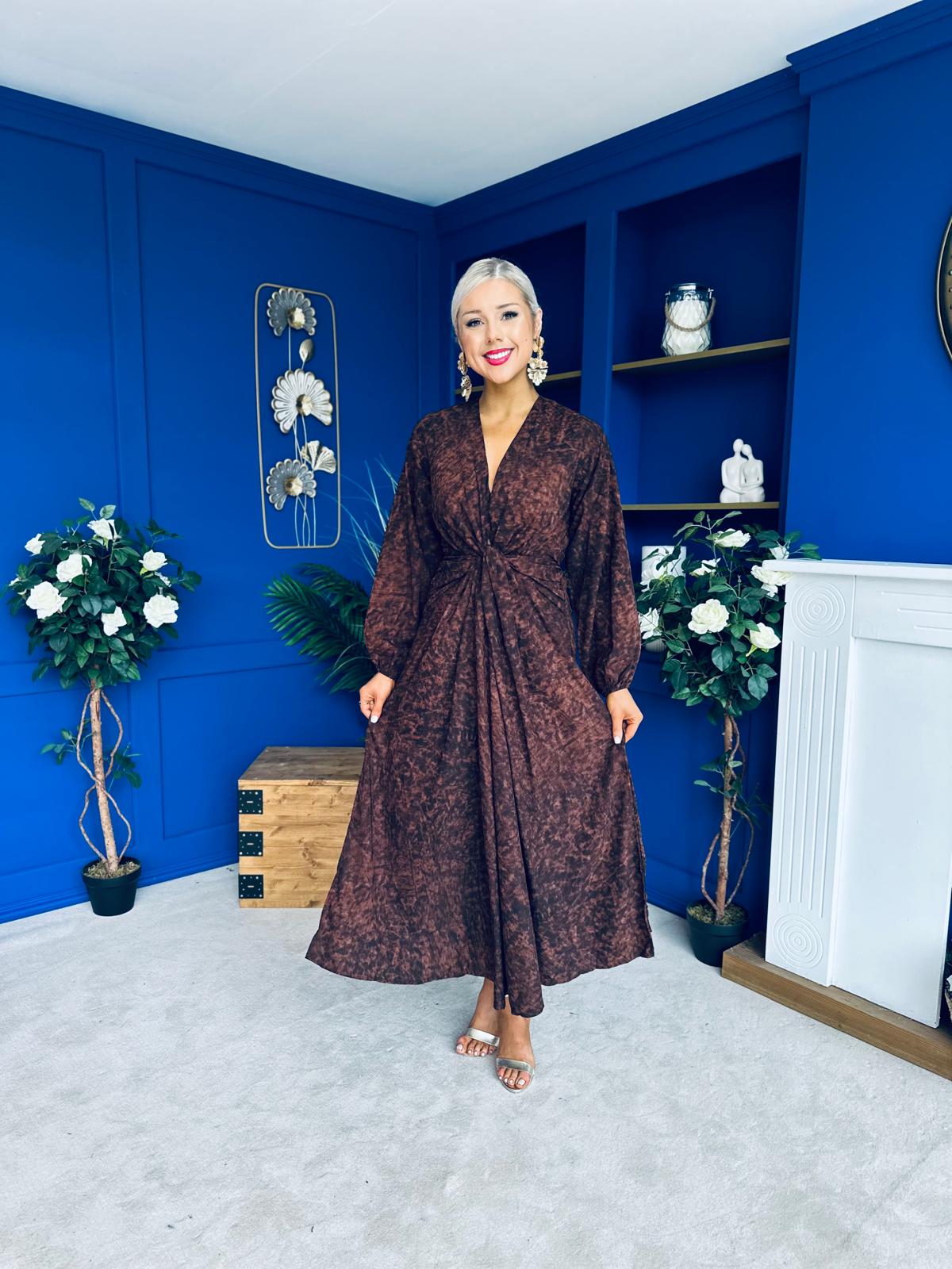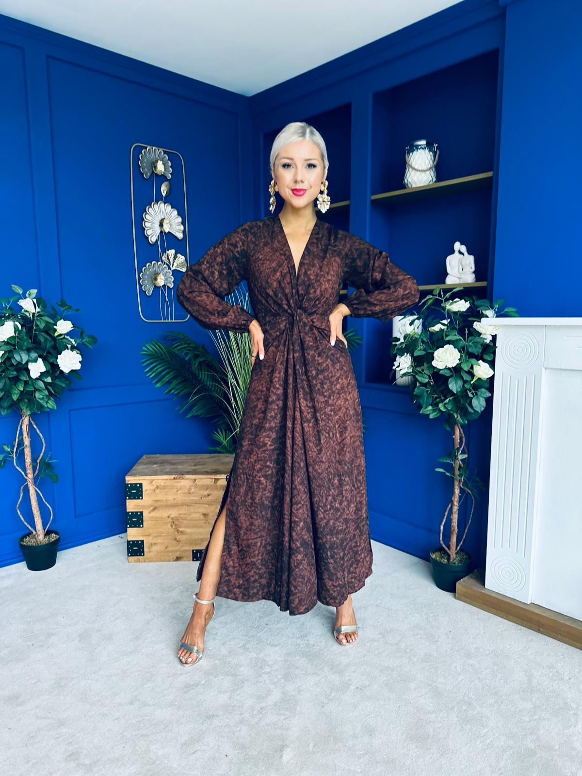 Its dramatic style, wrap V neckline & full sleeve with knot detail midriff and flowing skirt create a stand out look