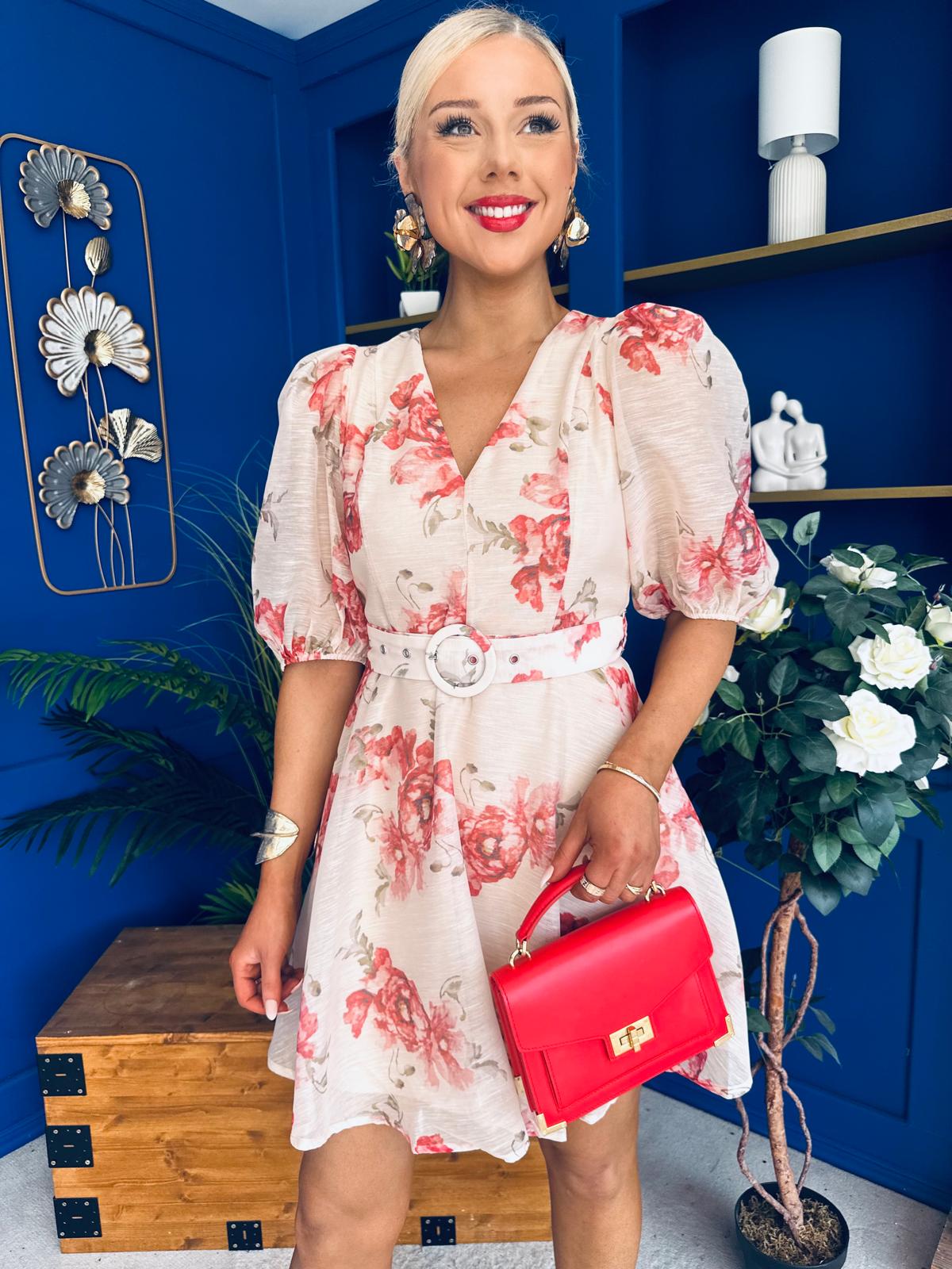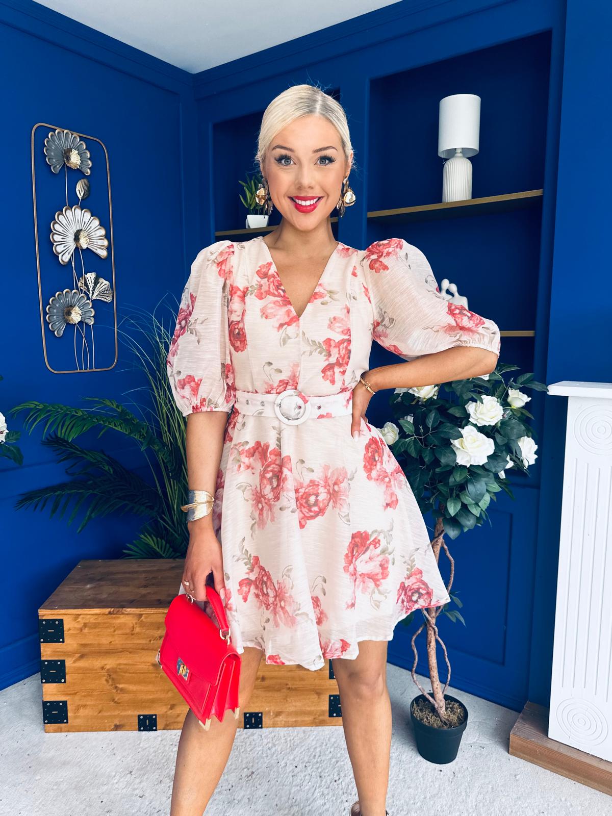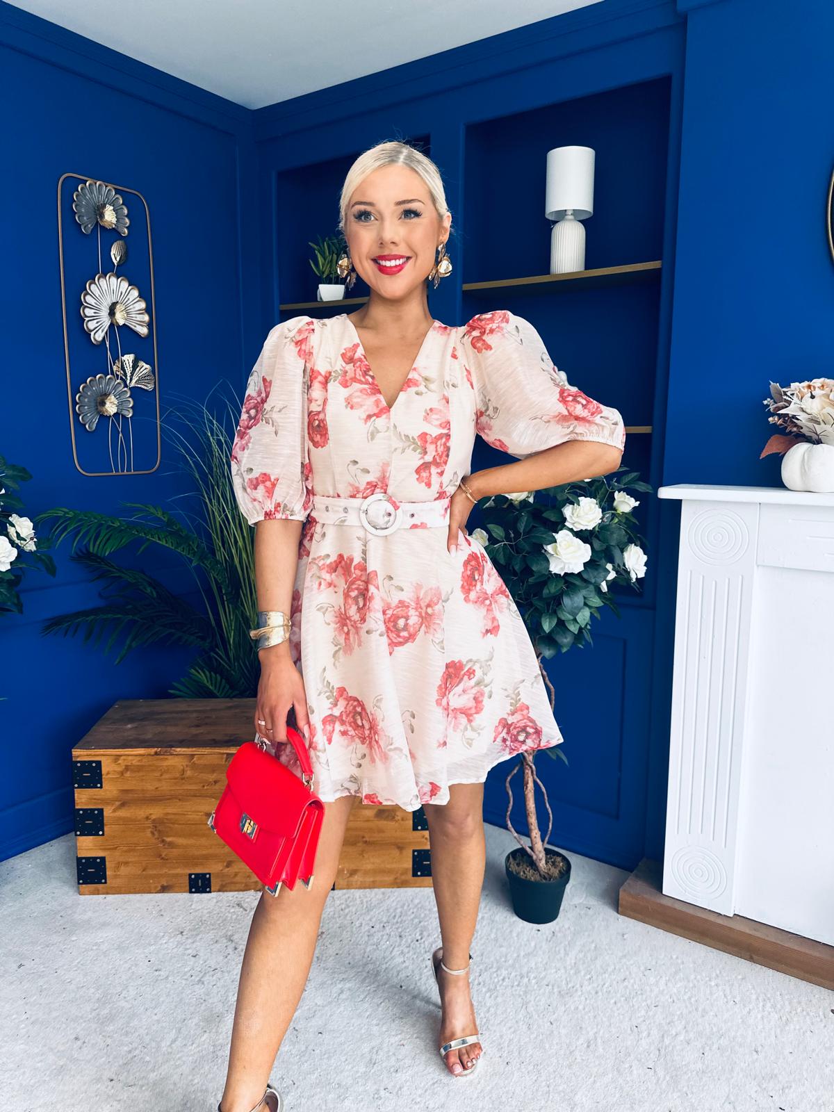 Elevate your wardrobe with the Indianna Belted Mini Dress in a stunning floral design.