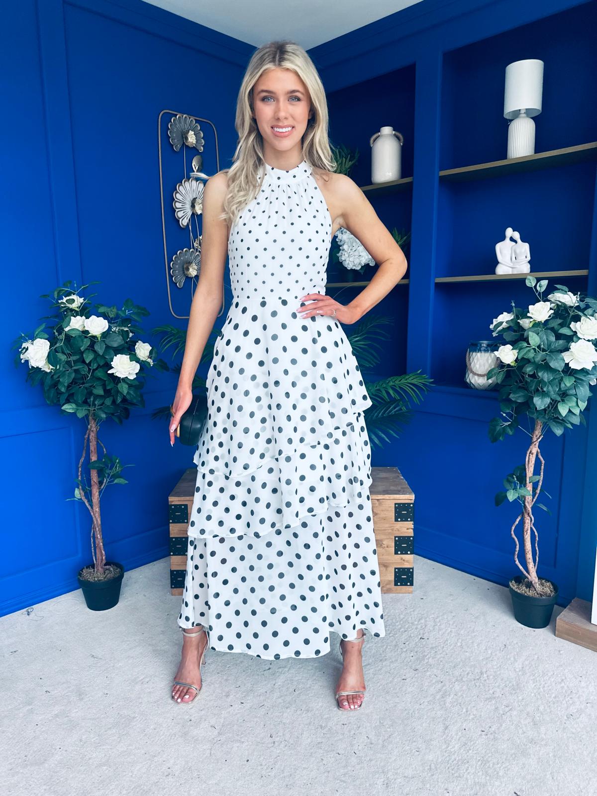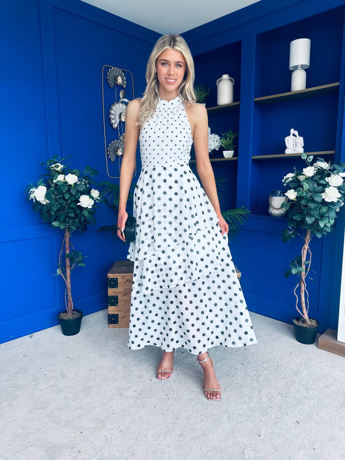 Finished in a chic spot print, this maxi dress transitions effortlessly from special occasions to sophisticated nights out.