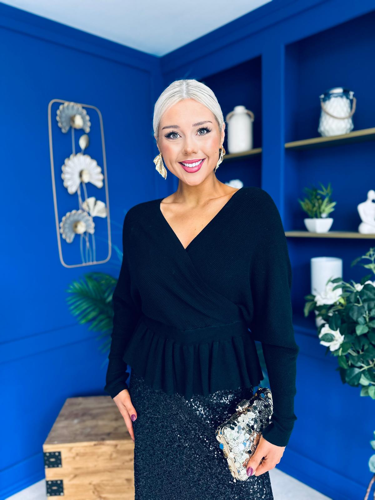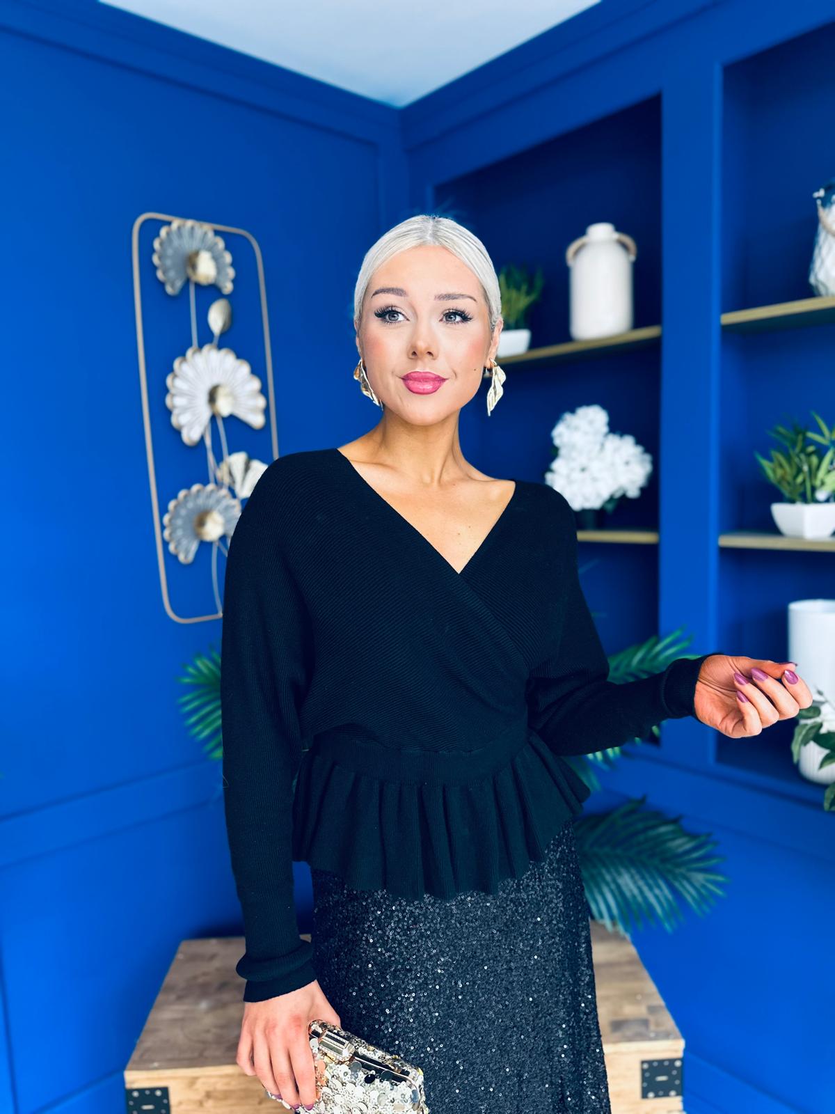 Super soft knit material jumper with cross over neckline, detailed sleev & hem with open back detail.