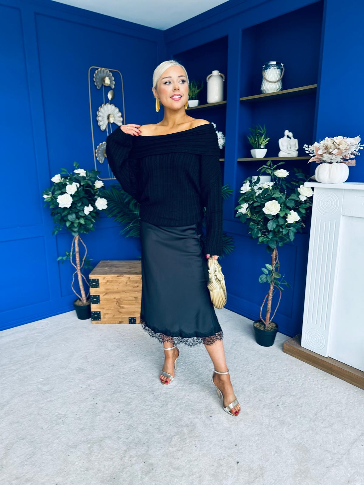 Jade Detailed Satin Midi Skirt Black