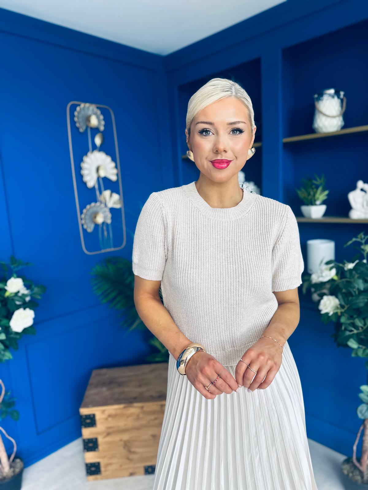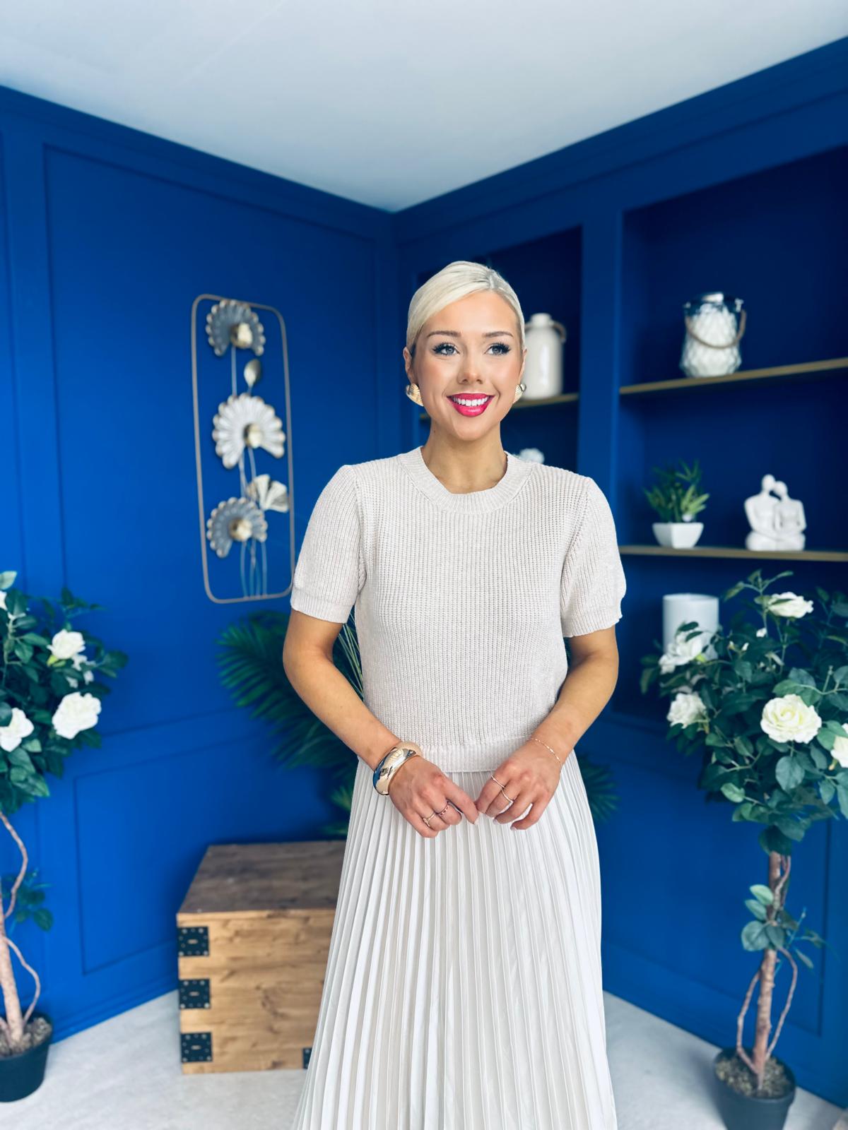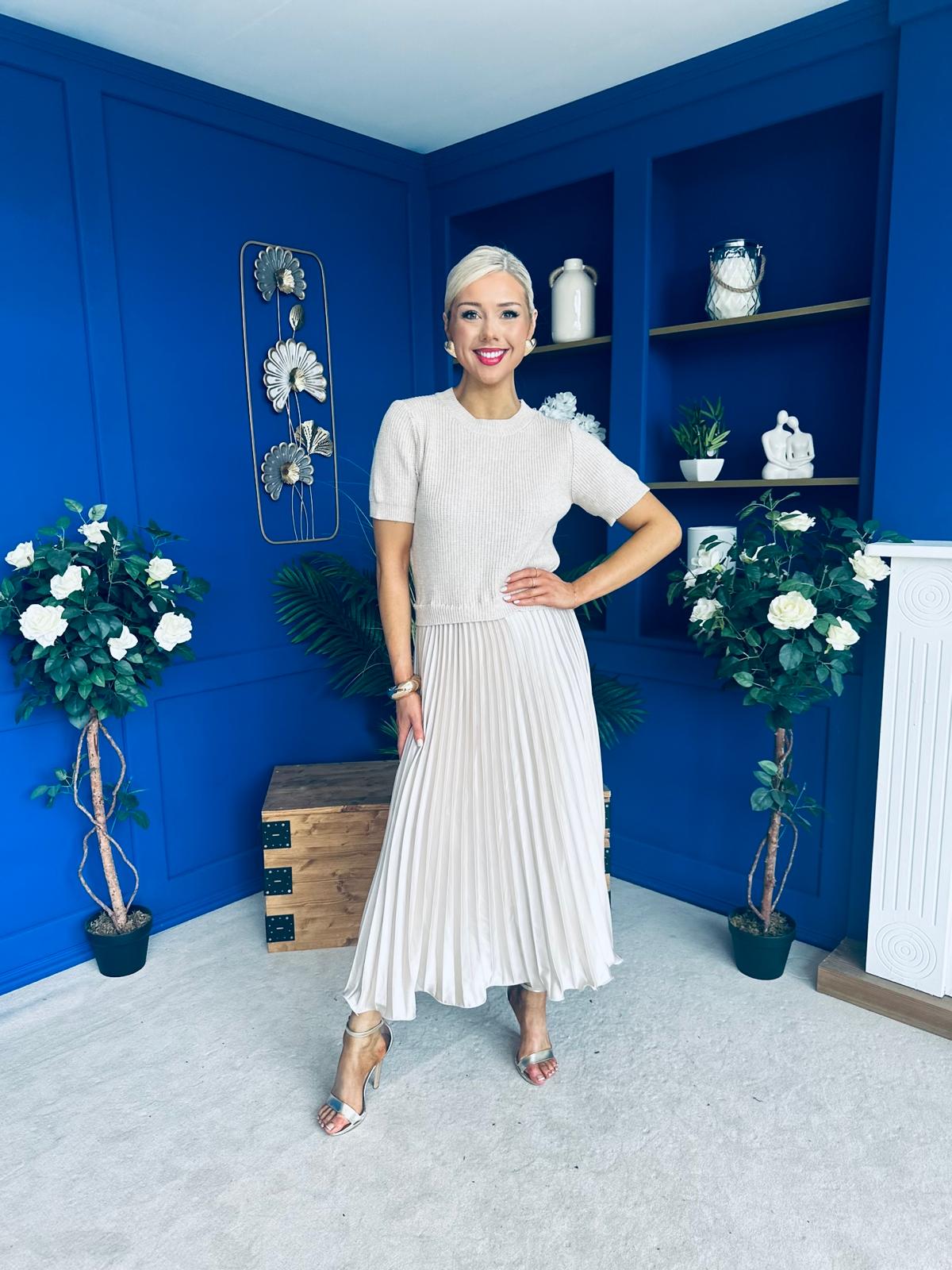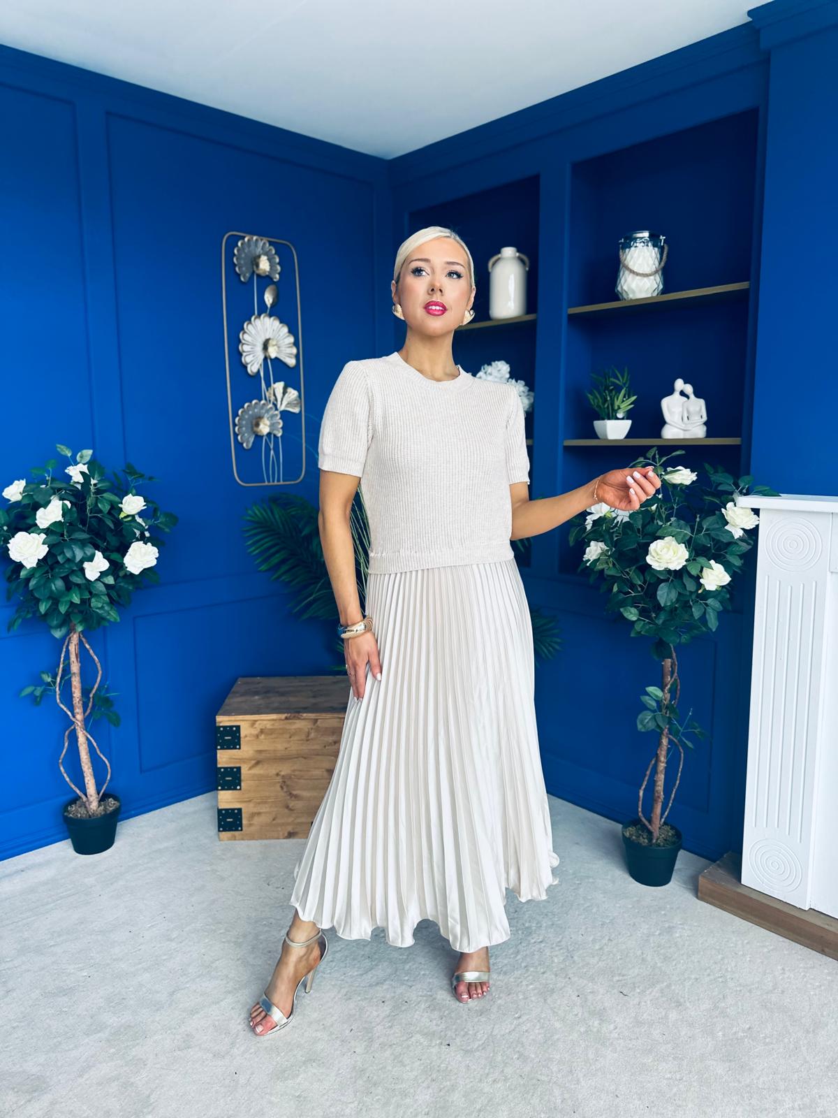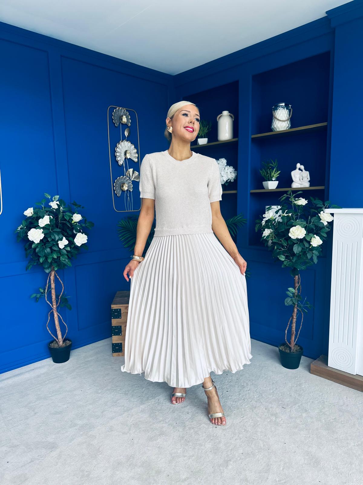 With a wonderful knit 1/2 sleeve top & the most epic pleated satin like skirt, this dress is sure to catch the eye