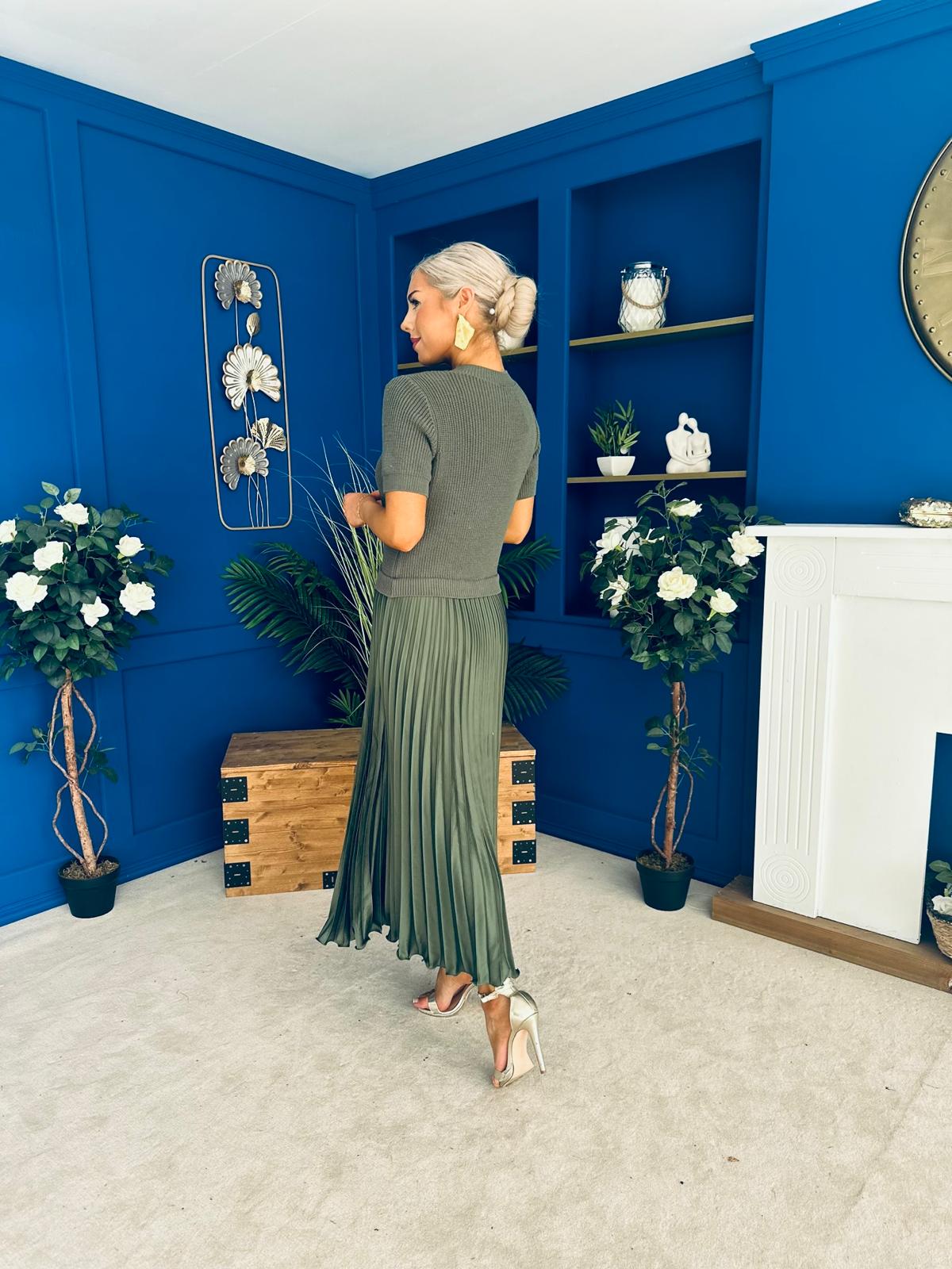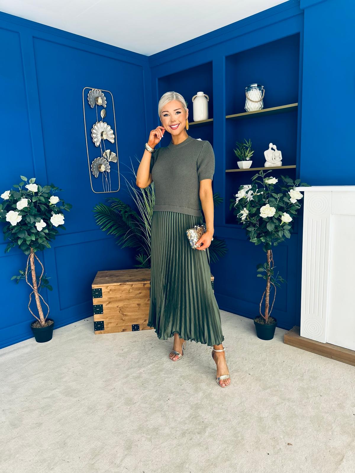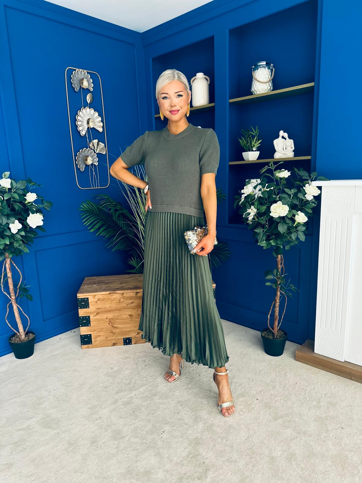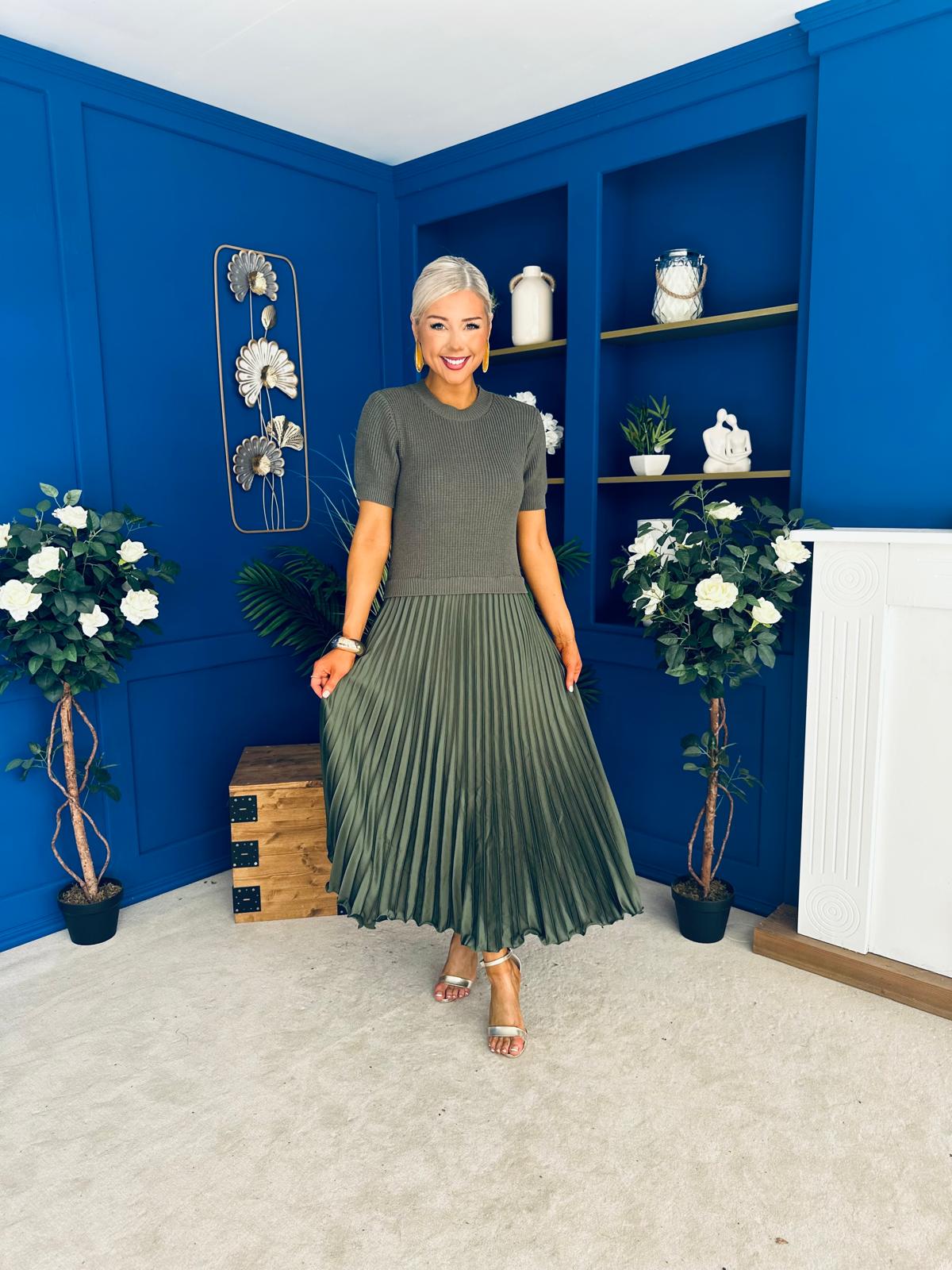 With a wonderful knit 1/2 sleeve top & the most epic pleated satin like skirt, this dress is sure to catch the eye
