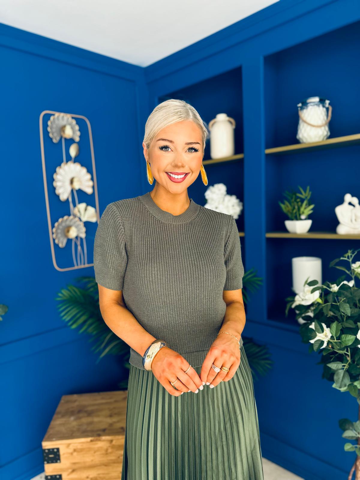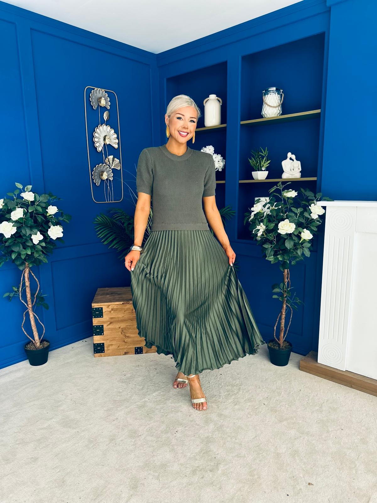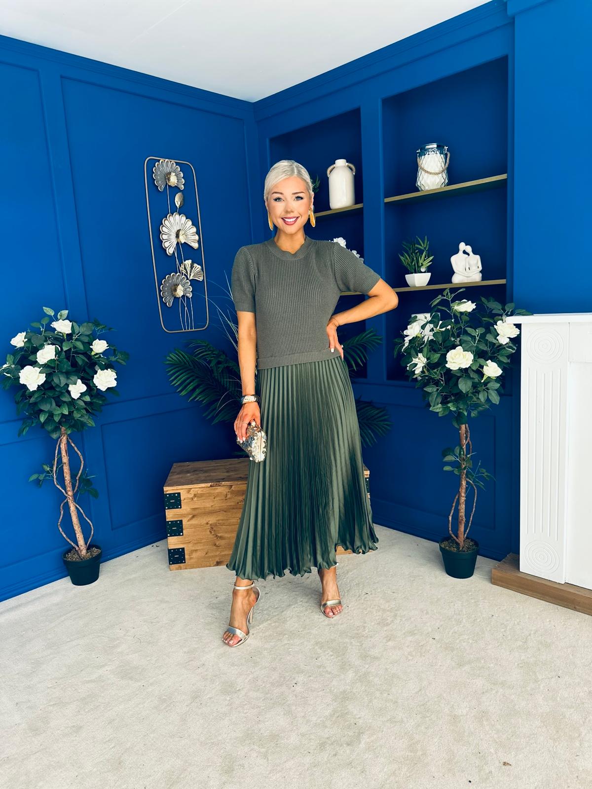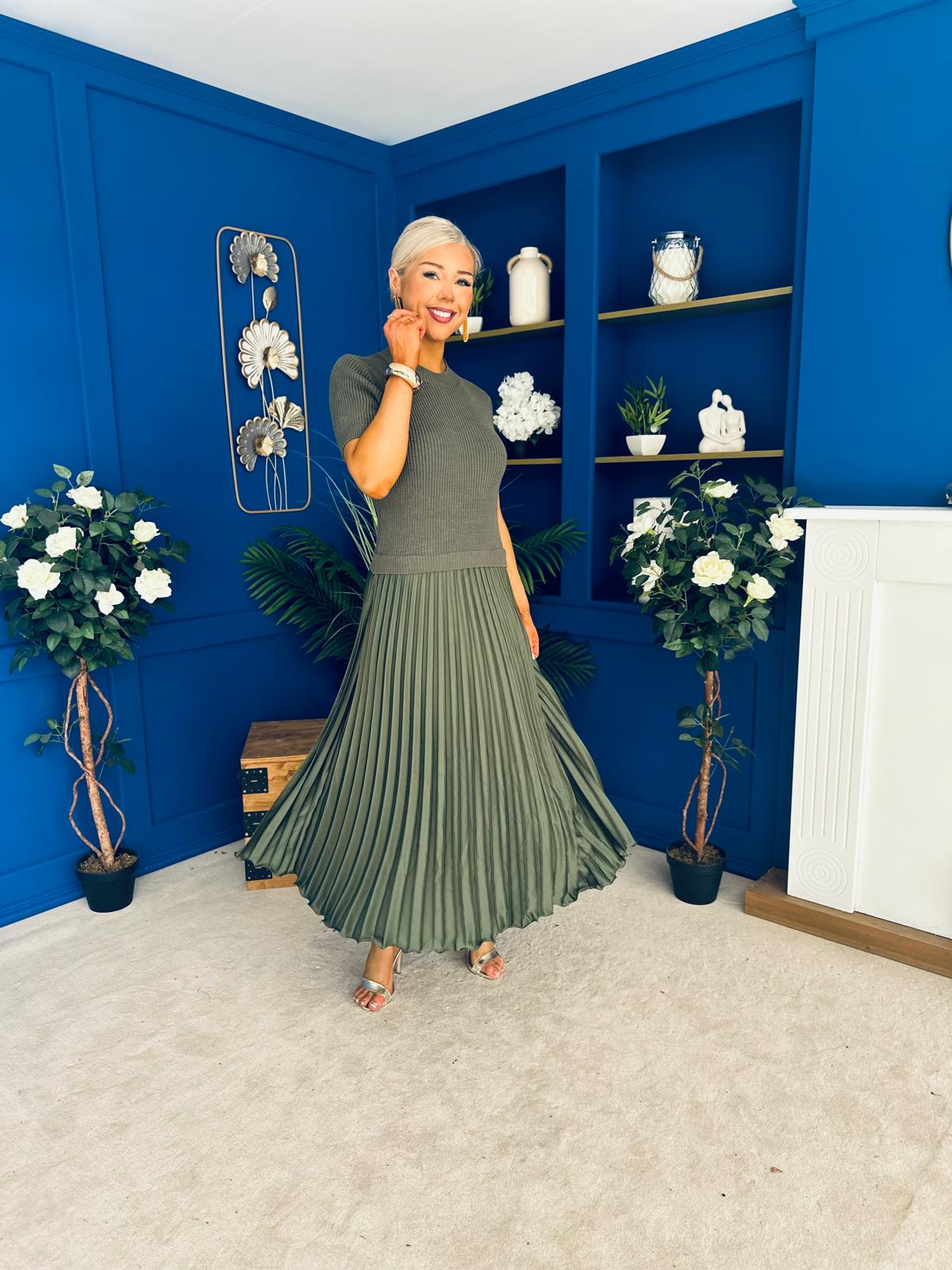 With a wonderful knit 1/2 sleeve top & the most epic pleated satin like skirt, this dress is sure to catch the eye