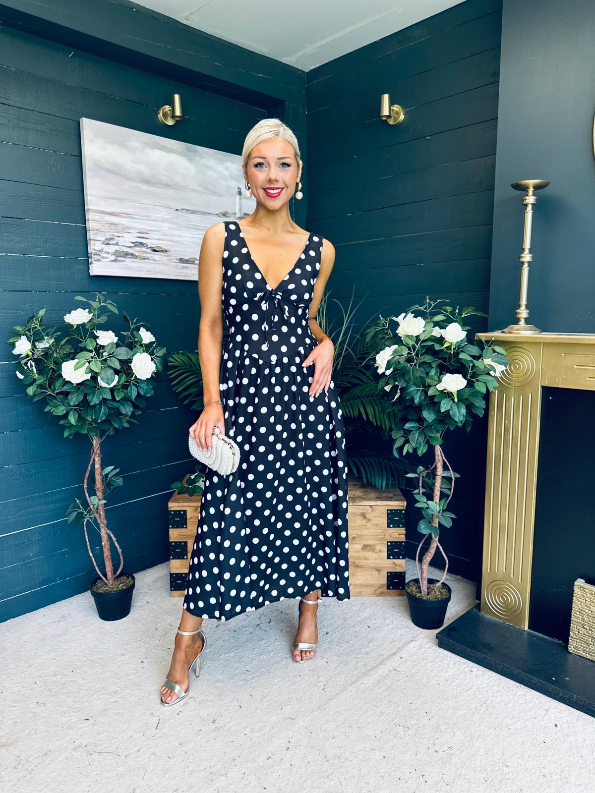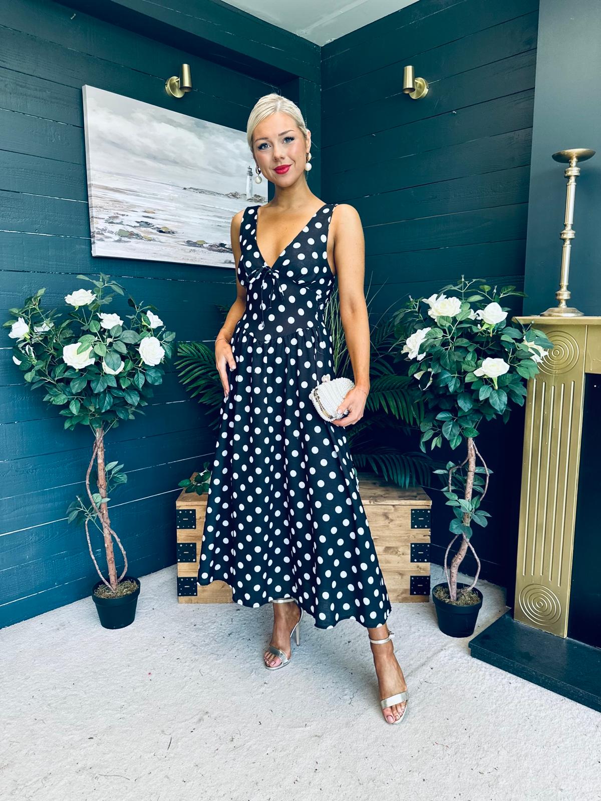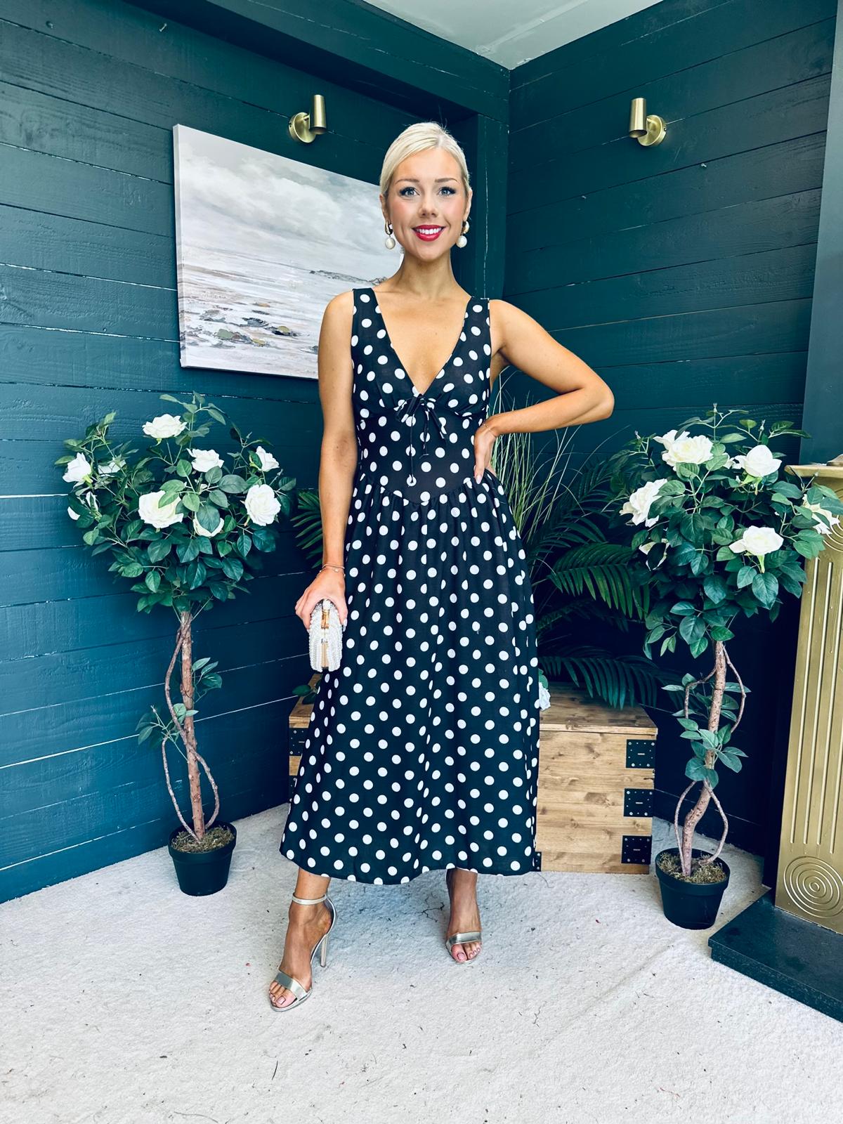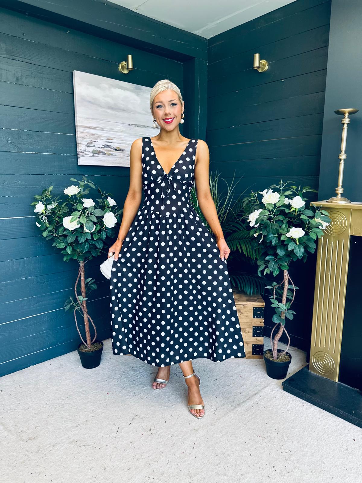 This dress comes in the most amazing polka fabric with beautiful neckline, banded midriff with a hint of drop waist detail, elasticated back to cinch and flowing skirt to flatter
